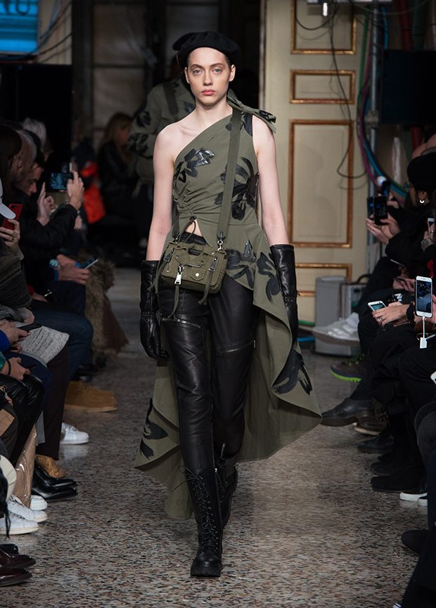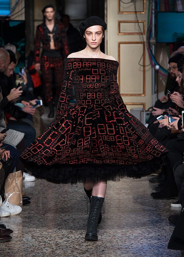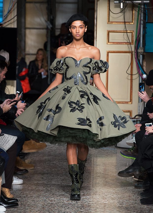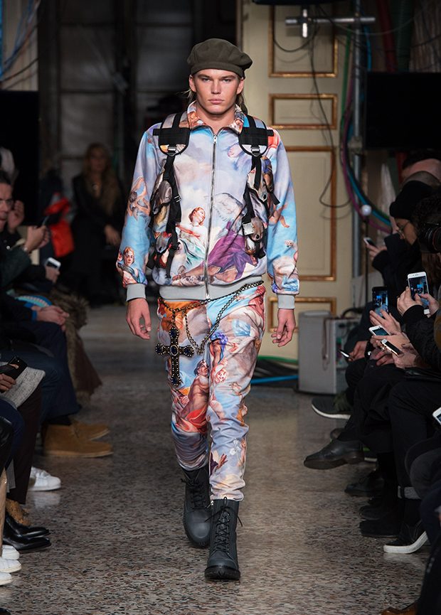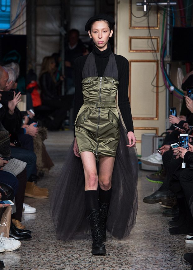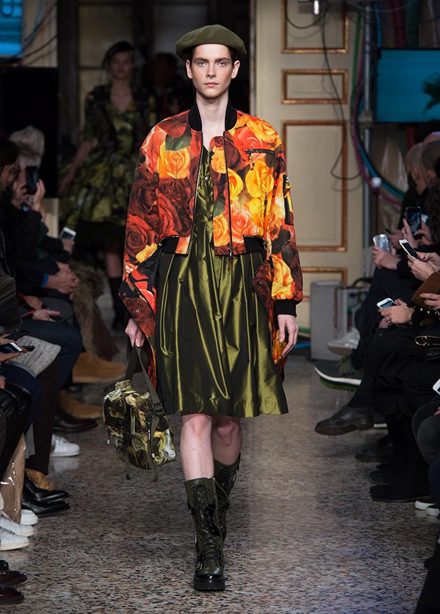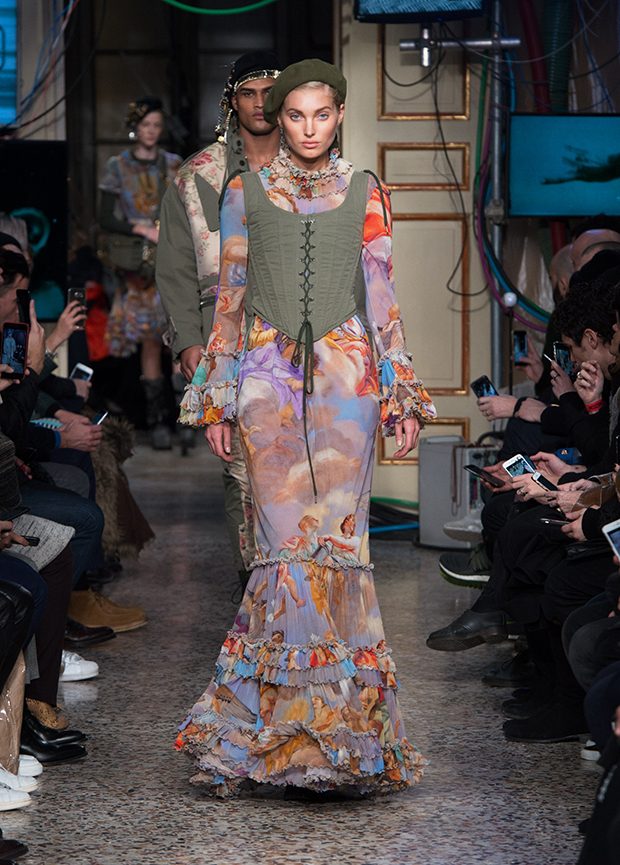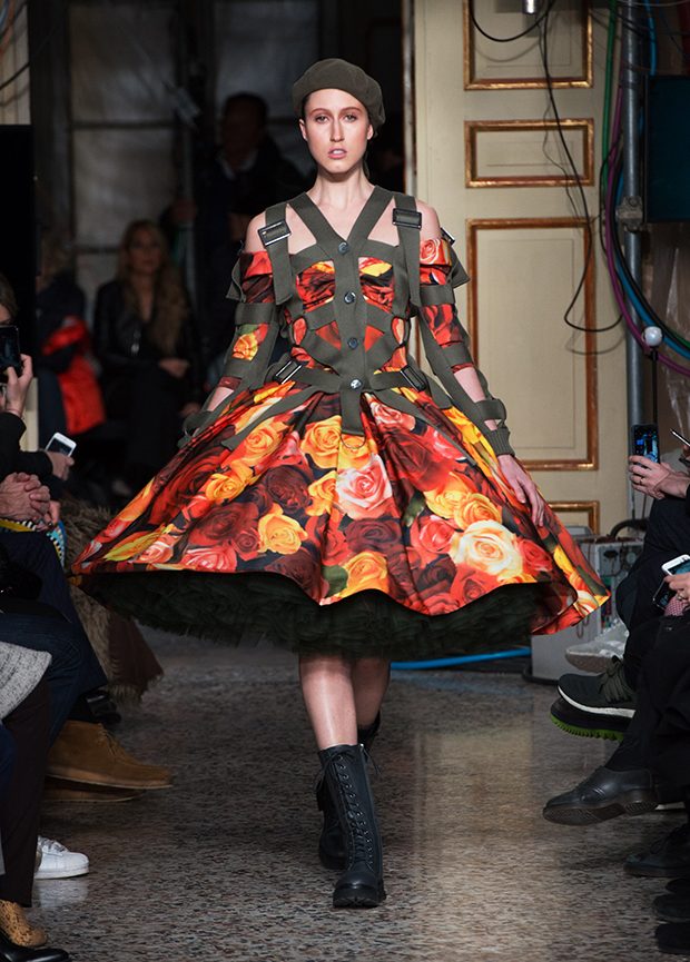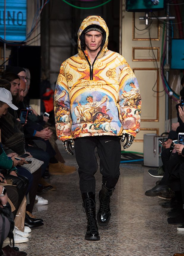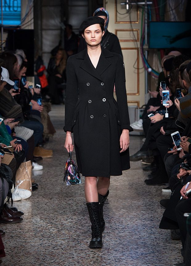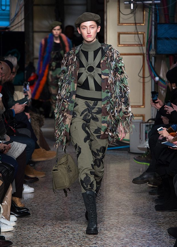 The place: an ancient palazzo. The time: an indeterminate future. The collection: a curated clash between dystopia and hope presented by Moschino designer Jeremy Scott. For Pre-Fall and Menswear Fall/Winter 2017 we are on a mission. The models emerge into the scarlet glow of digital clocks set to countdown. The collection is half artful collision, half meaningful division. The baseline uniform is military. Olive cotton drill and parachute silk are issued as jumpsuits, elongated MA1’s, field jacket skirts, and camouflaged combat separates. These are worn alongside webbing harnesses, combat boots and cavalry boots. Ripcords provide ruche and gather, a hooded wind-cheater is deployed as a ruffled dress, and that camo’s color-scheme is twisted from you-don’t-see-me to oh-please-do: but this much more than a by-the-numbers subversion of military gear. – from Moschino