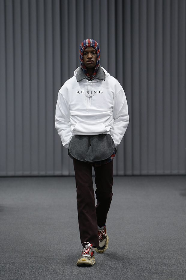 The collection features loose and boxy suits, matched with unbuttoned shirts, oversize coats with signature exaggerated shoulders, wide and long trousers, as well as Balenciaga and Kering logos, printed on sweatshirts and large scarves.