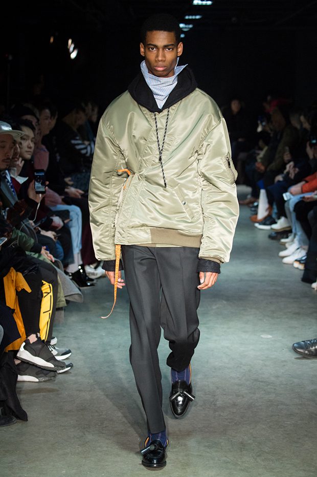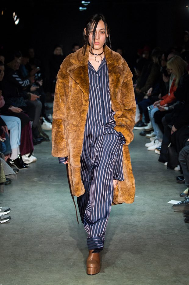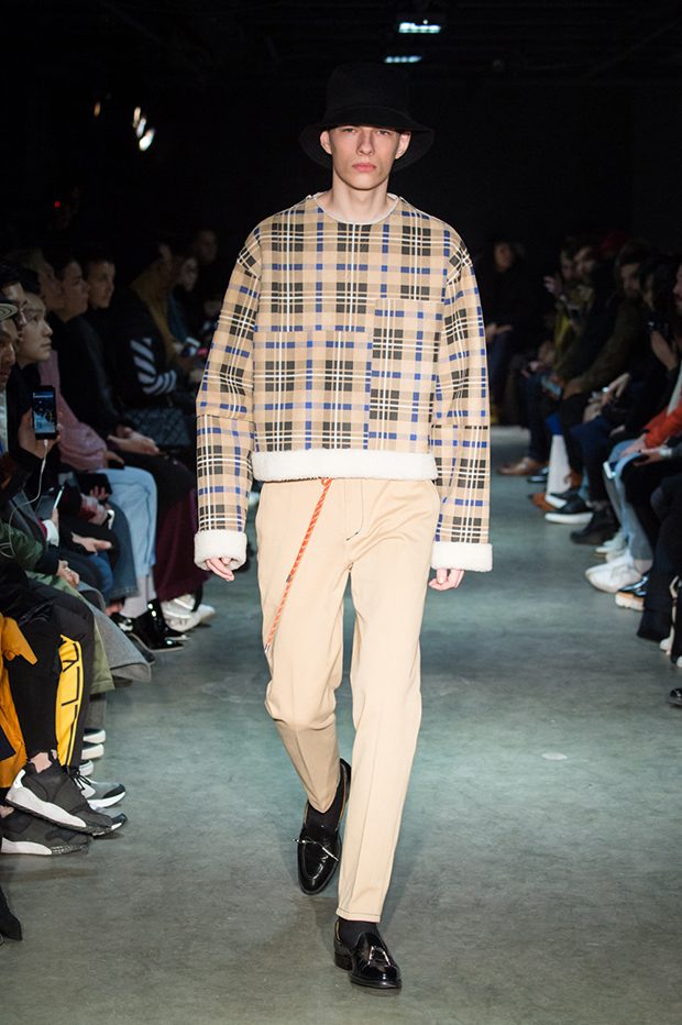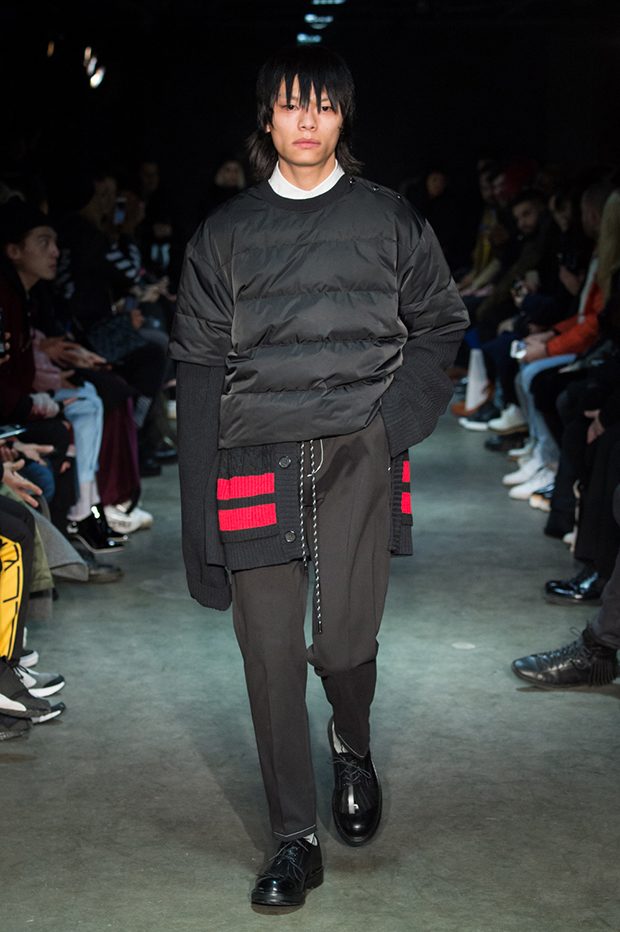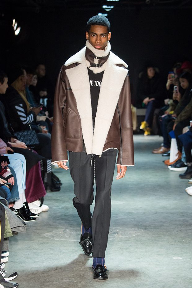 Designer Masanori Morikawa is playing his own musical score, by dissecting and recomposing silhouettes based on classics staples worked through deconstruction and layering. Classic tailored jackets are worn like kimono wrap over t-shirts and striped pajamas or shirts, trench coats are morphing into tunics and army bombers or denim jackets are skinned to expose their inner layers and bone structures. Japanese traditional summer clothing Jimbei is now made with leather, tartan motifs are printed on sheepskin to pay homage to schoolboy look seen through the Japanese prism of precise craftsmanship and Wabi-Sabi philosophy. Words are flashing throughout the collection such as « I Don’t Like Drugs but Drugs likes me » or « Too Fast to Live Too Young to Die », with its literal meanings which Morikawa reminds himself of in today’s society. – from Christian Dada
