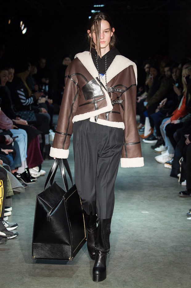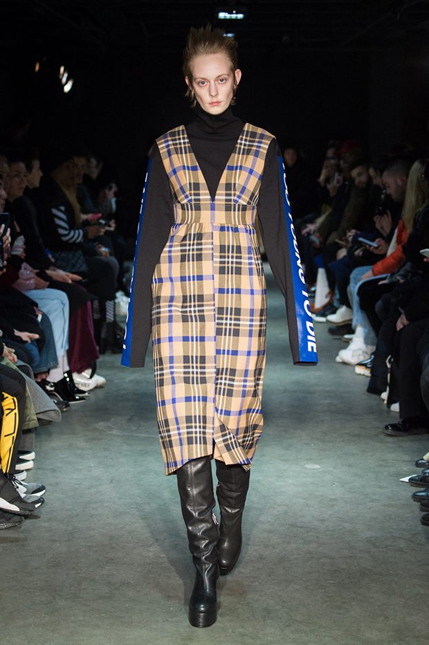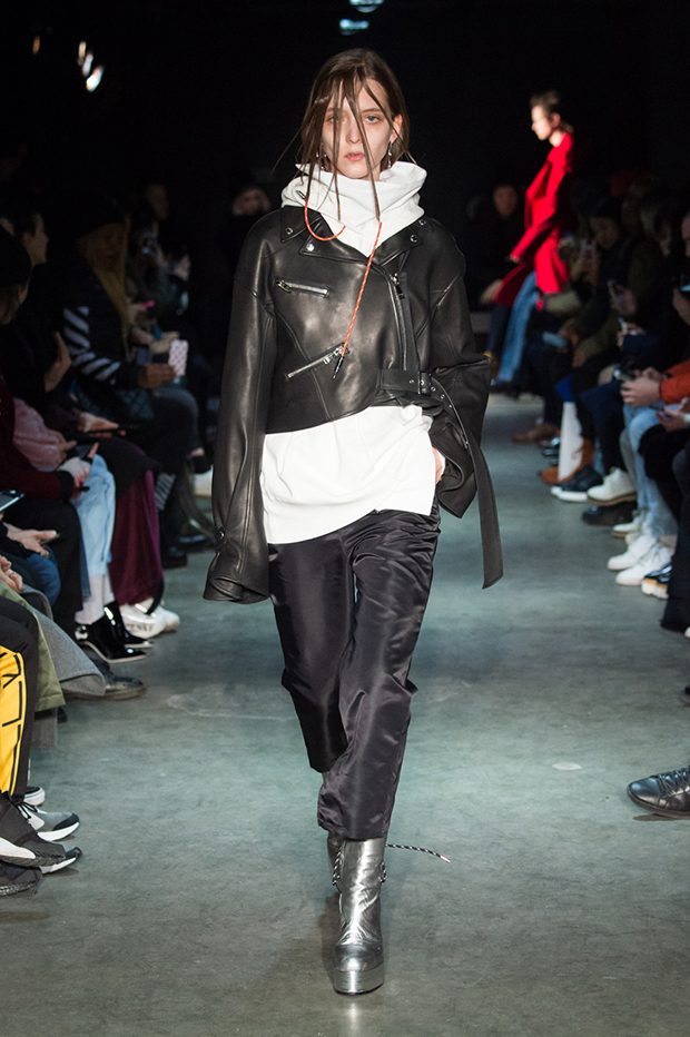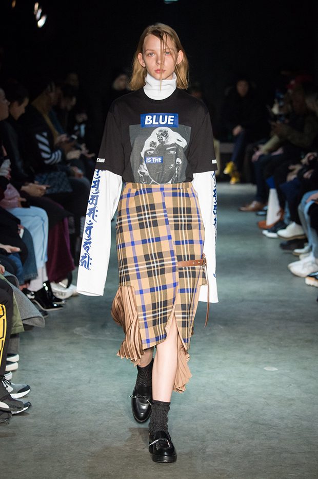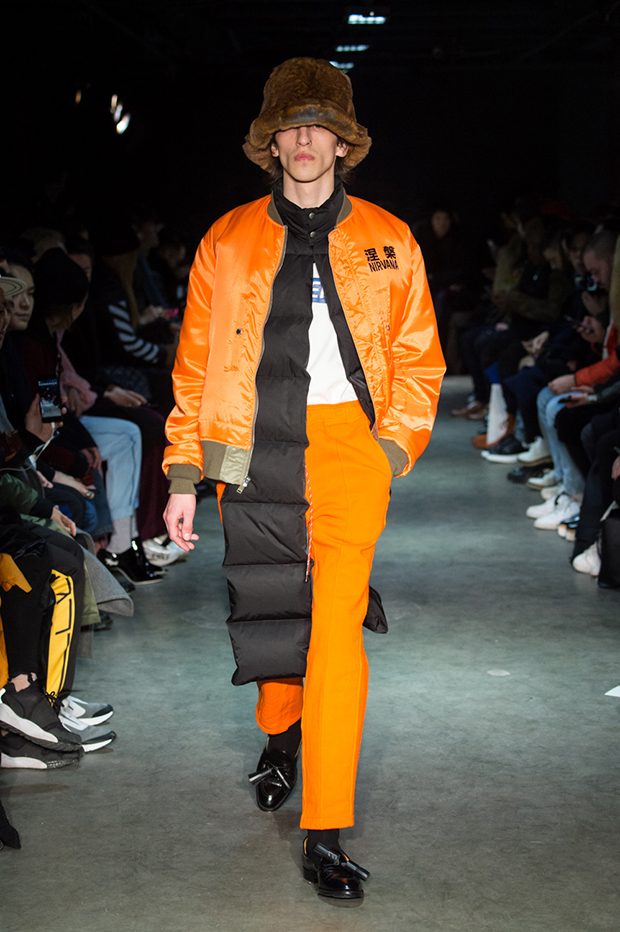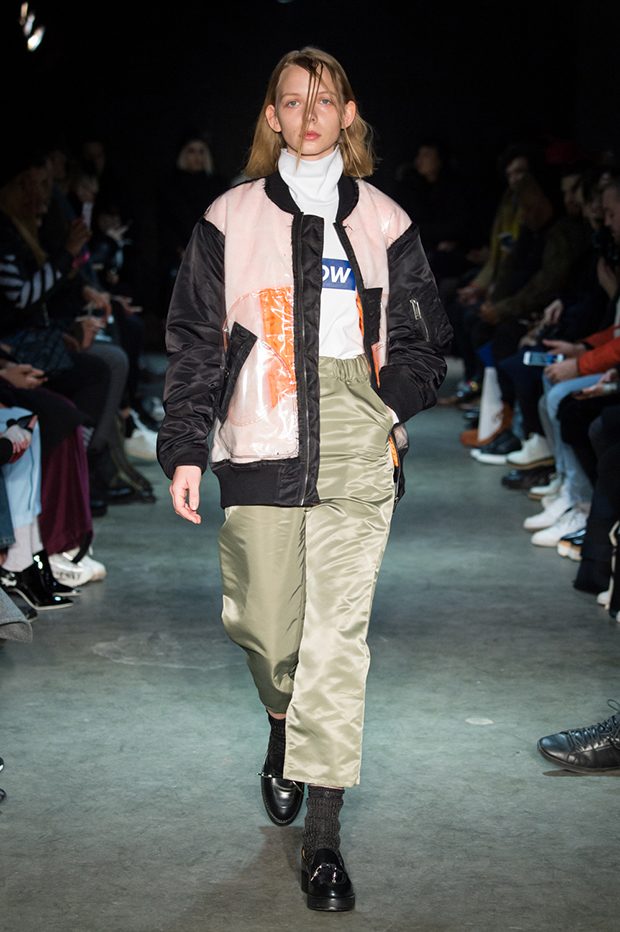 Designer Masanori Morikawa is playing his own musical score, by dissecting and recomposing silhouettes based on classics staples worked through deconstruction and layering. Classic tailored jackets are worn like kimono wrap over t-shirts and striped pajamas or shirts, trench coats are morphing into tunics and army bombers or denim jackets are skinned to expose their inner layers and bone structures. Japanese traditional summer clothing Jimbei is now made with leather, tartan motifs are printed on sheepskin to pay homage to schoolboy look seen through the Japanese prism of precise craftsmanship and Wabi-Sabi philosophy. Words are flashing throughout the collection such as « I Don’t Like Drugs but Drugs likes me » or « Too Fast to Live Too Young to Die », with its literal meanings which Morikawa reminds himself of in today’s society. – from Christian Dada
