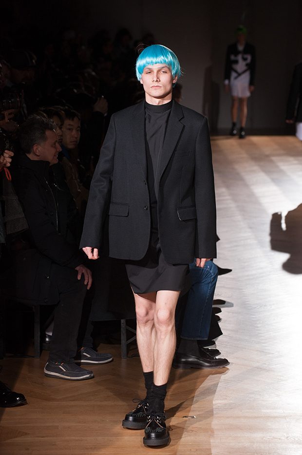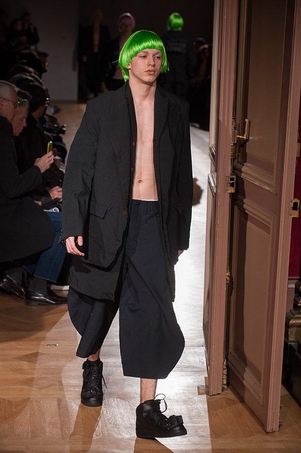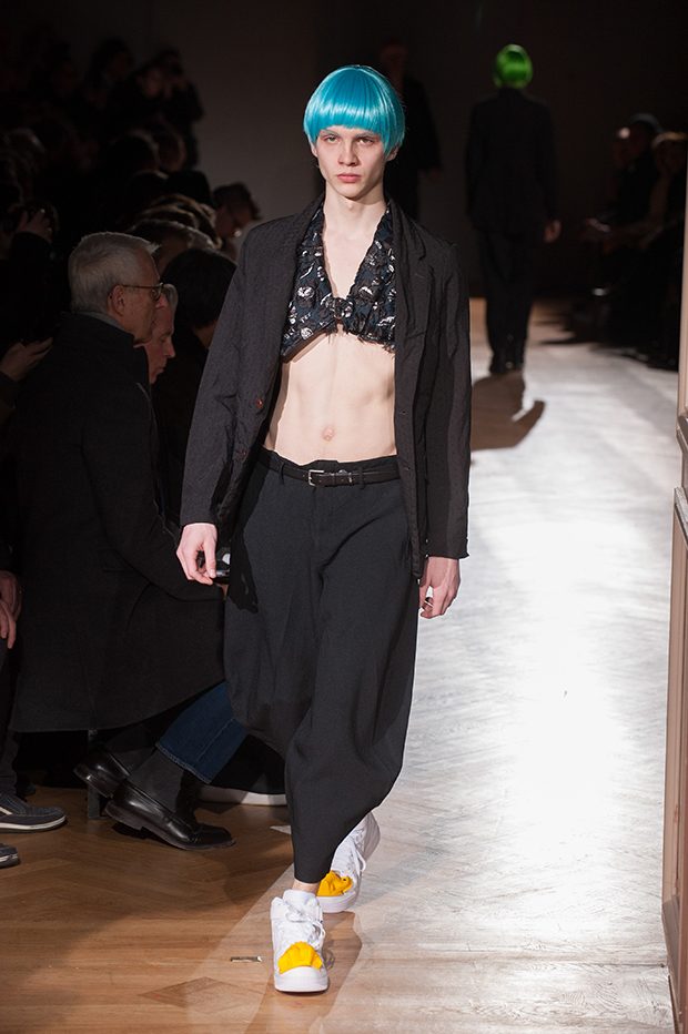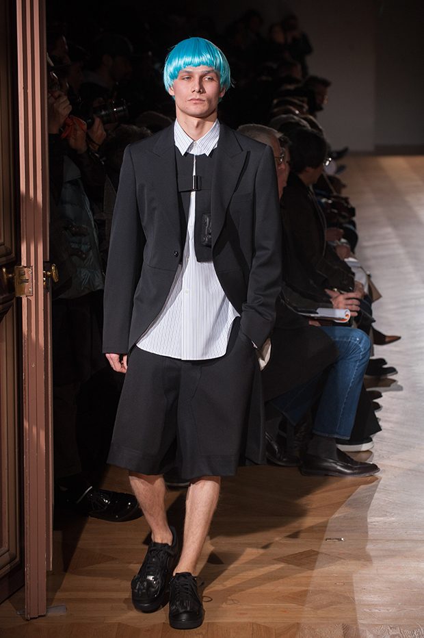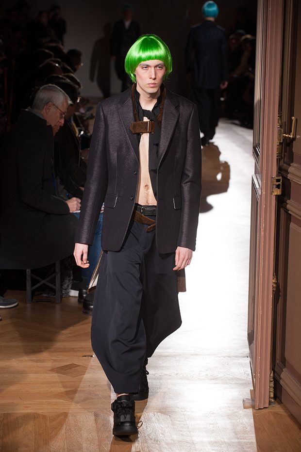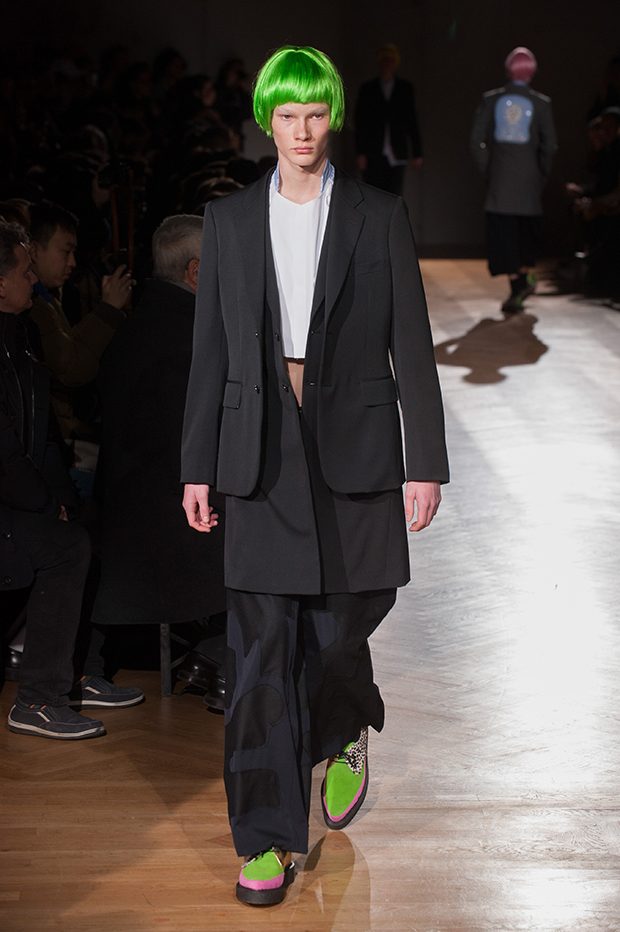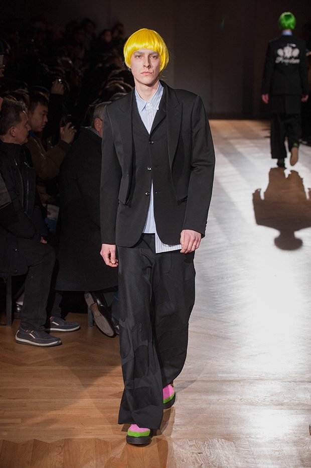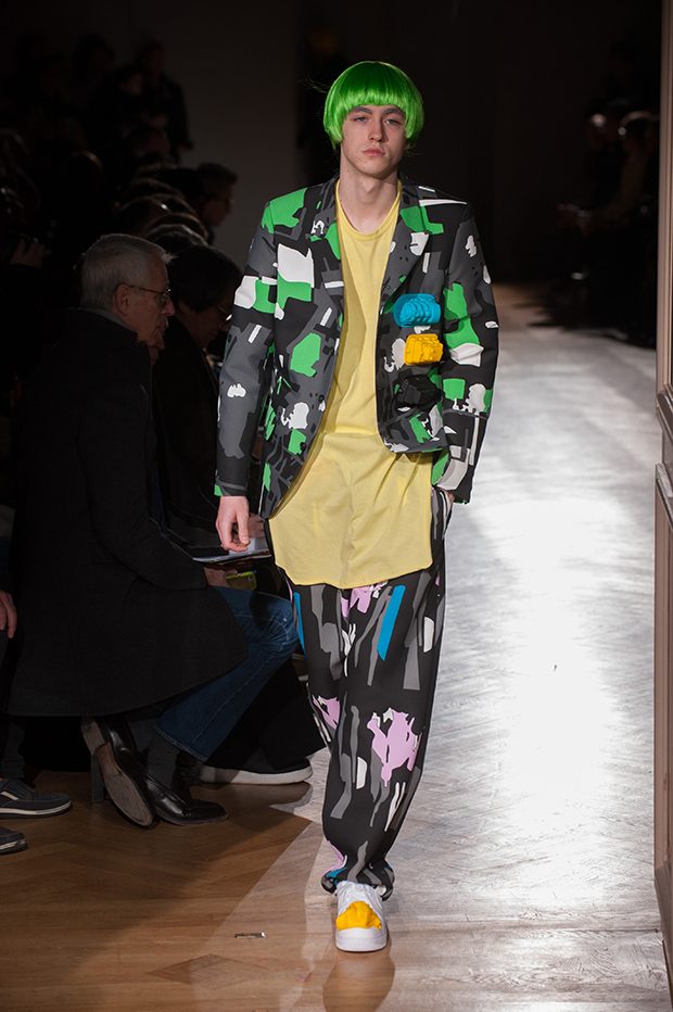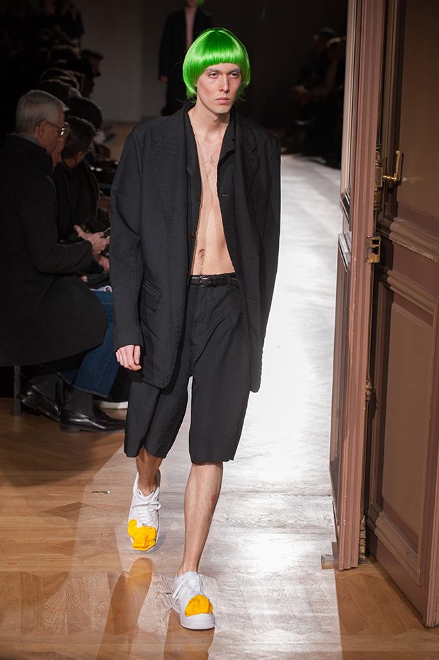Set in Hotel Westin Paris Vendome, the show was filled with contrasts – party wigs in neon colors, rubbery toys and colorful prints made by artist Candida Alvarez juxtaposed with dark colored garments. The collection plays with layers combining asymmetrical tailcoats, oversize T-shirts and Nike Air Force 1 customized sneakers.