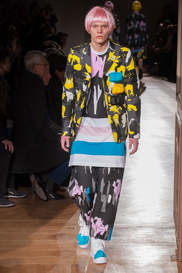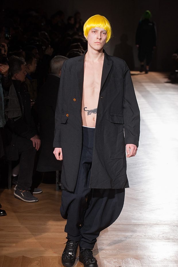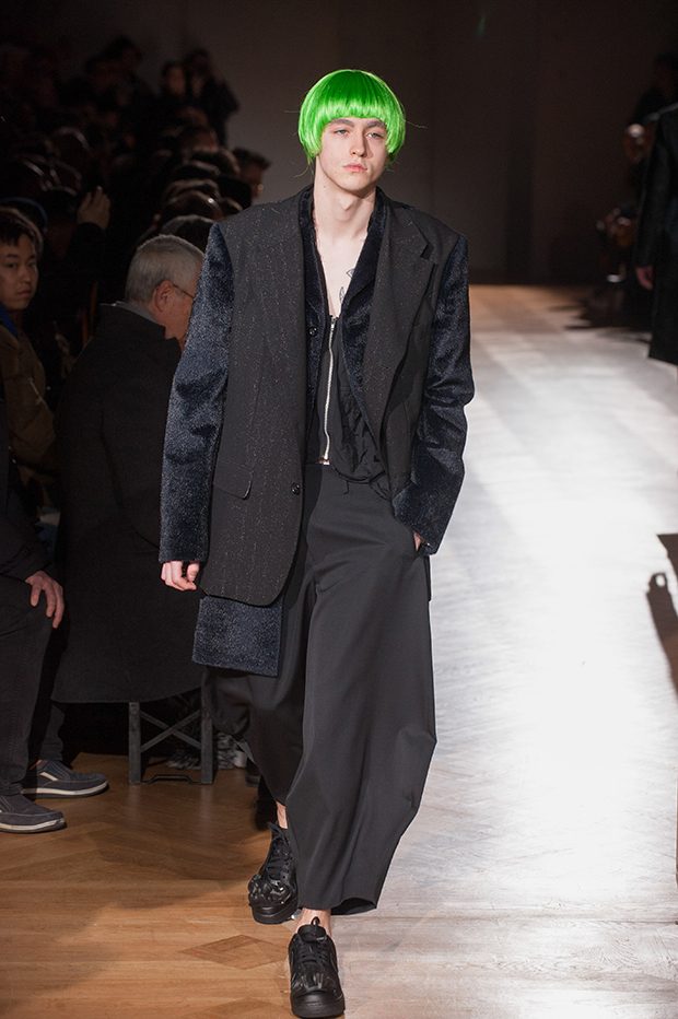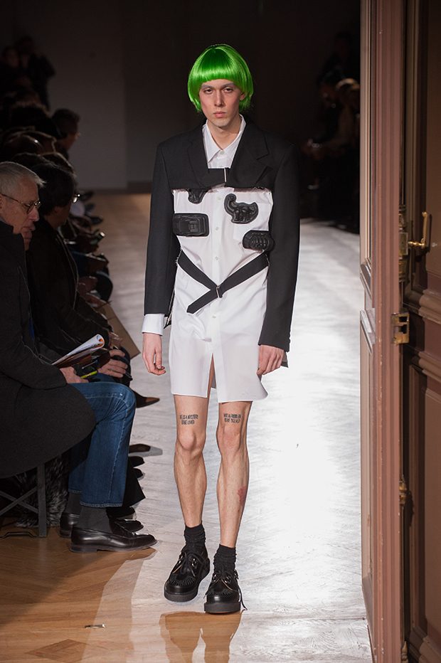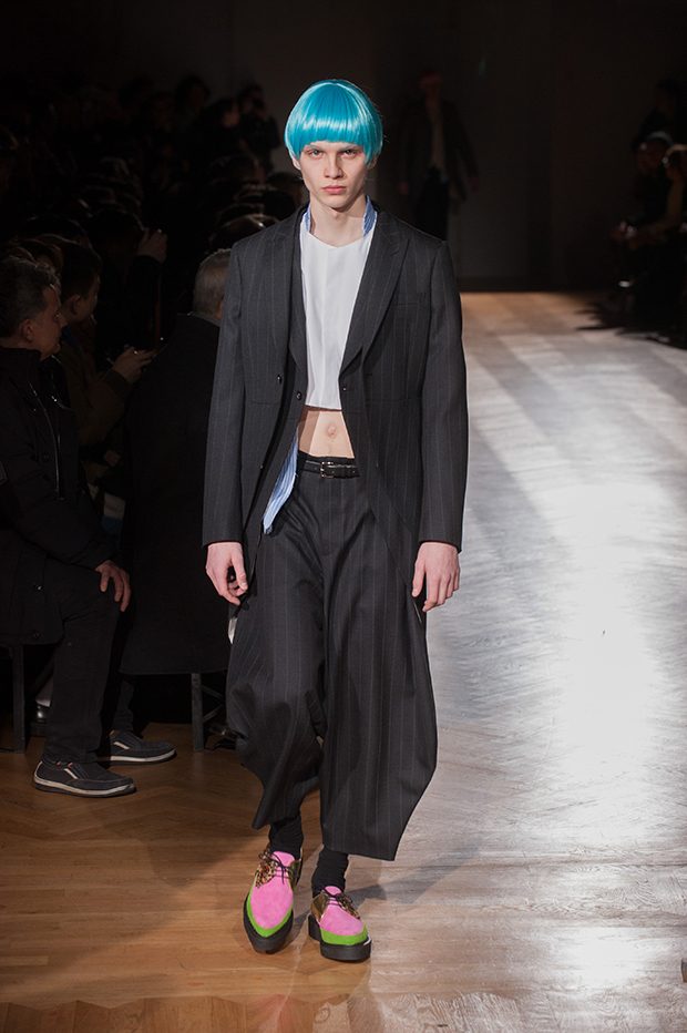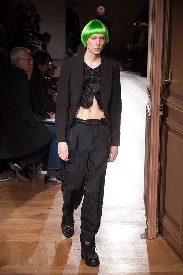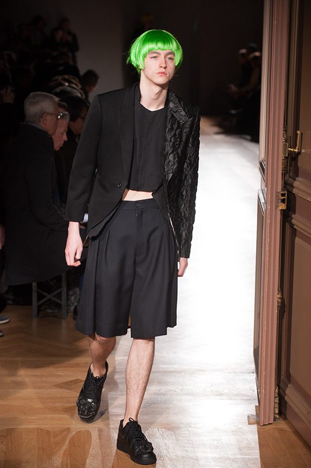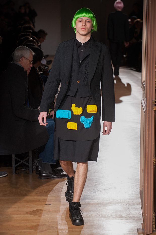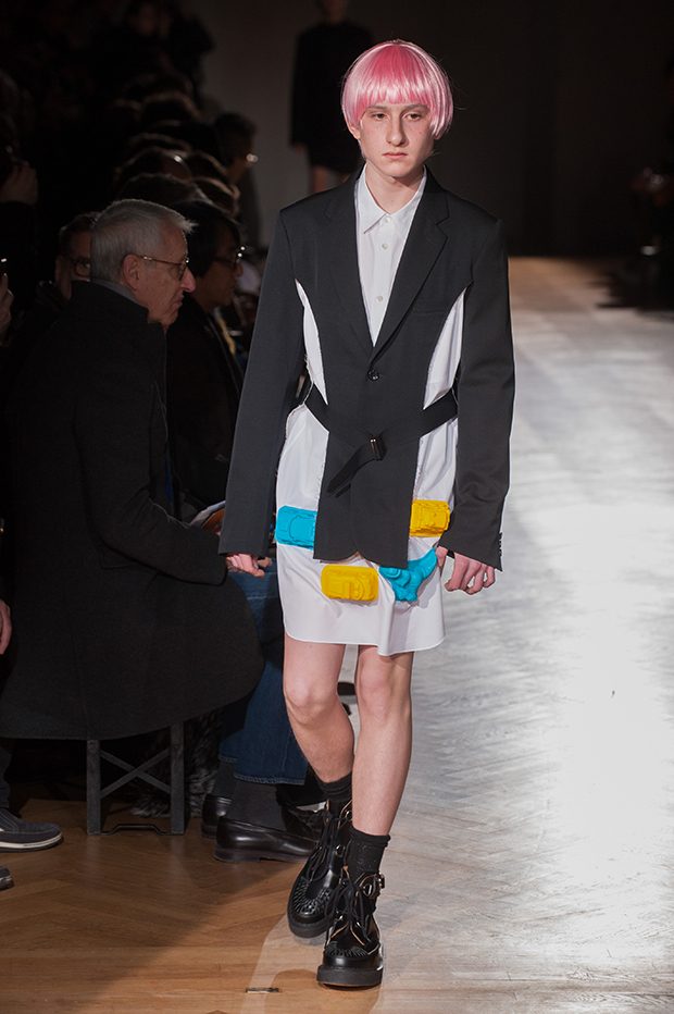 Set in Hotel Westin Paris Vendome, the show was filled with contrasts – party wigs in neon colors, rubbery toys and colorful prints made by artist Candida Alvarez juxtaposed with dark colored garments. The collection plays with layers combining asymmetrical tailcoats, oversize T-shirts and Nike Air Force 1 customized sneakers.