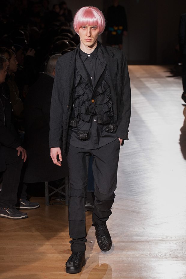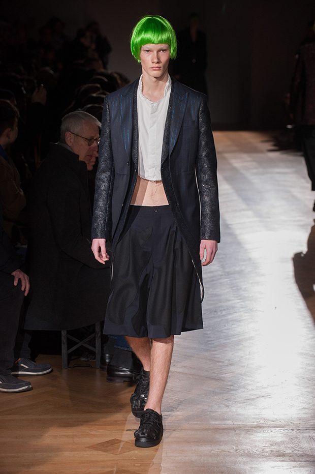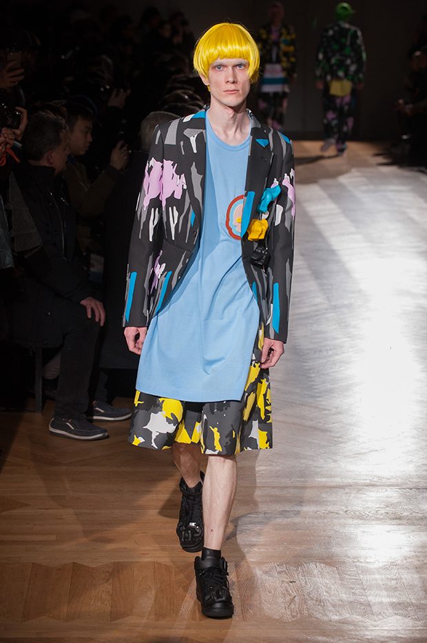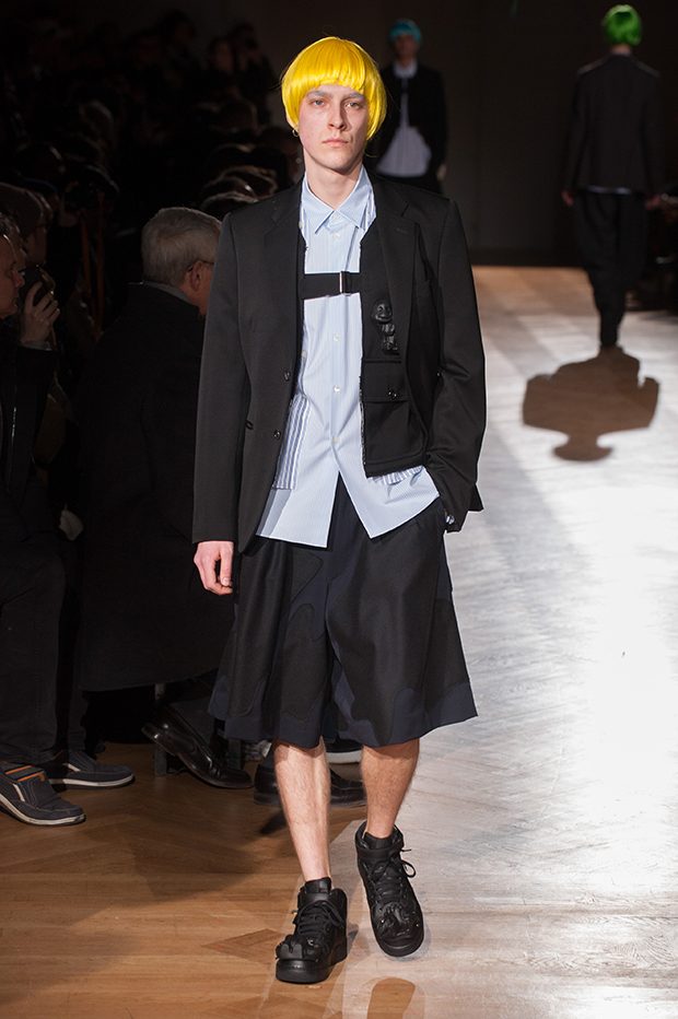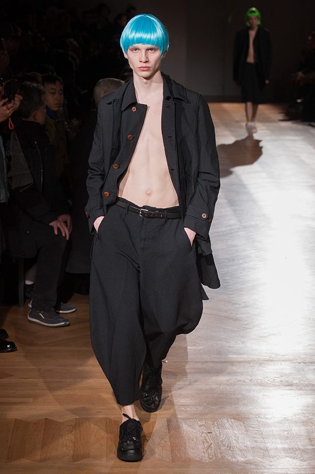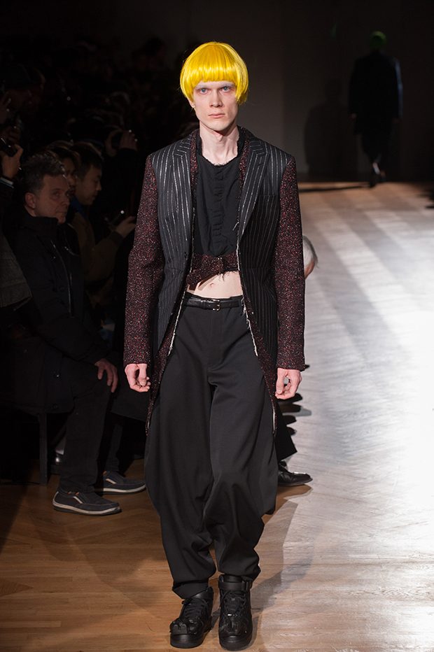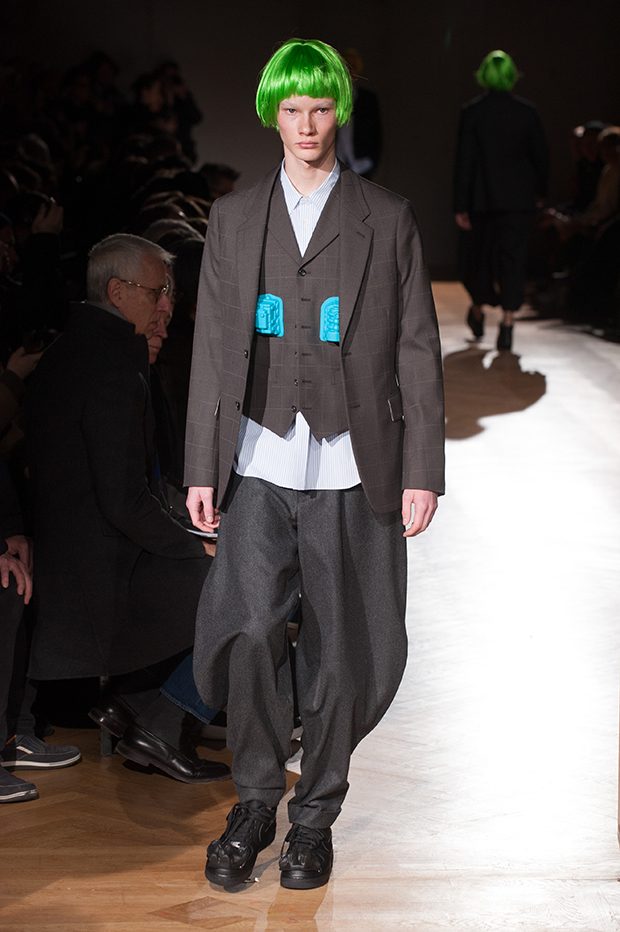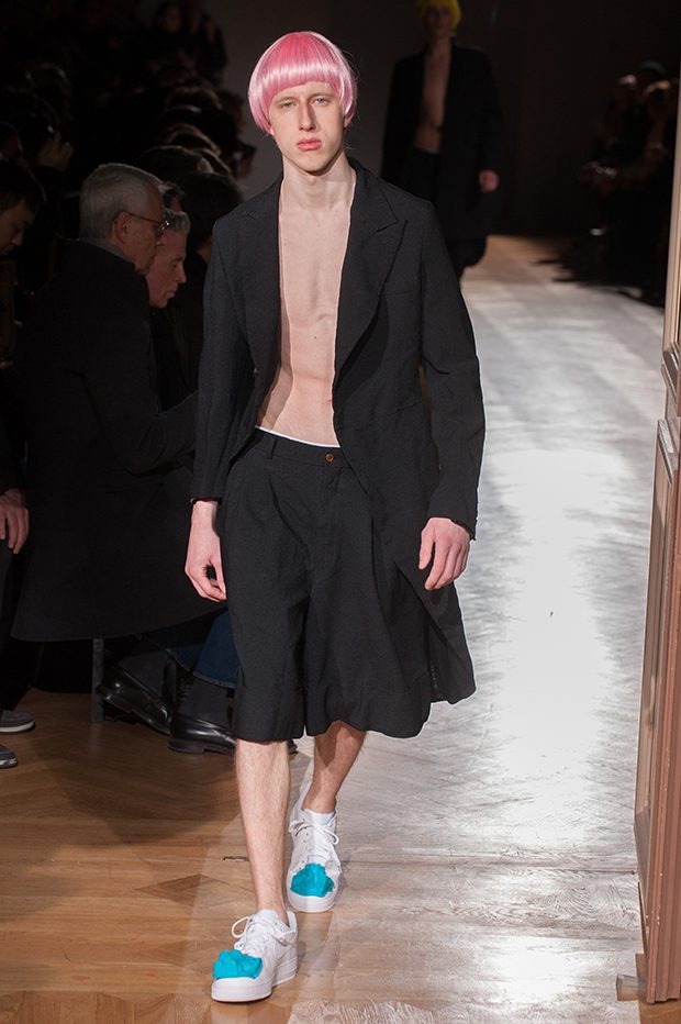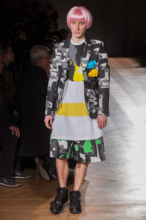 Set in Hotel Westin Paris Vendome, the show was filled with contrasts – party wigs in neon colors, rubbery toys and colorful prints made by artist Candida Alvarez juxtaposed with dark colored garments. The collection plays with layers combining asymmetrical tailcoats, oversize T-shirts and Nike Air Force 1 customized sneakers.