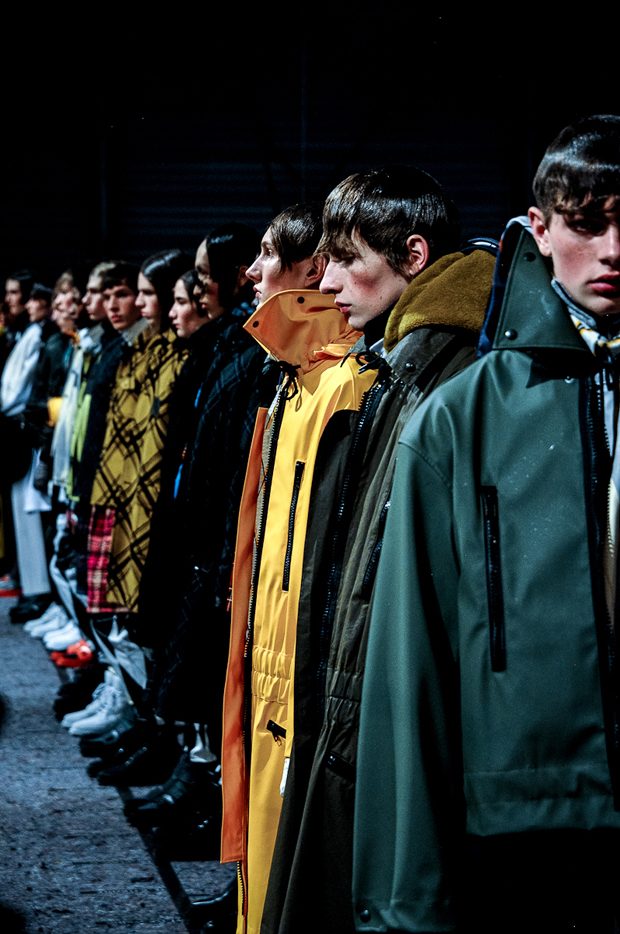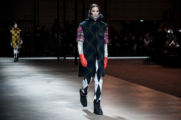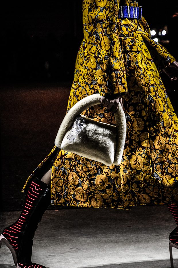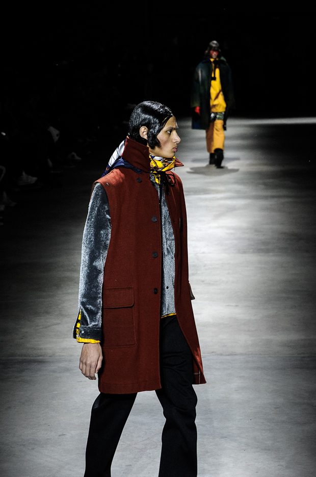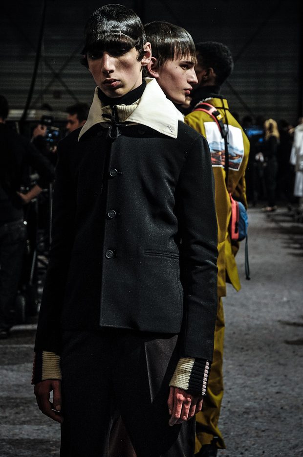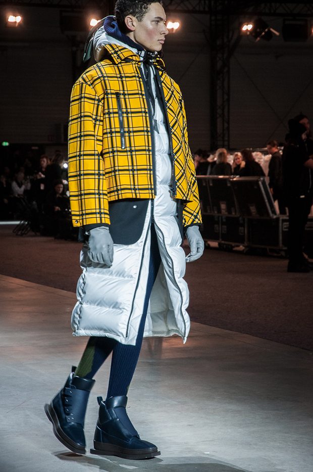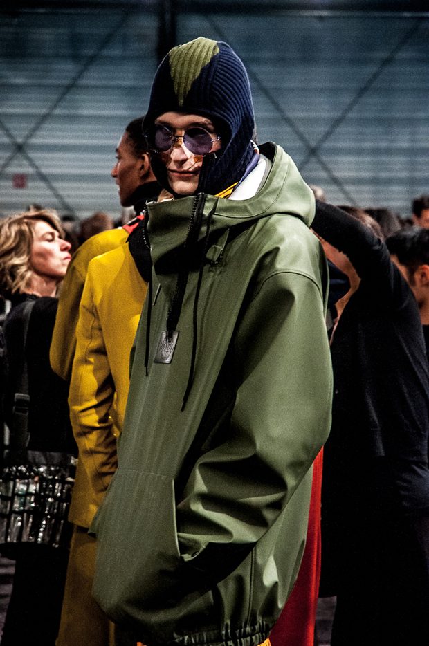A discovery of an arctic surfing subculture led us to a wardrobe that combines wild protection with an urban sensibility. Celebrating the women and men who experience as raw an environment as it gets, and hoping for it to continue forever. Vivid colors appear throughout – winter blue and raincoat yellows. Prints include geo tiger patterns, checks and argyles, Hawaiian meets Arctic surfer floral, glacier beach and degrade aurora borealis. Knits are intricate and robust. Northern folklores appear with ribbon on dresses and skirts. Shearlings in orange are propped up against peplum parkas. Dresses feature x-ray layering. Ready-for-survival, shrunken ski gear. Coats auto-affixed to blazers and leather argyles. The use of our backstage as the set for this show was a conscious decision to create dialogue with Ideas For Us and to contribute financially to their cause. In addition, for Fall 2017 we have partnered with Earth Guardians to create products that will further push their message. – from Kenzo