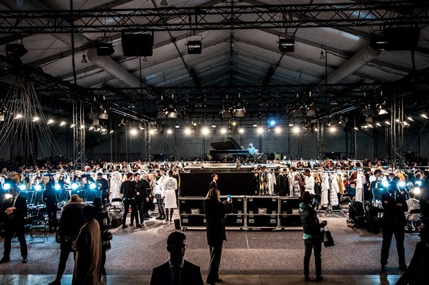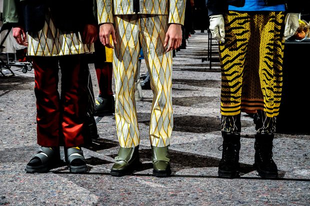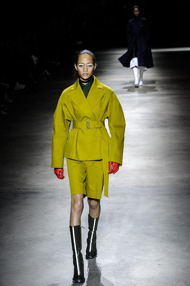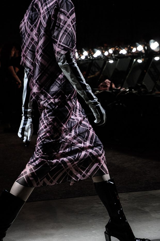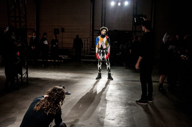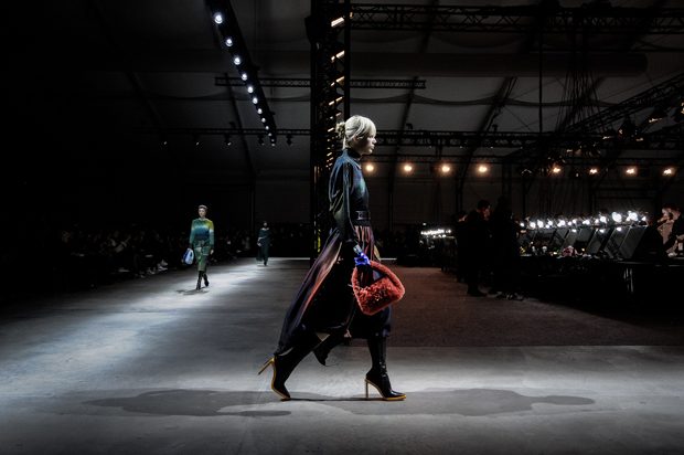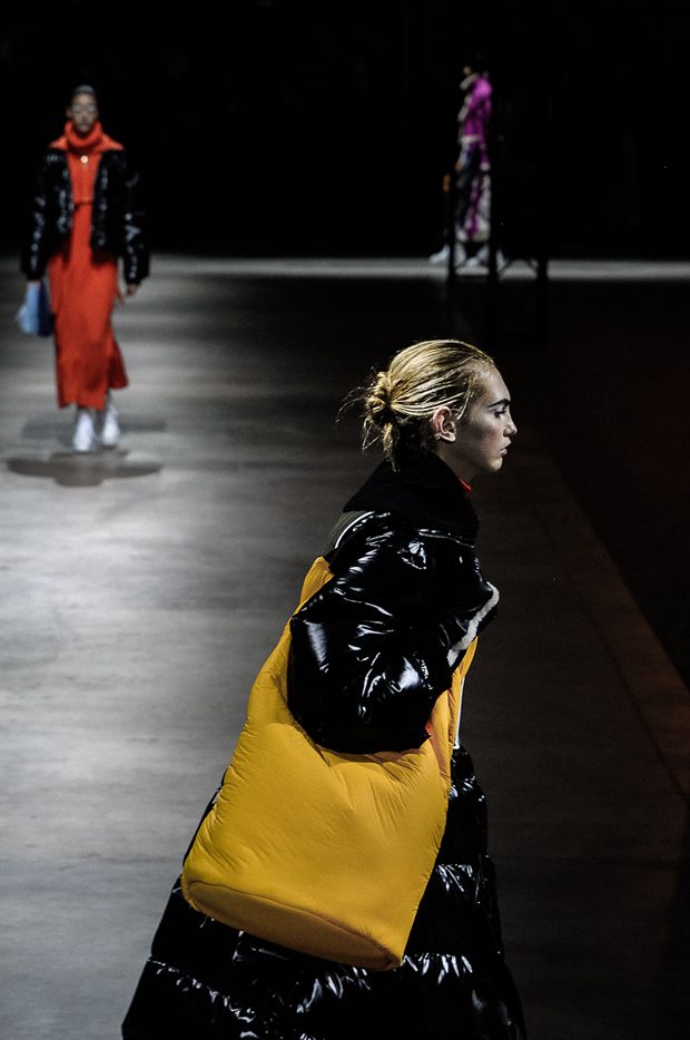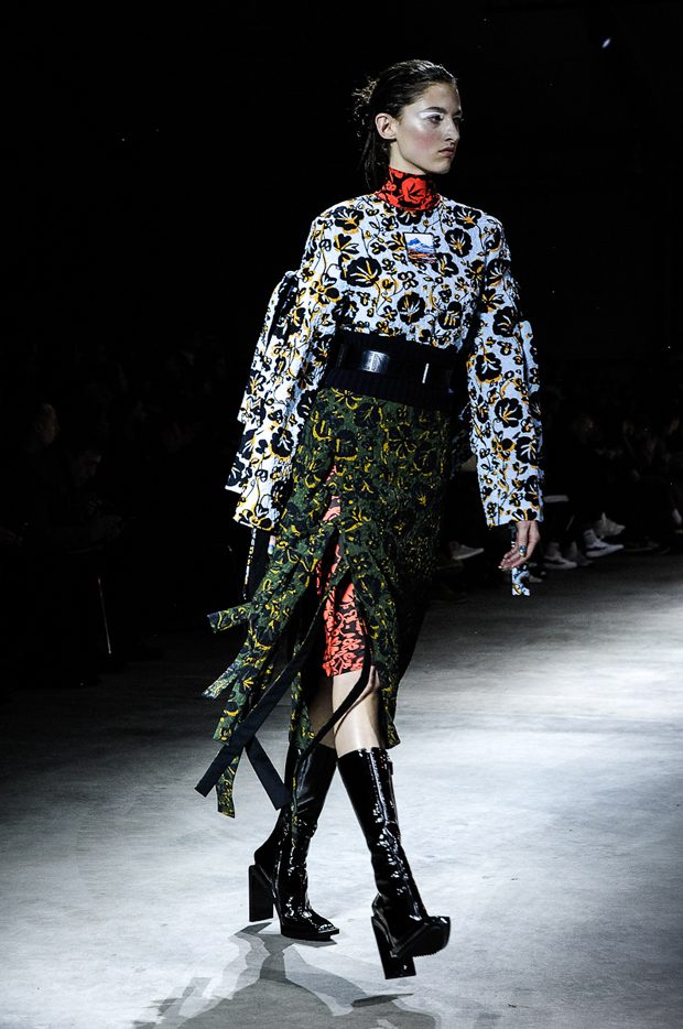 A discovery of an arctic surfing subculture led us to a wardrobe that combines wild protection with an urban sensibility. Celebrating the women and men who experience as raw an environment as it gets, and hoping for it to continue forever. Vivid colors appear throughout – winter blue and raincoat yellows. Prints include geo tiger patterns, checks and argyles, Hawaiian meets Arctic surfer floral, glacier beach and degrade aurora borealis. Knits are intricate and robust. Northern folklores appear with ribbon on dresses and skirts. Shearlings in orange are propped up against peplum parkas. Dresses feature x-ray layering. Ready-for-survival, shrunken ski gear. Coats auto-affixed to blazers and leather argyles. The use of our backstage as the set for this show was a conscious decision to create dialogue with Ideas For Us and to contribute financially to their cause. In addition, for Fall 2017 we have partnered with Earth Guardians to create products that will further push their message. – from Kenzo