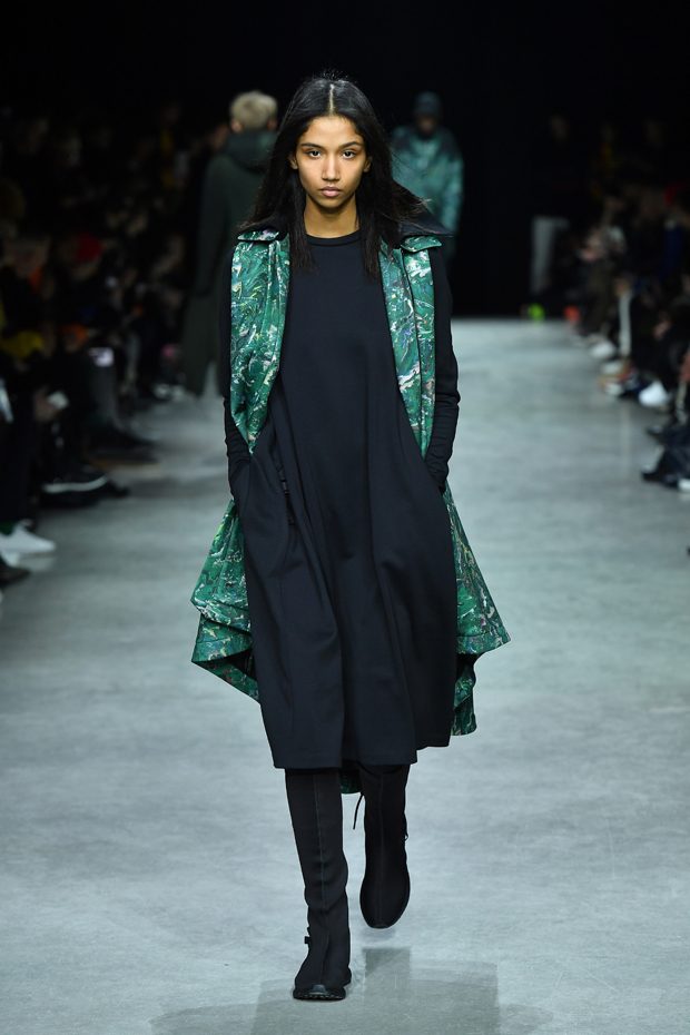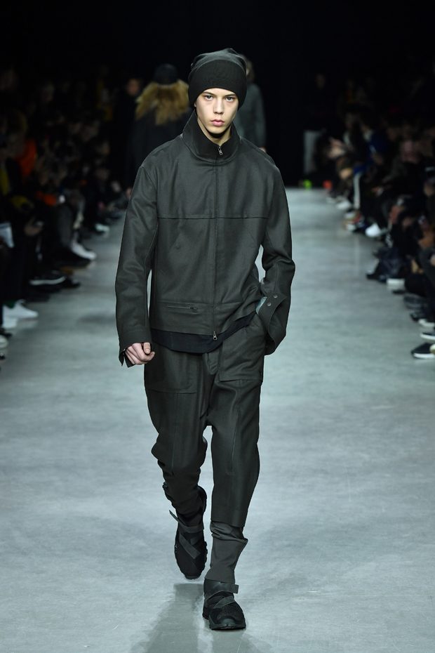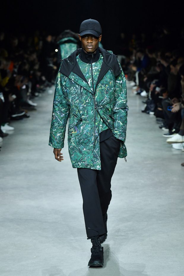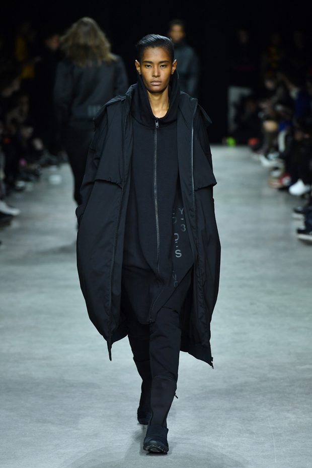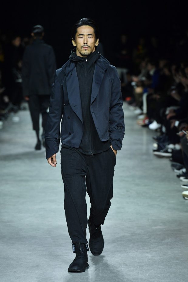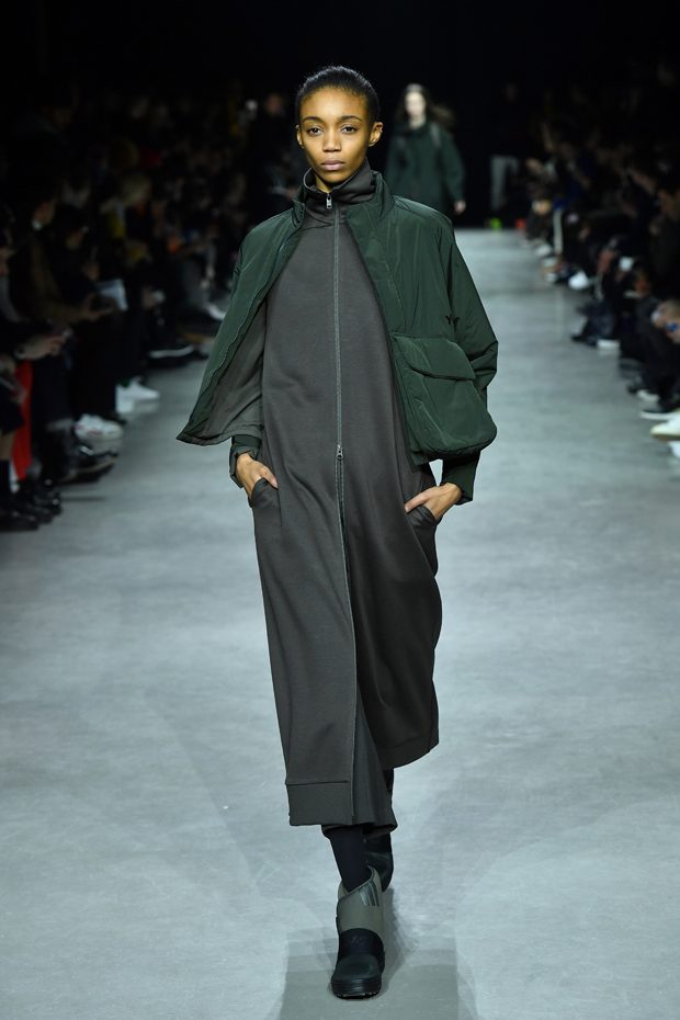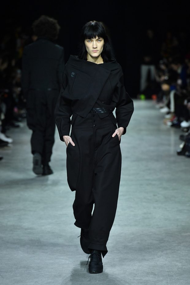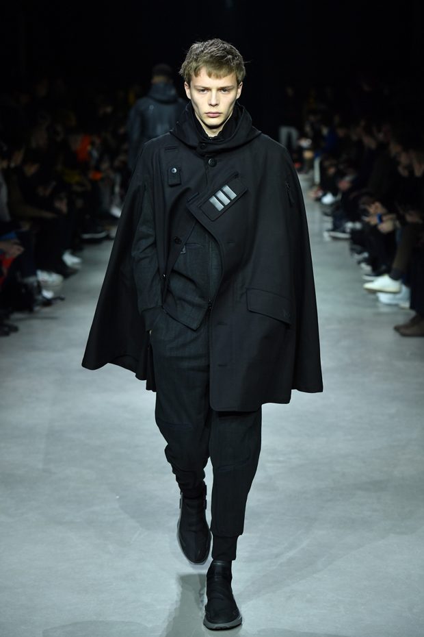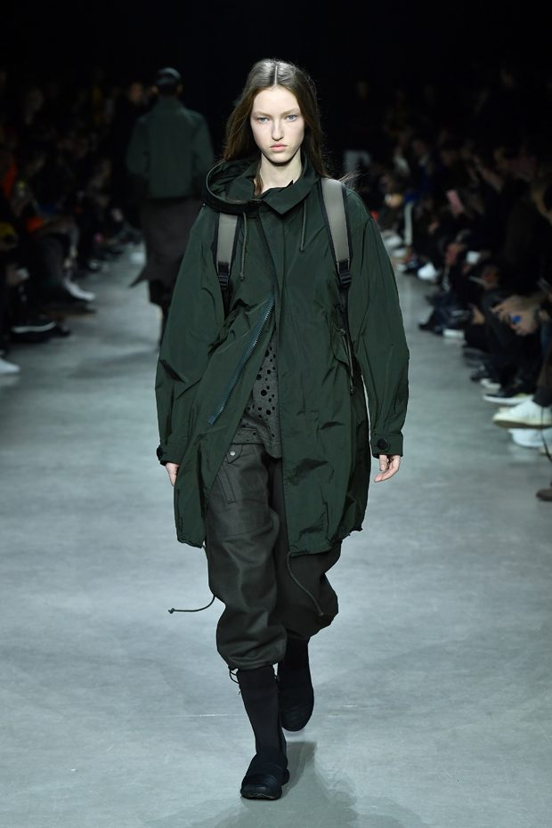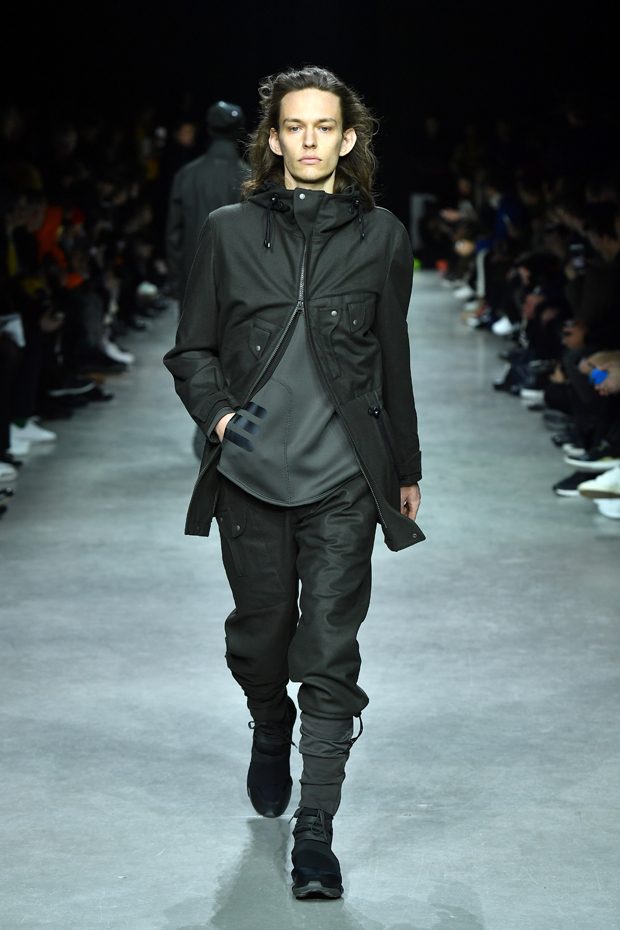 Y-3 reflects this juxtaposition between hi-tech and natural worlds with a collection of provocative, disruptive and seminal pieces featuring military infused detailing, constructed masculinity, innovative fabrics and elegant silhouettes. The highly-coveted Palais de Tokyo provided an ideal backdrop for the nature-inspired runway and nods to Yohji Yamamoto and adidas’ continued exploration of the future. – from Y-3