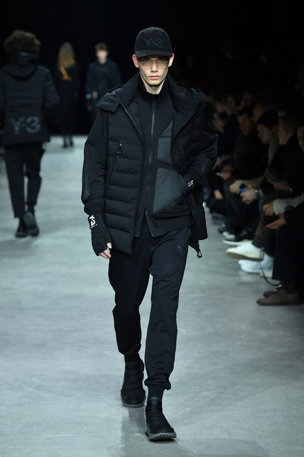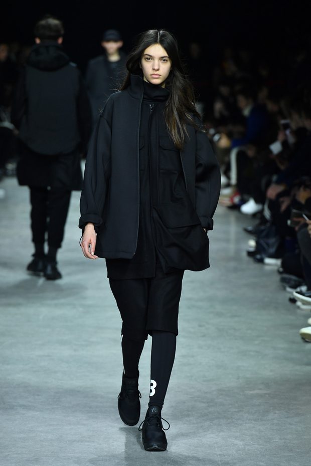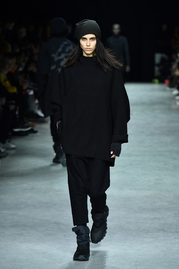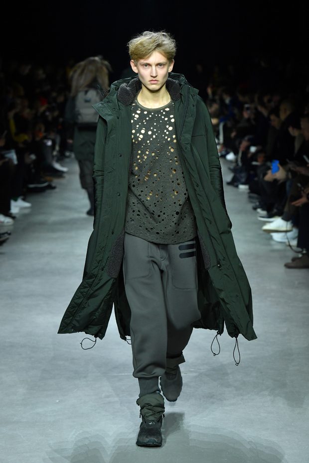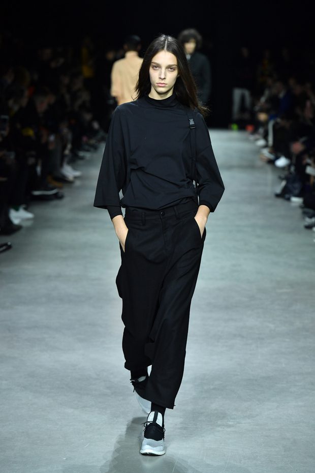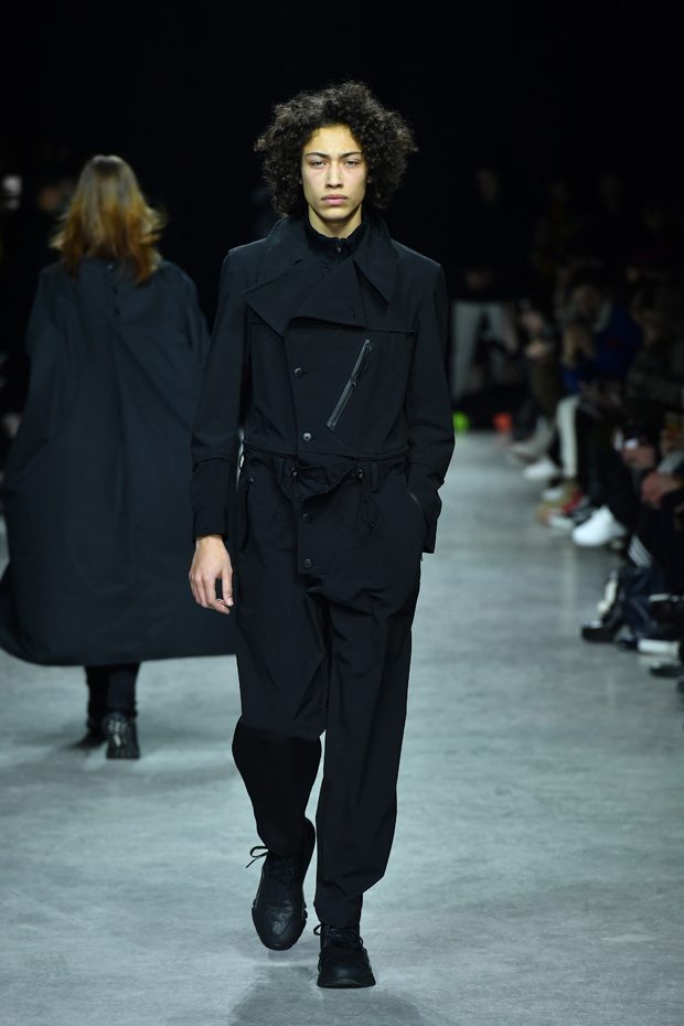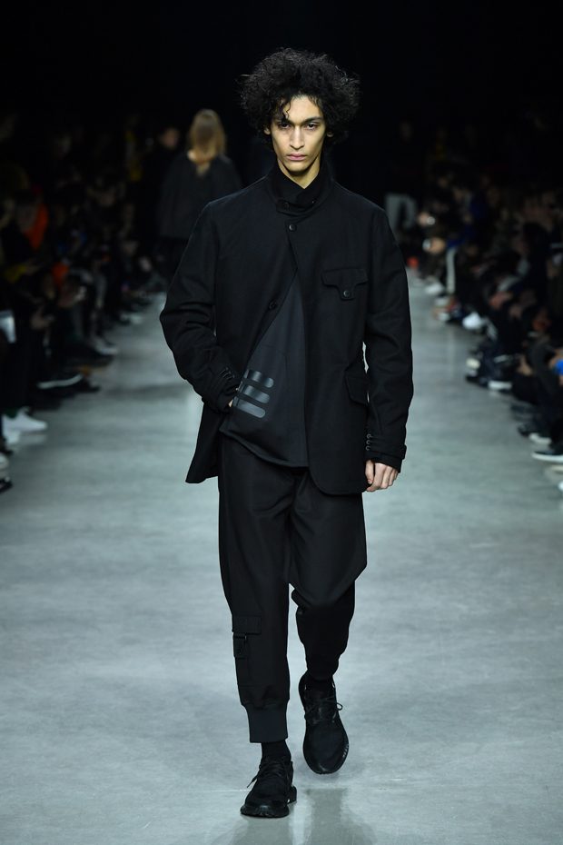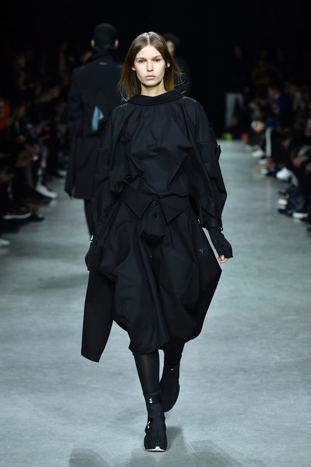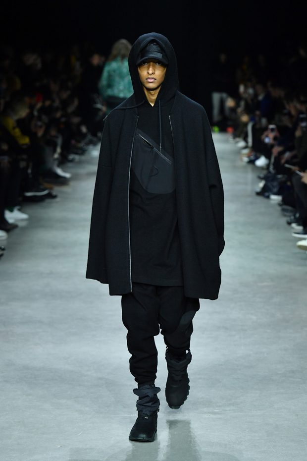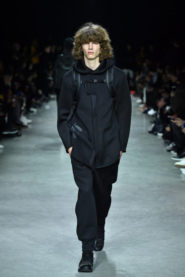Y-3 reflects this juxtaposition between hi-tech and natural worlds with a collection of provocative, disruptive and seminal pieces featuring military infused detailing, constructed masculinity, innovative fabrics and elegant silhouettes. The highly-coveted Palais de Tokyo provided an ideal backdrop for the nature-inspired runway and nods to Yohji Yamamoto and adidas’ continued exploration of the future. – from Y-3