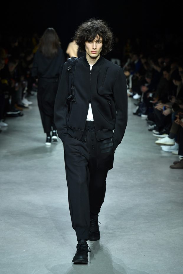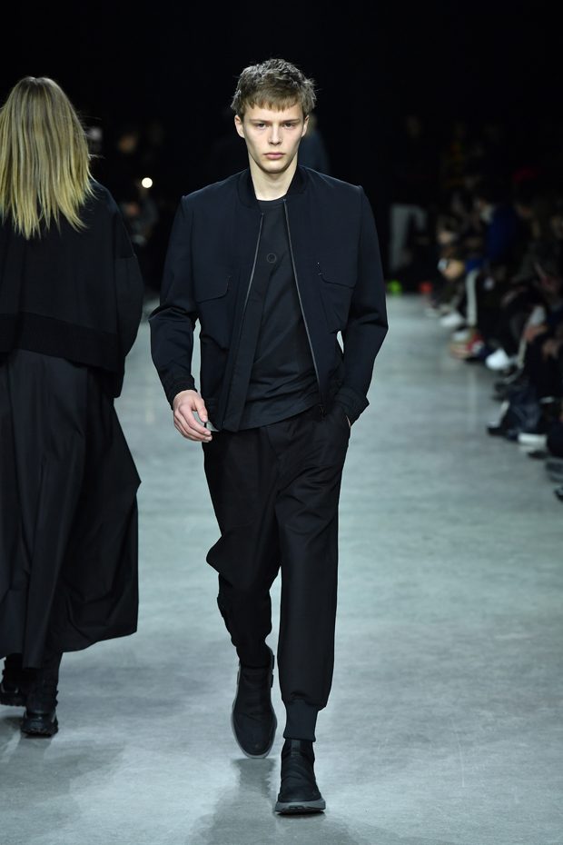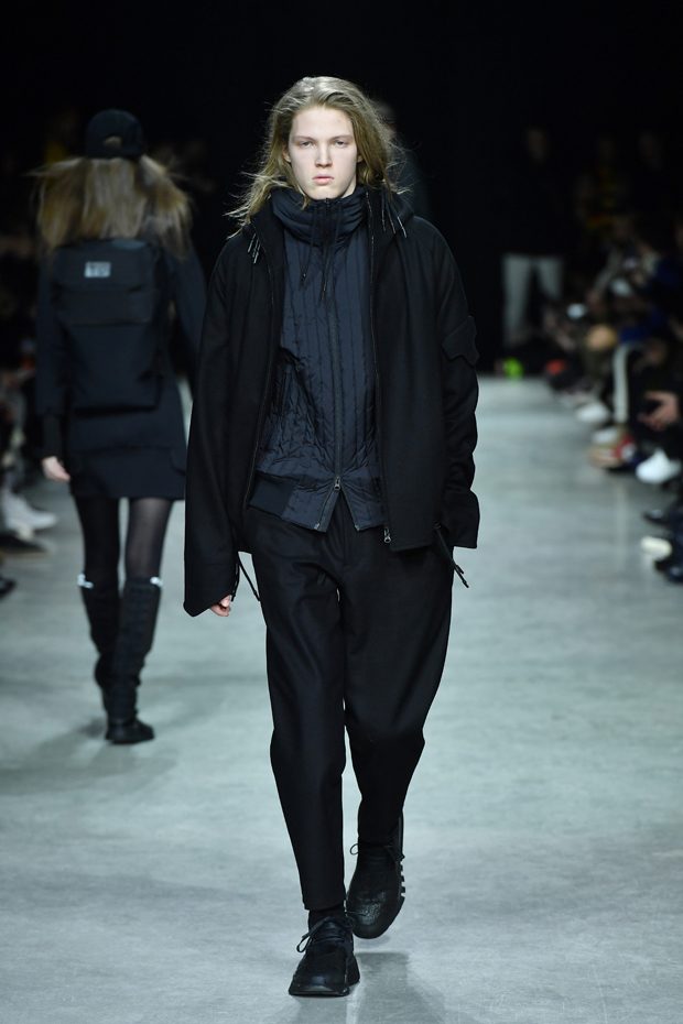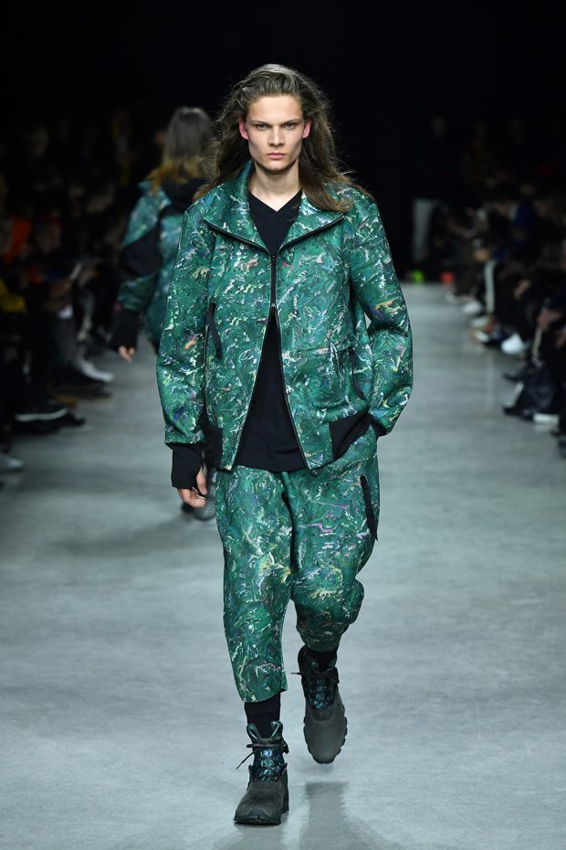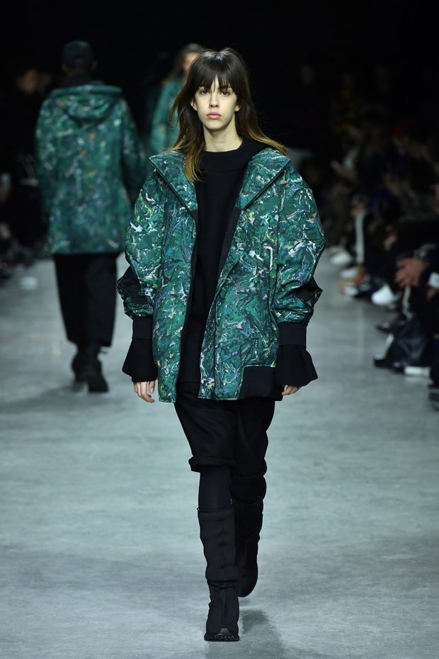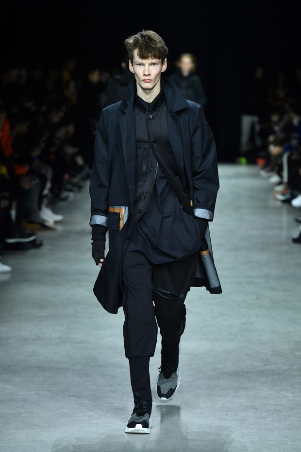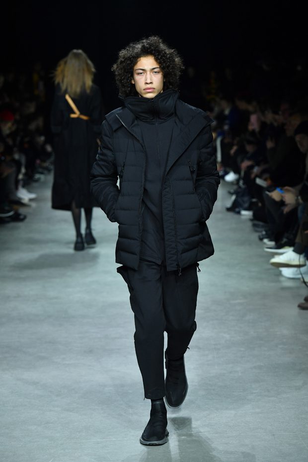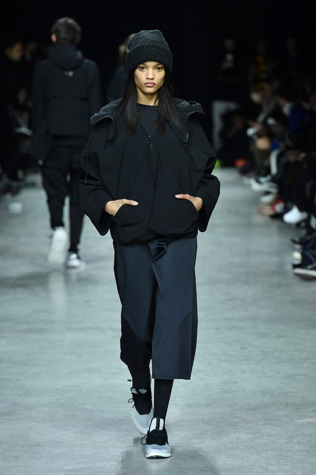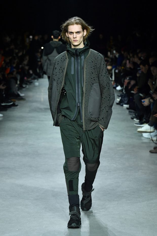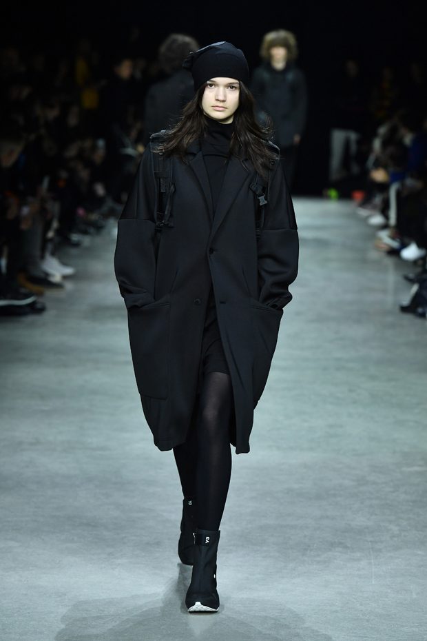 Y-3 reflects this juxtaposition between hi-tech and natural worlds with a collection of provocative, disruptive and seminal pieces featuring military infused detailing, constructed masculinity, innovative fabrics and elegant silhouettes. The highly-coveted Palais de Tokyo provided an ideal backdrop for the nature-inspired runway and nods to Yohji Yamamoto and adidas’ continued exploration of the future. – from Y-3