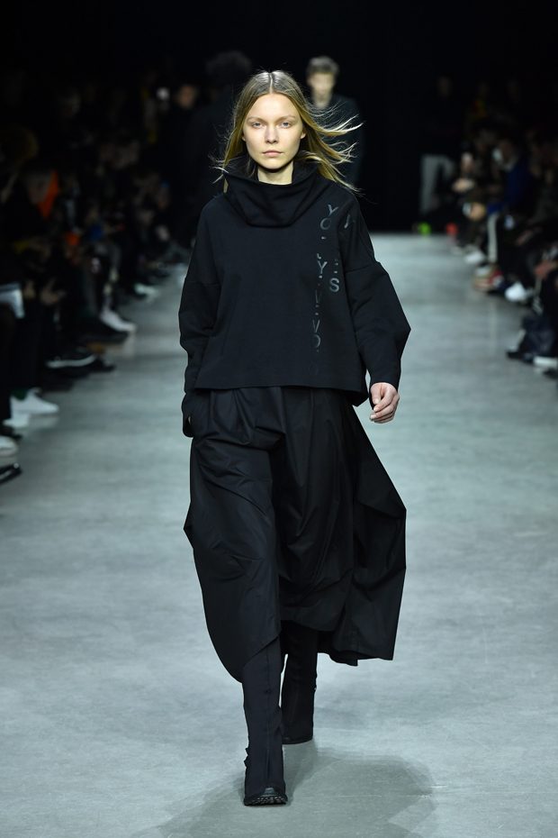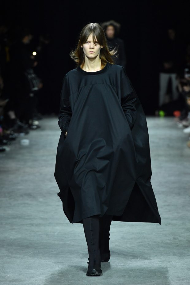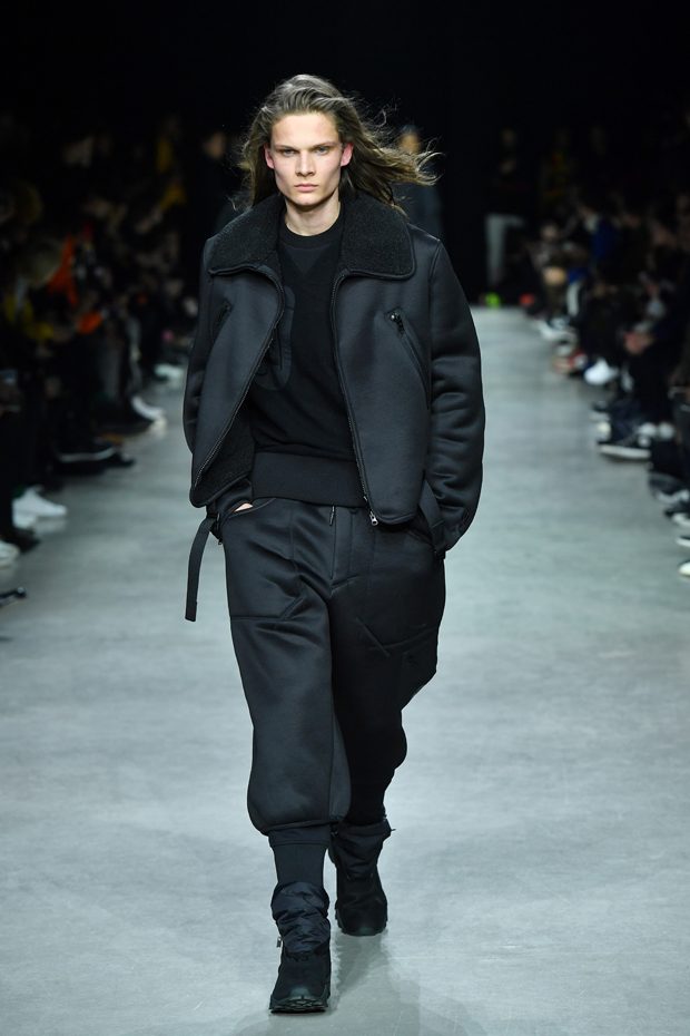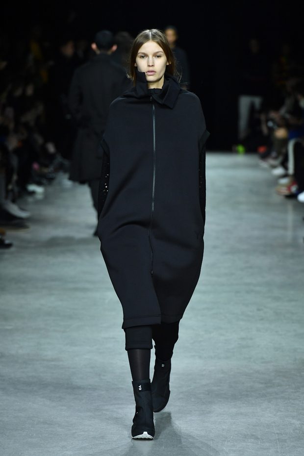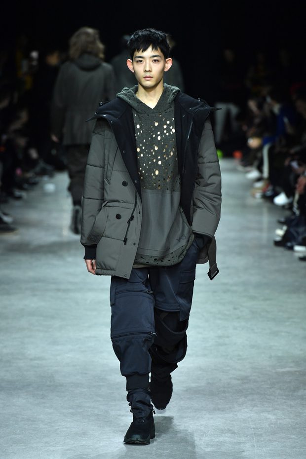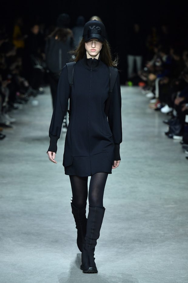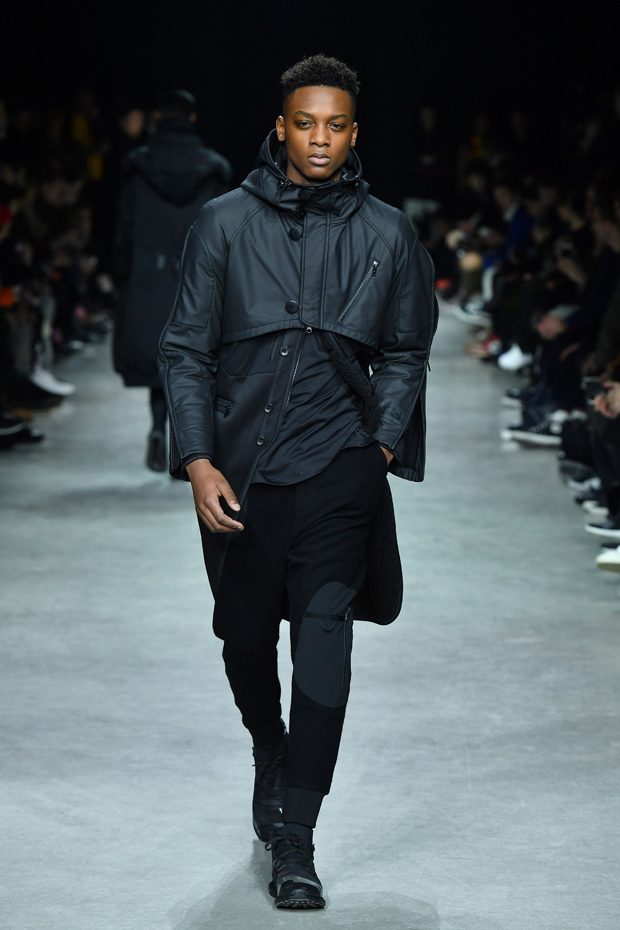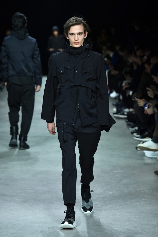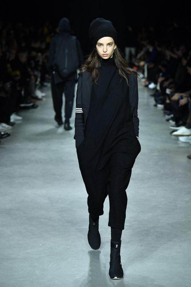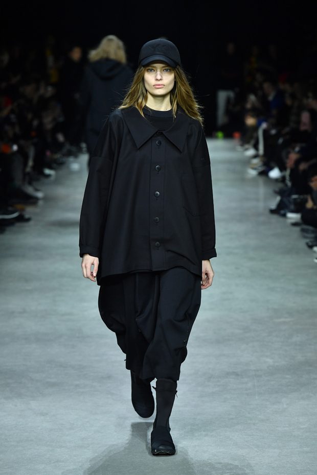 Y-3 reflects this juxtaposition between hi-tech and natural worlds with a collection of provocative, disruptive and seminal pieces featuring military infused detailing, constructed masculinity, innovative fabrics and elegant silhouettes. The highly-coveted Palais de Tokyo provided an ideal backdrop for the nature-inspired runway and nods to Yohji Yamamoto and adidas’ continued exploration of the future. – from Y-3