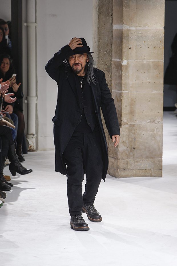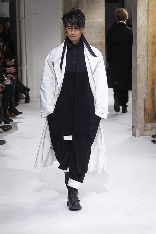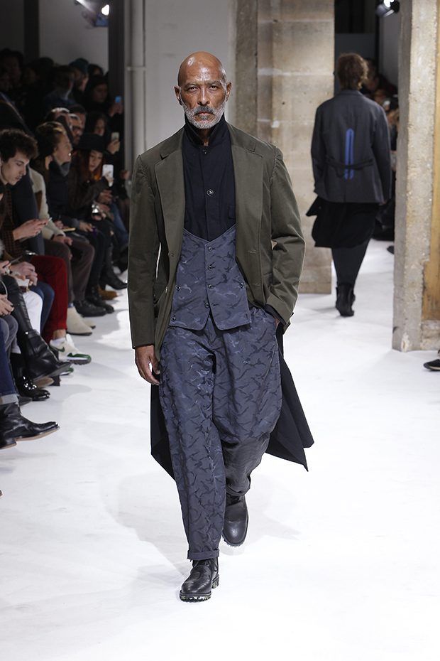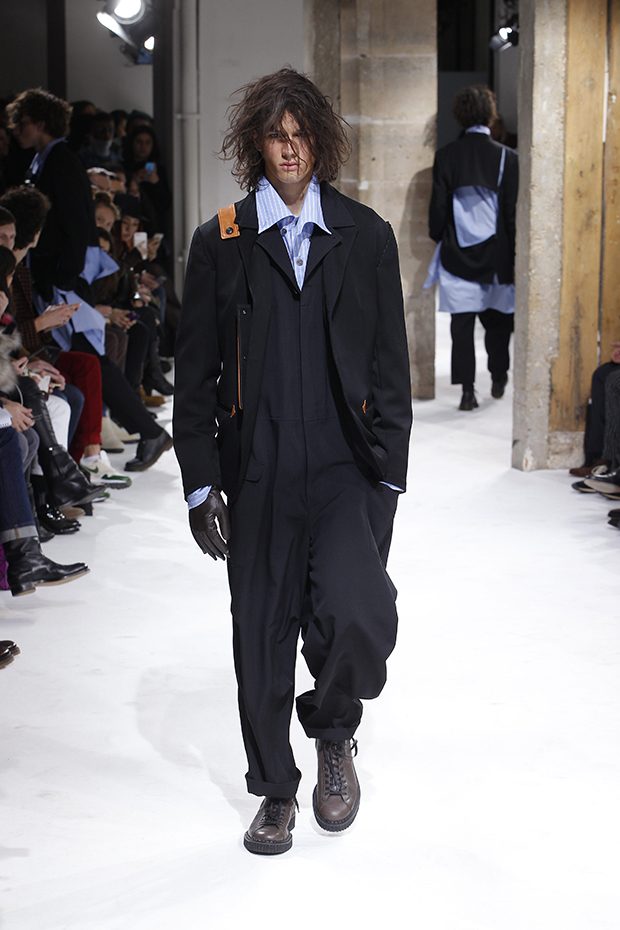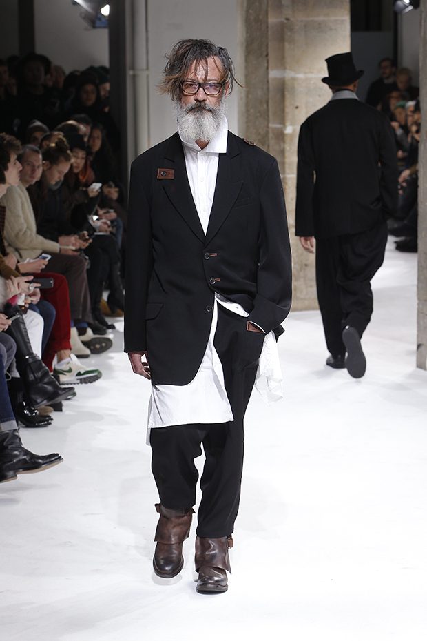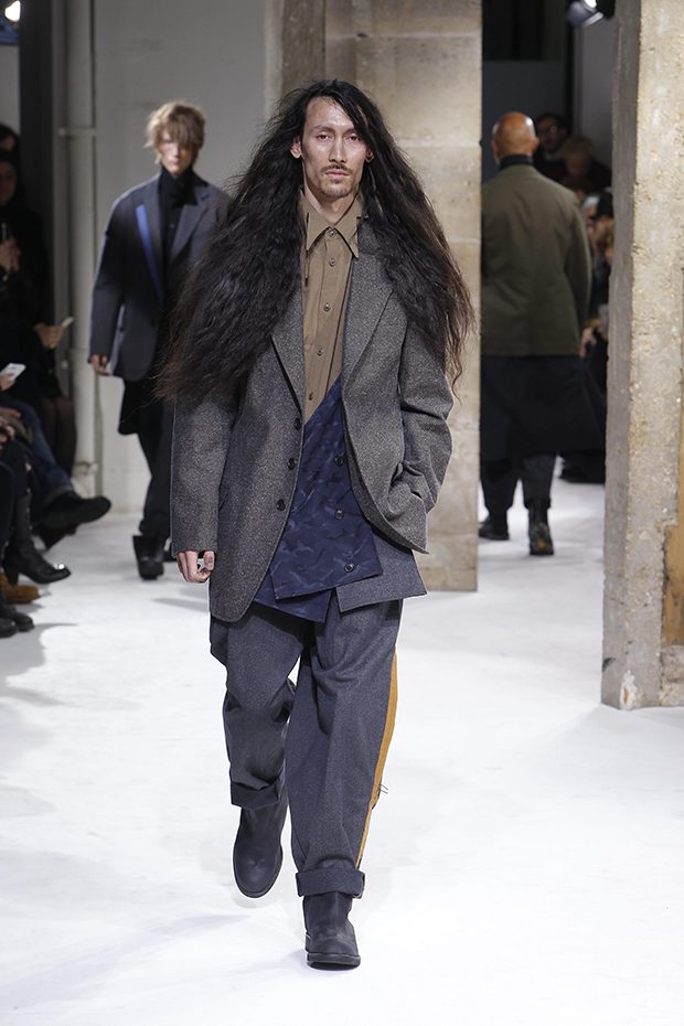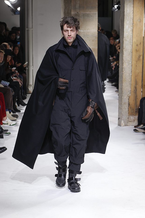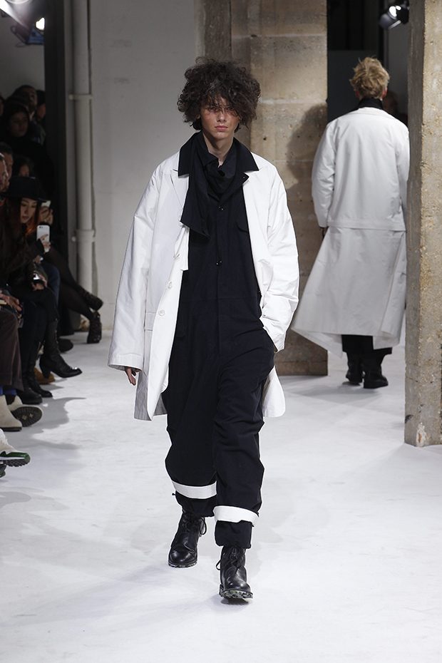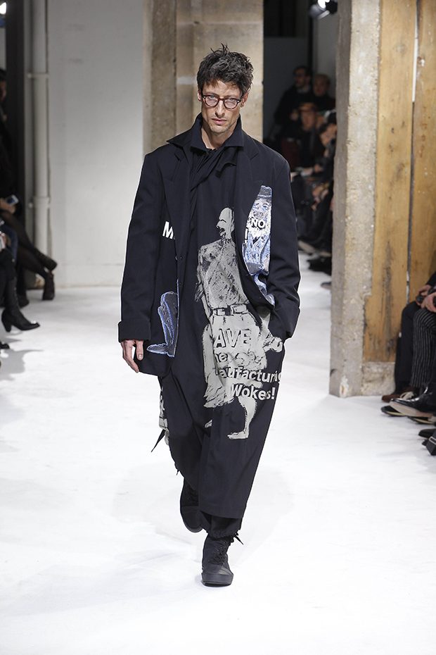 Yohji Yamamoto presented his Fall Winter 2017.18 collection during the Paris Fashion Week. Inspired by work uniforms and the power of the body, the new collection indicates the dynamics of XXI century life. With the slogans The Times Are Changing Too Fast and Save the manufacturing workers patched on jackets, the designer tried to point out on his dissatisfaction with the world where money makes money and to show his admiration for the men using their own bodies to make money.