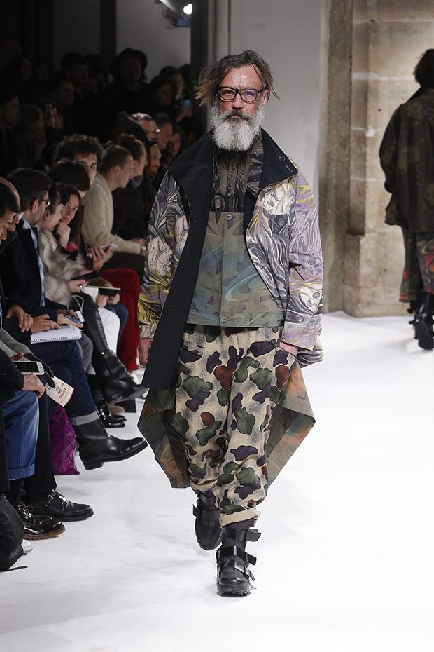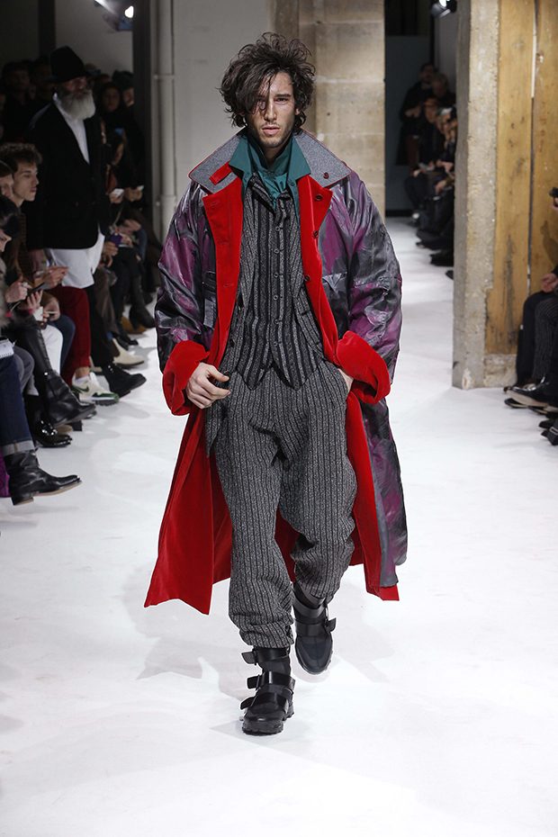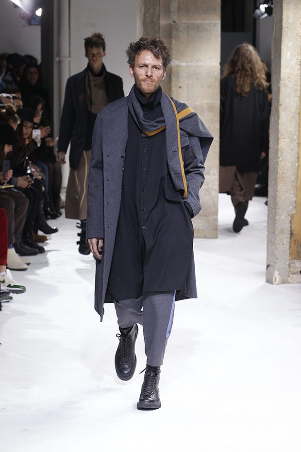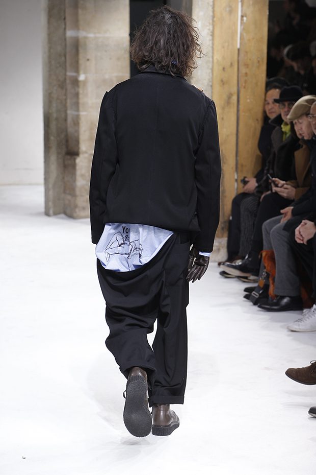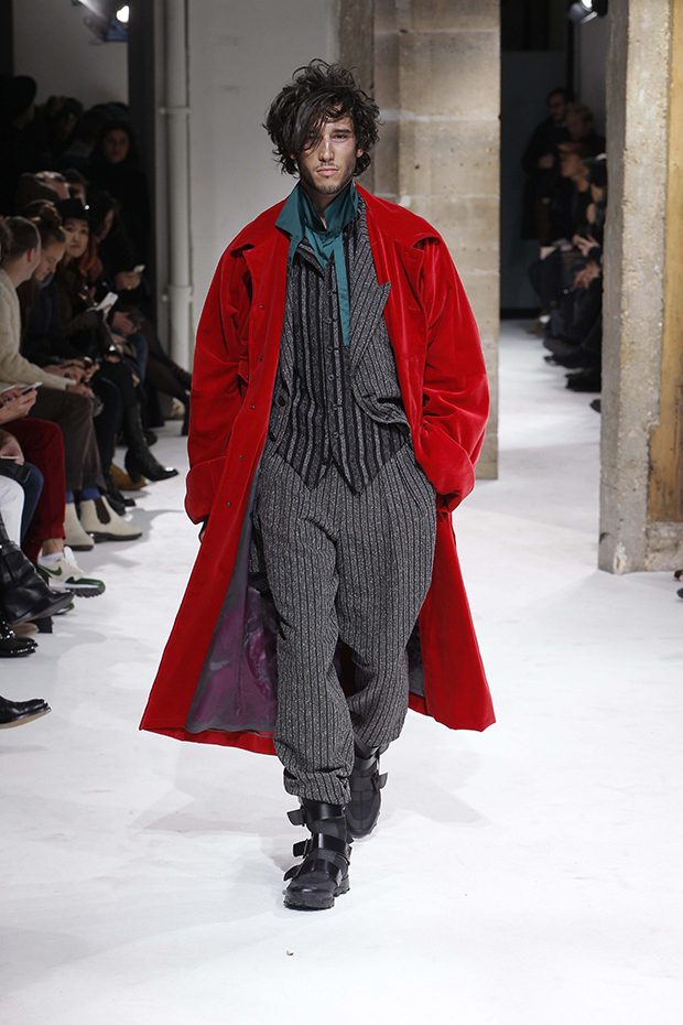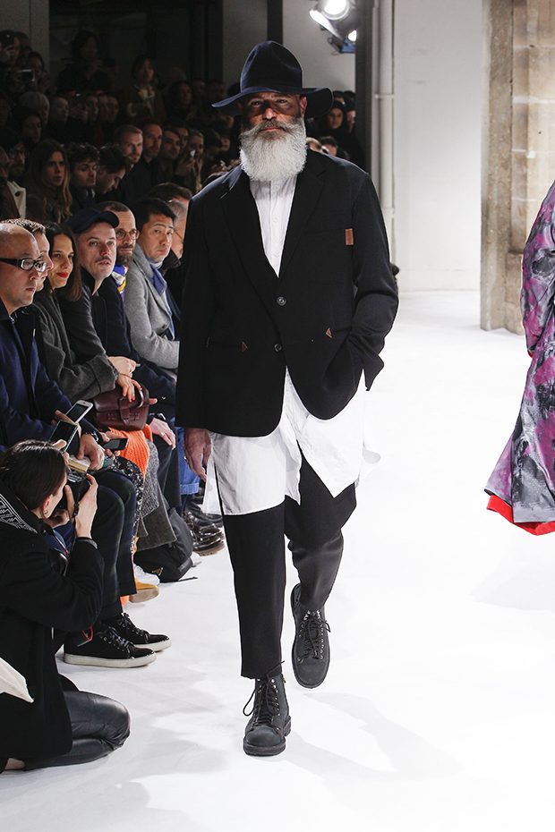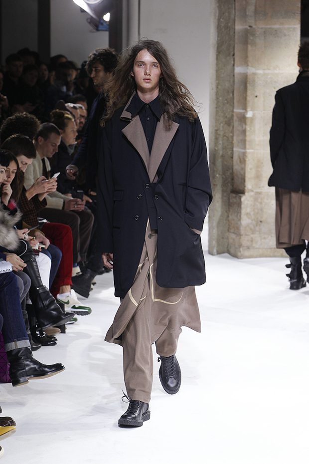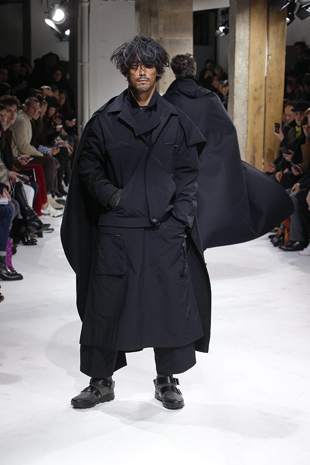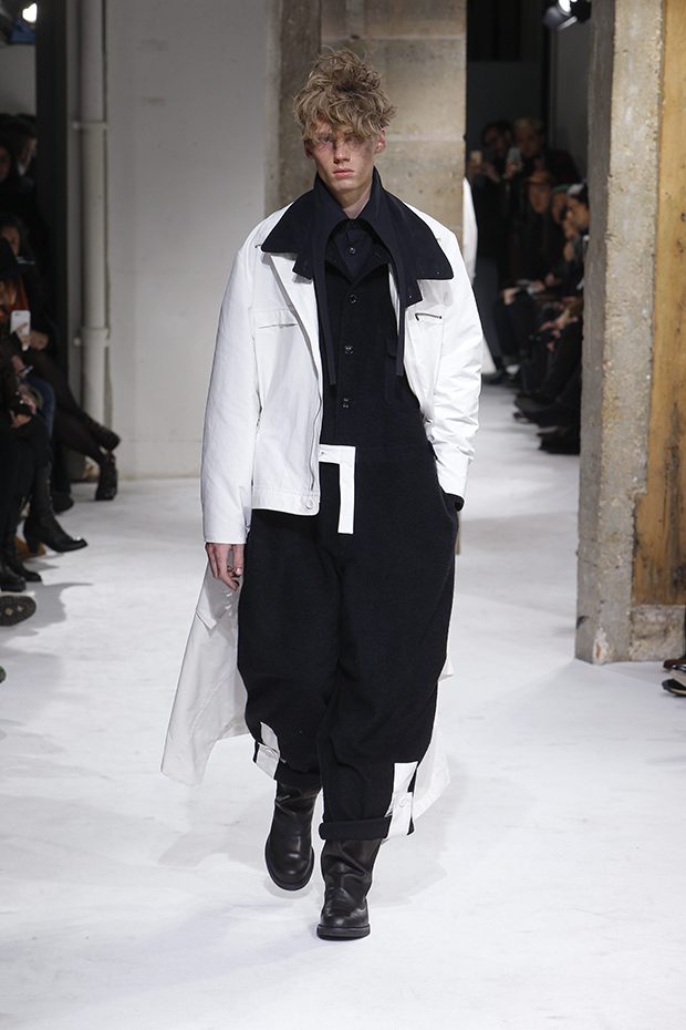 Yohji Yamamoto presented his Fall Winter 2017.18 collection during the Paris Fashion Week. Inspired by work uniforms and the power of the body, the new collection indicates the dynamics of XXI century life. With the slogans The Times Are Changing Too Fast and Save the manufacturing workers patched on jackets, the designer tried to point out on his dissatisfaction with the world where money makes money and to show his admiration for the men using their own bodies to make money.
