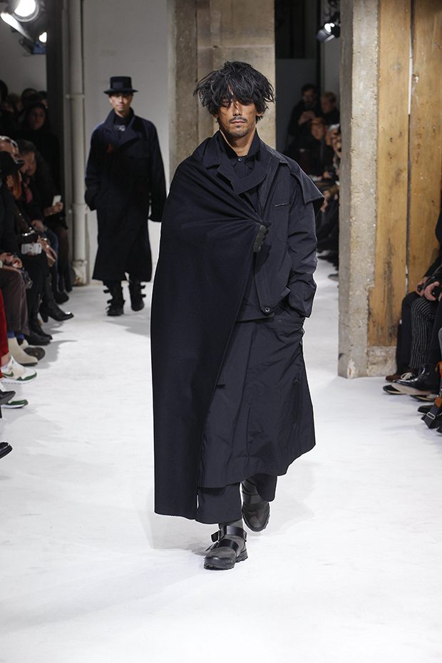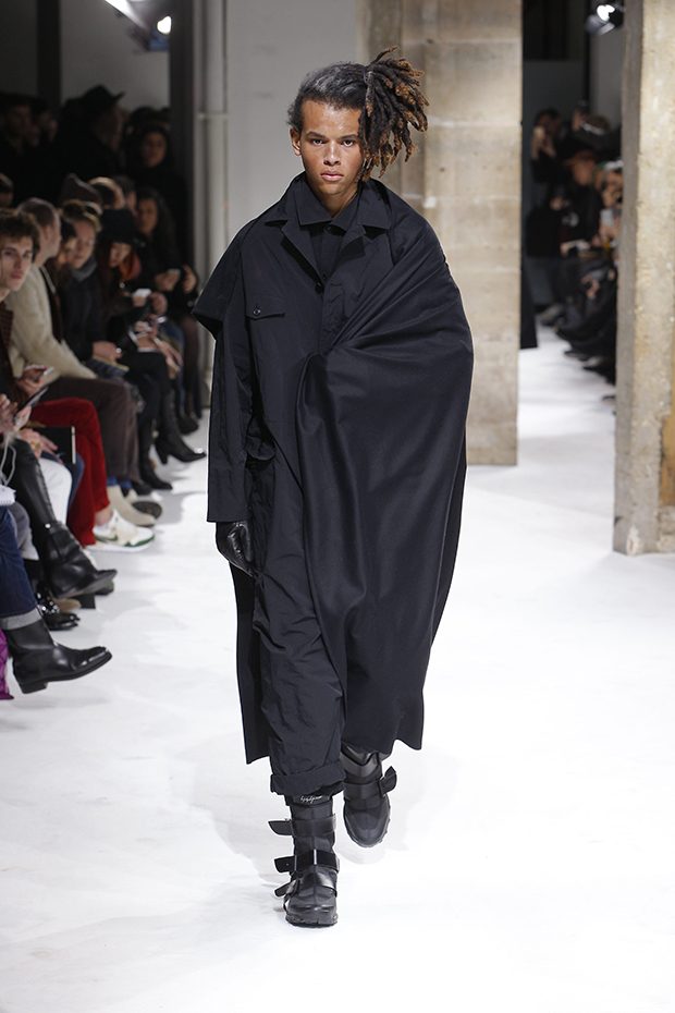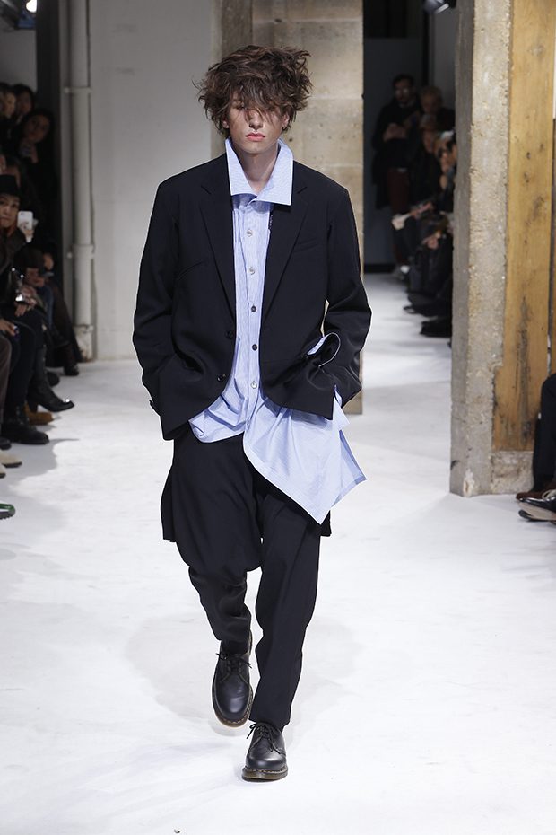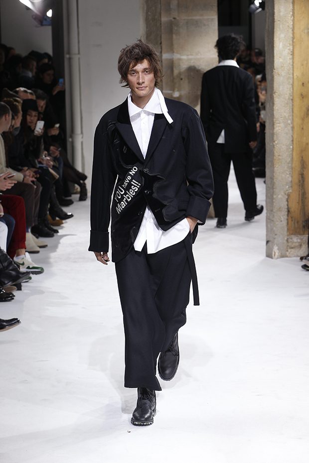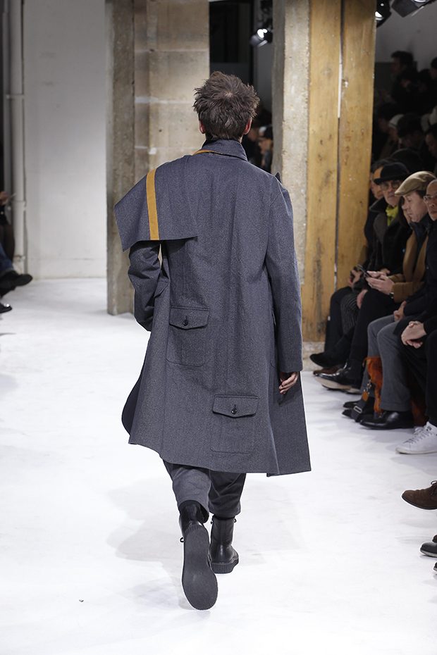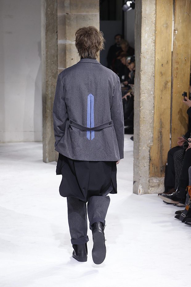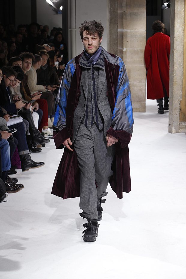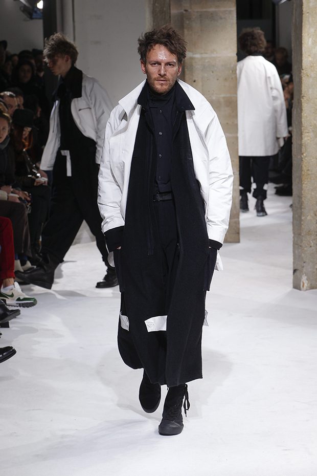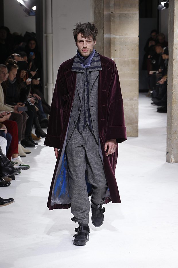 Yohji Yamamoto presented his Fall Winter 2017.18 collection during the Paris Fashion Week. Inspired by work uniforms and the power of the body, the new collection indicates the dynamics of XXI century life. With the slogans The Times Are Changing Too Fast and Save the manufacturing workers patched on jackets, the designer tried to point out on his dissatisfaction with the world where money makes money and to show his admiration for the men using their own bodies to make money.