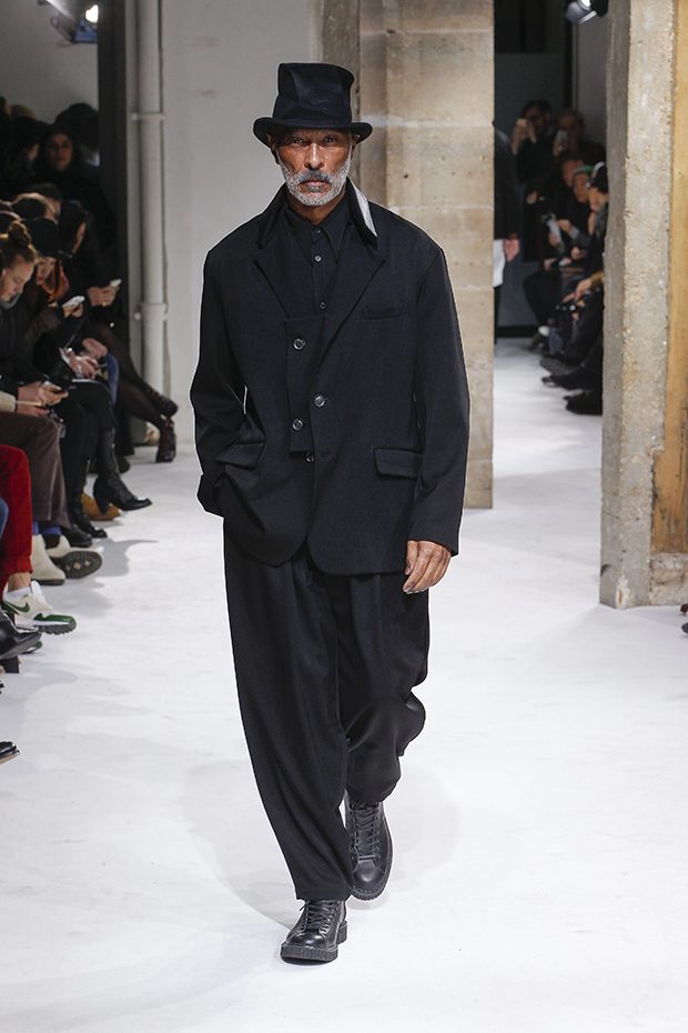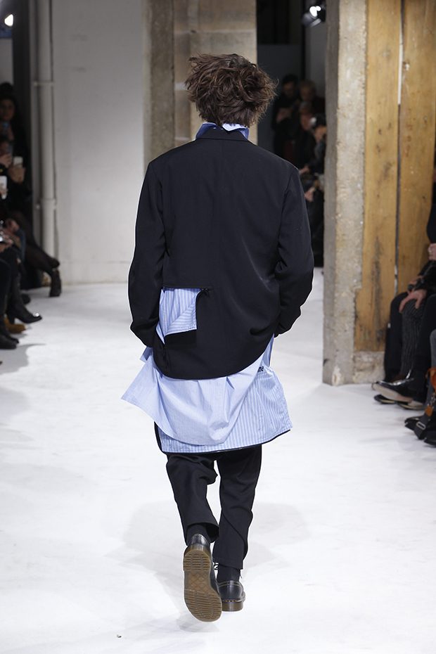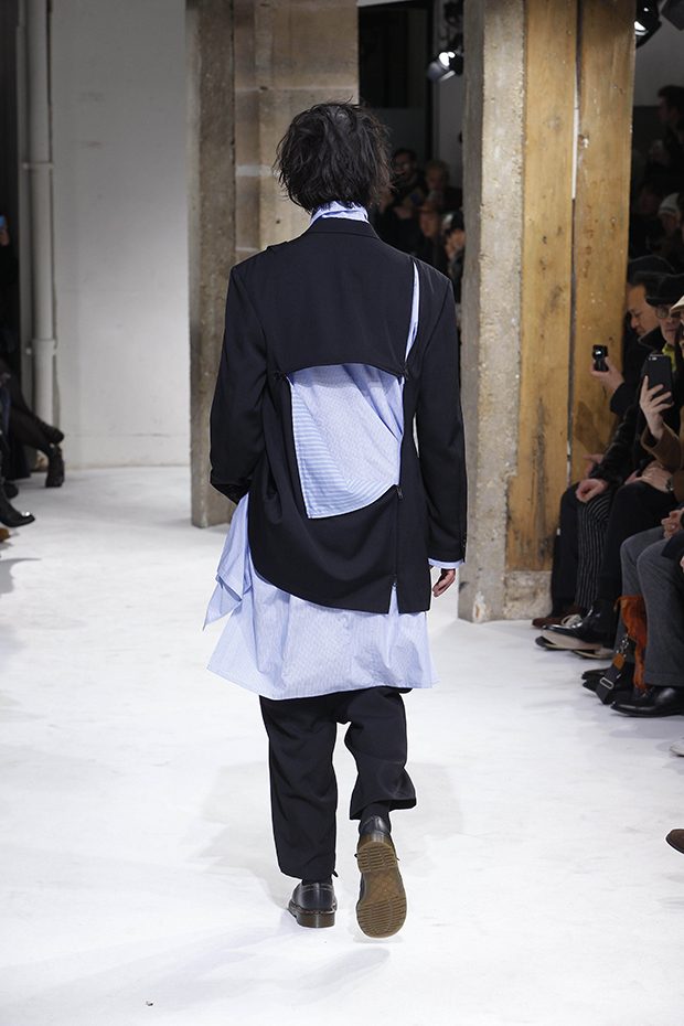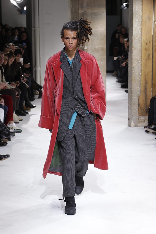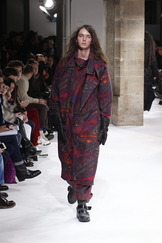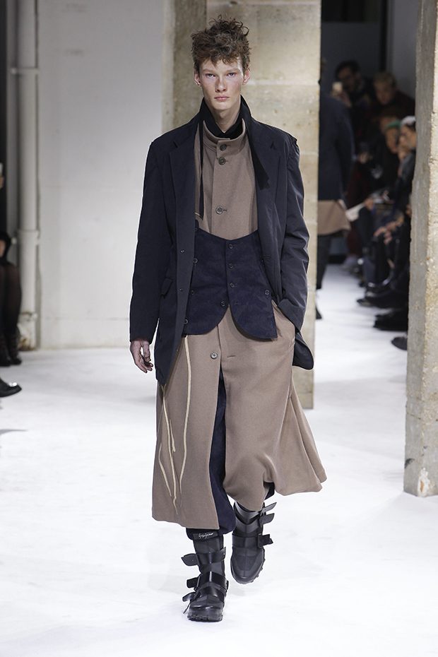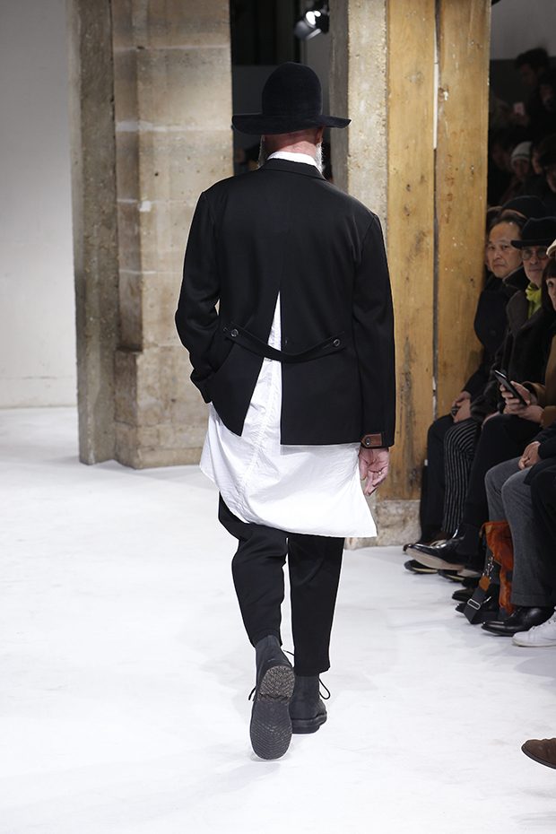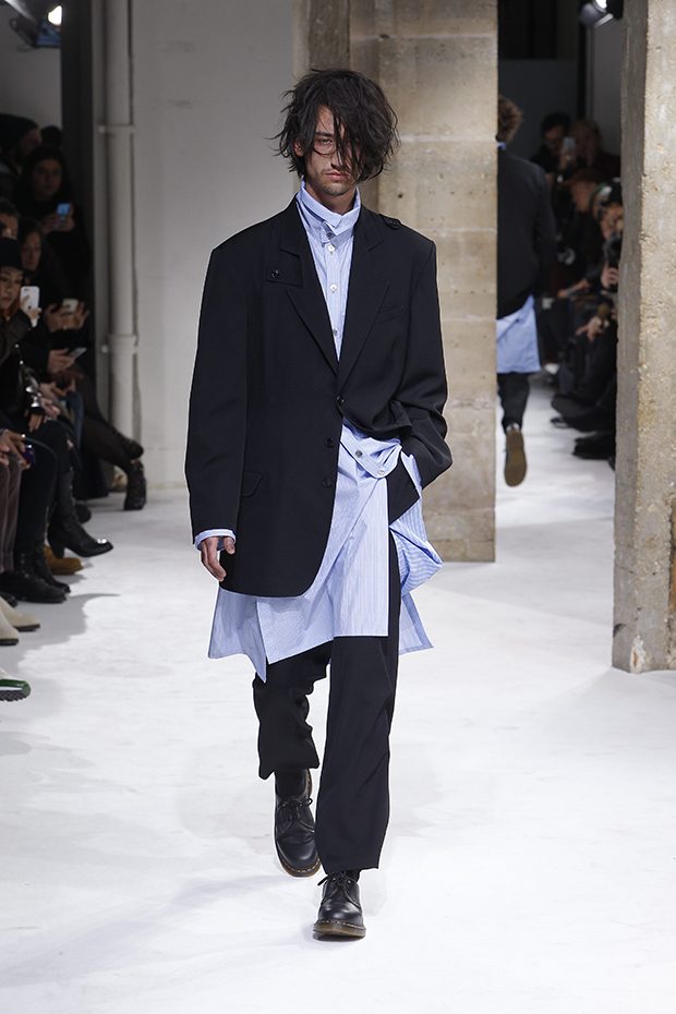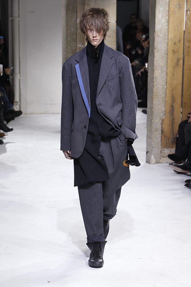 Yohji Yamamoto presented his Fall Winter 2017.18 collection during the Paris Fashion Week. Inspired by work uniforms and the power of the body, the new collection indicates the dynamics of XXI century life. With the slogans The Times Are Changing Too Fast and Save the manufacturing workers patched on jackets, the designer tried to point out on his dissatisfaction with the world where money makes money and to show his admiration for the men using their own bodies to make money.
