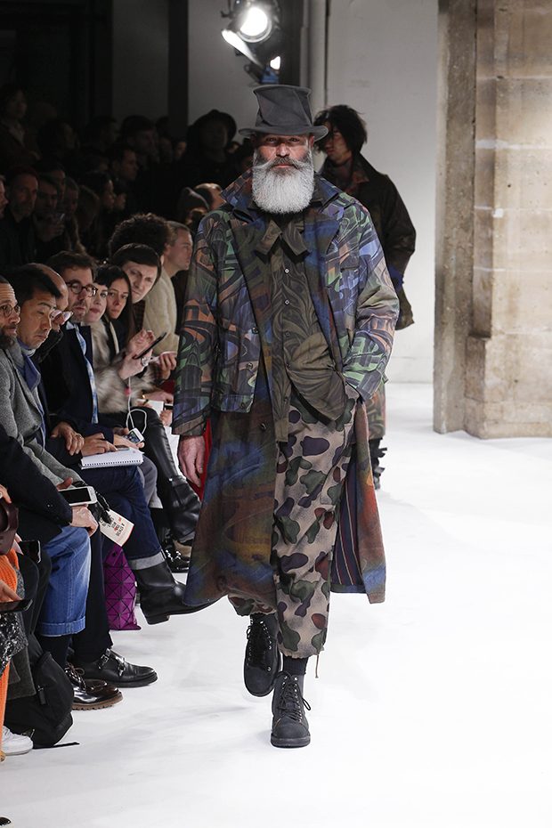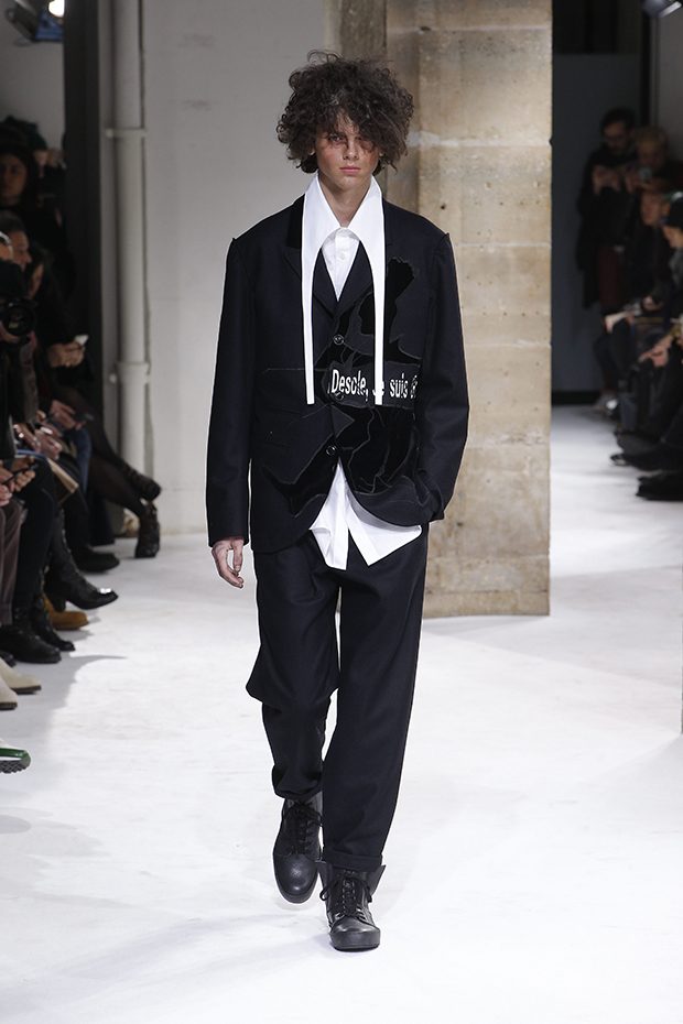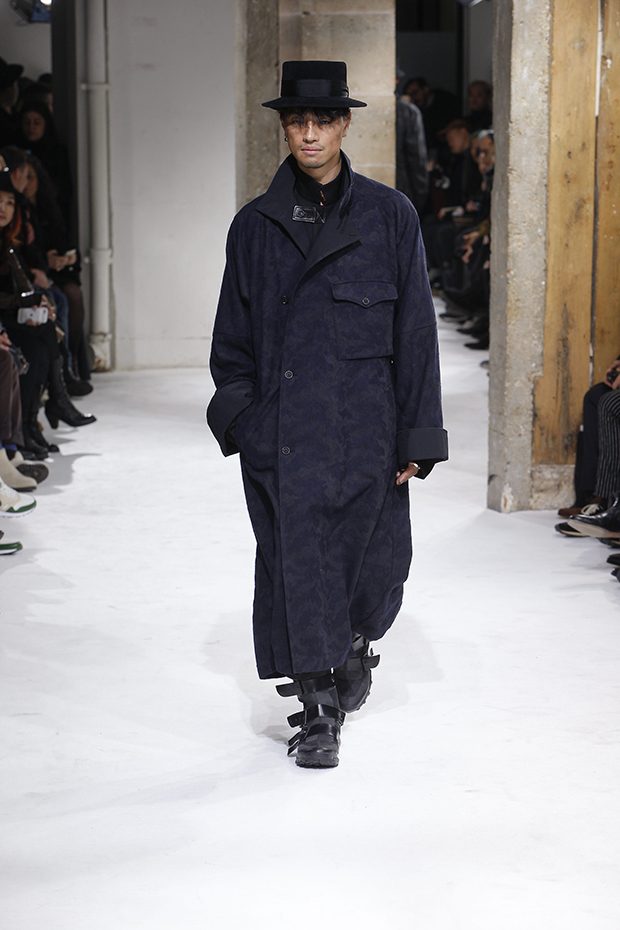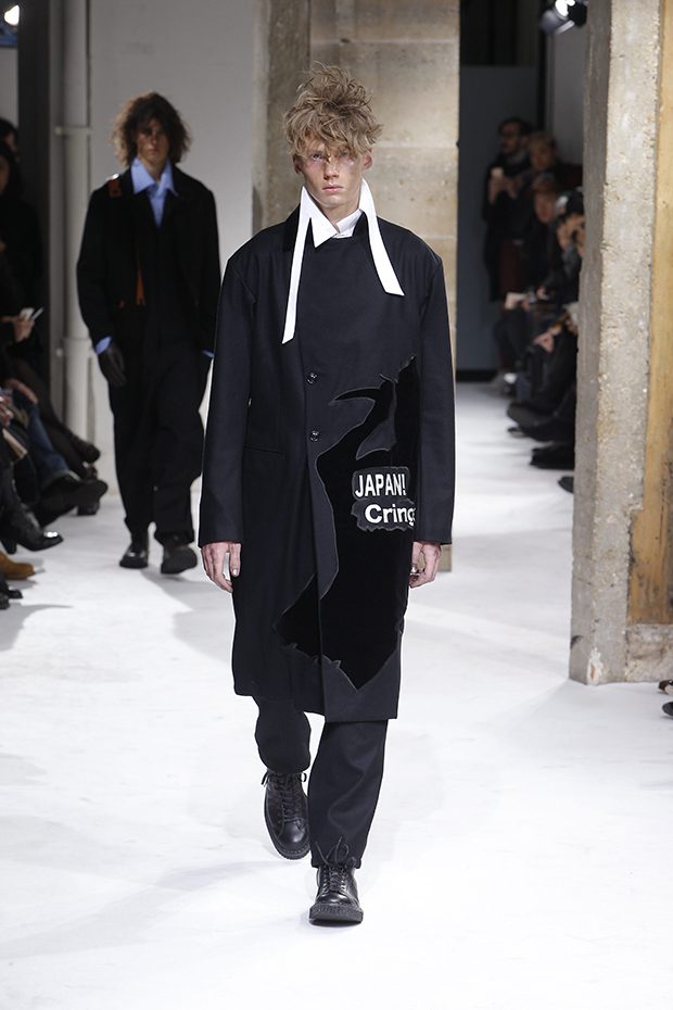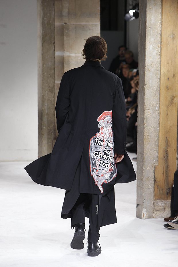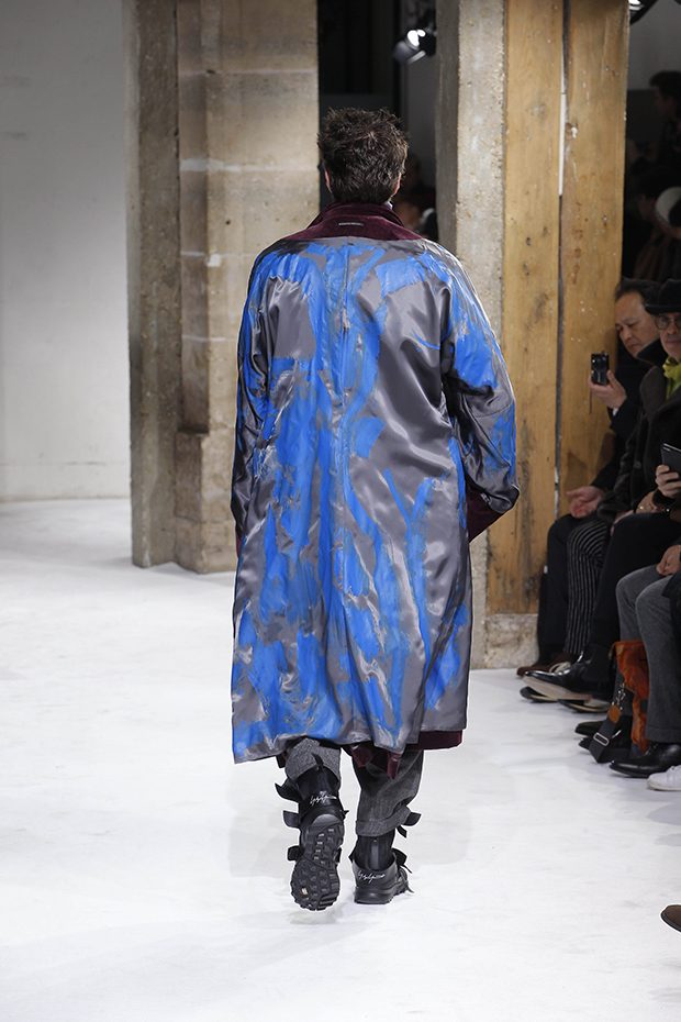 The collection features typical Yamamoto’s deconstructed and layered looks – hand painted duster coats, boxy jackets, velvet robe coats, jumpsuits, combined with the elegant leather details, camouflage prints and phrases patched onto jackets and coats.