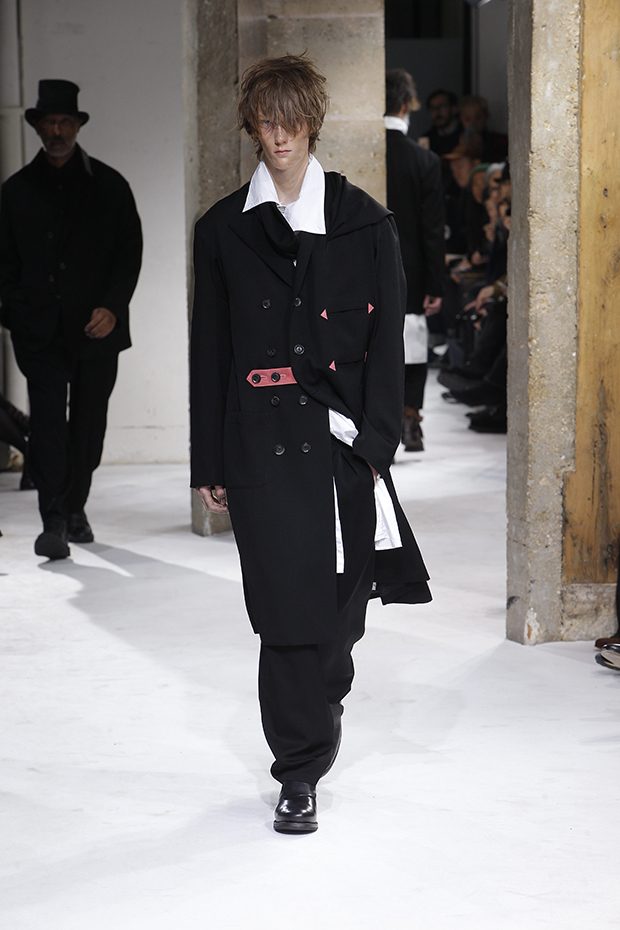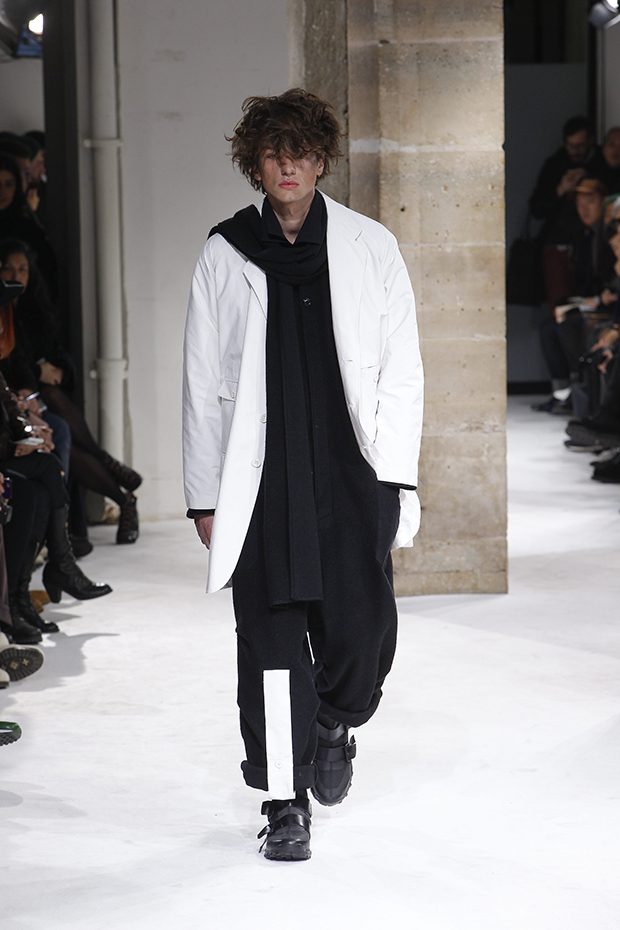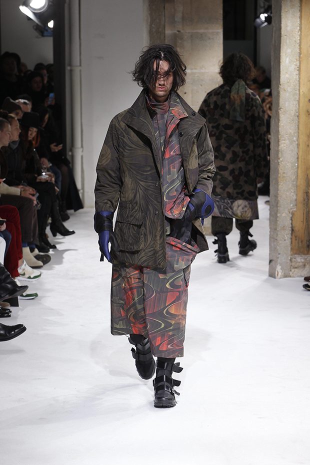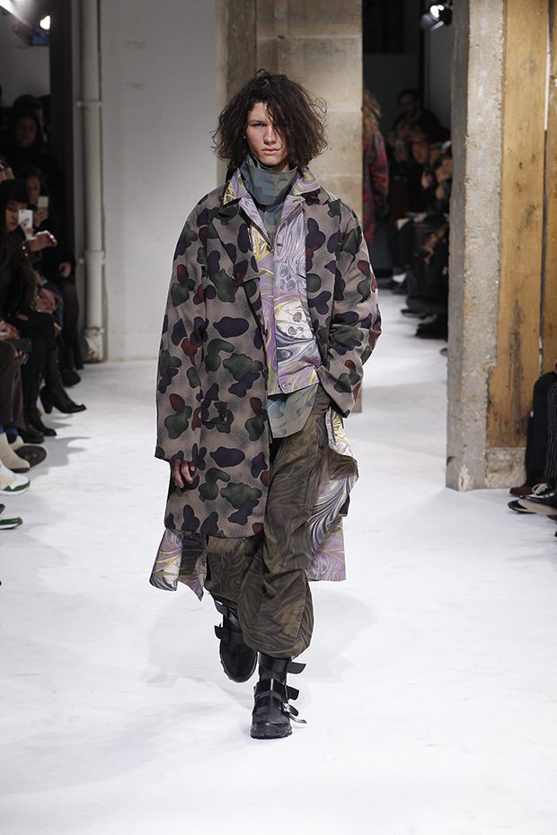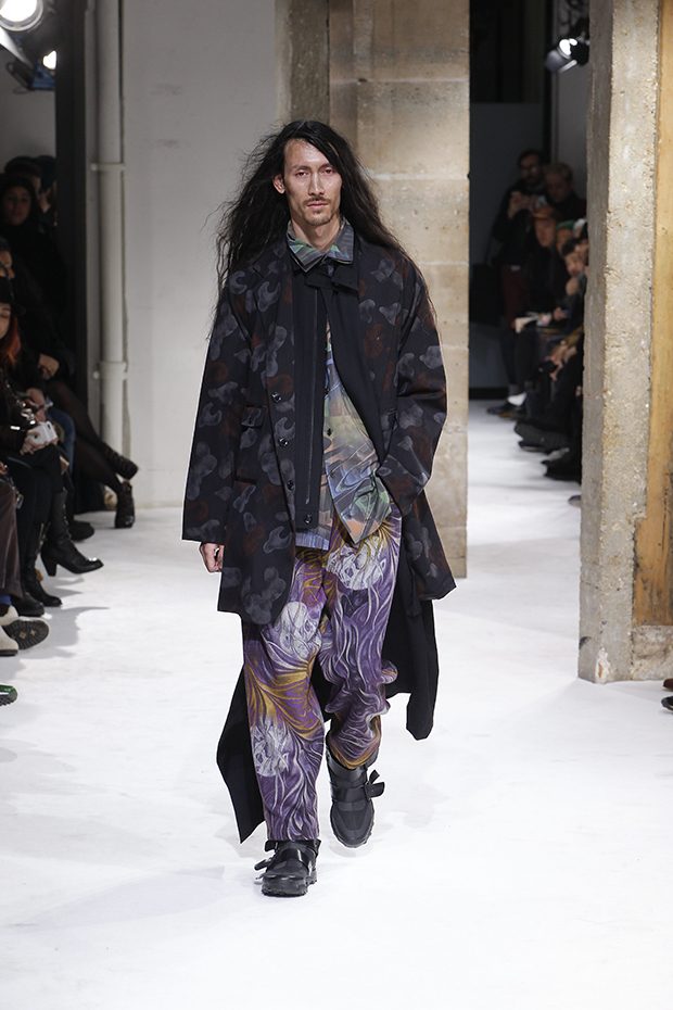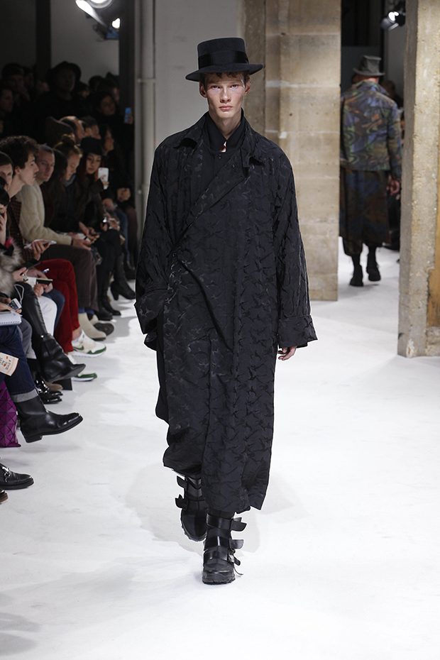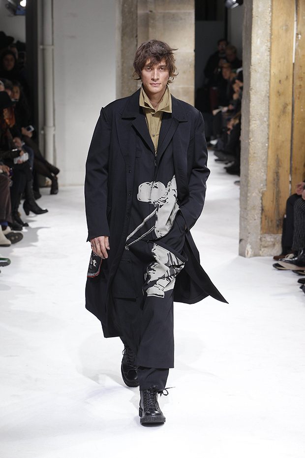 The collection features typical Yamamoto’s deconstructed and layered looks – hand painted duster coats, boxy jackets, velvet robe coats, jumpsuits, combined with the elegant leather details, camouflage prints and phrases patched onto jackets and coats.