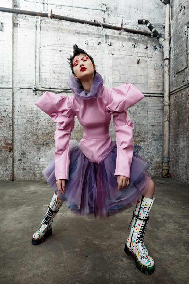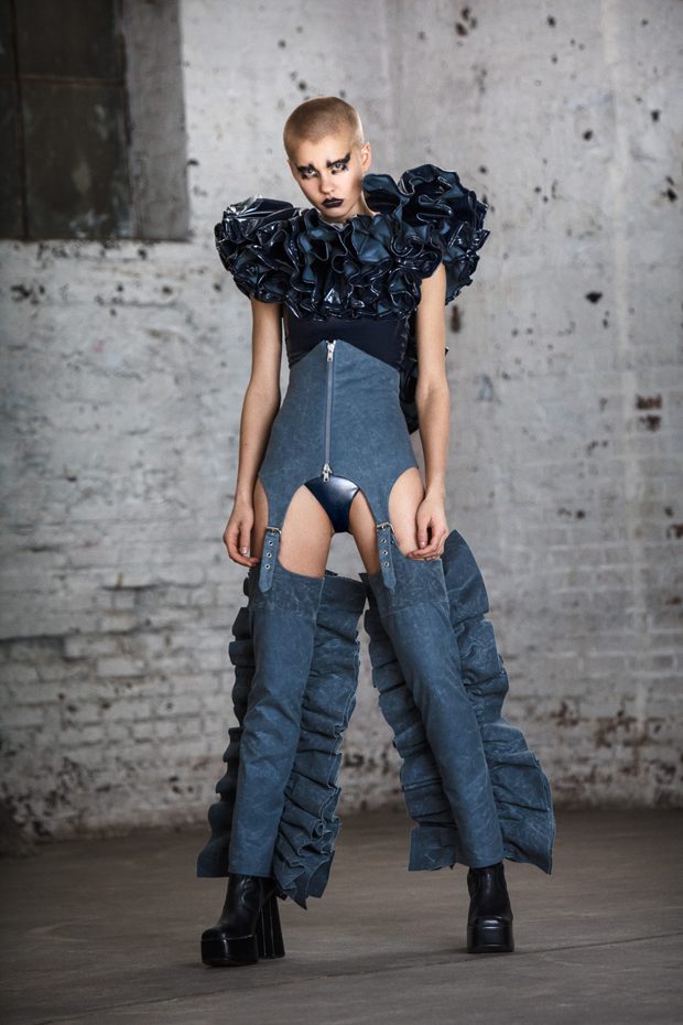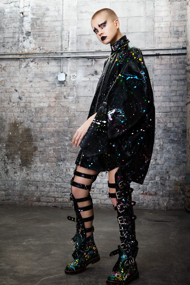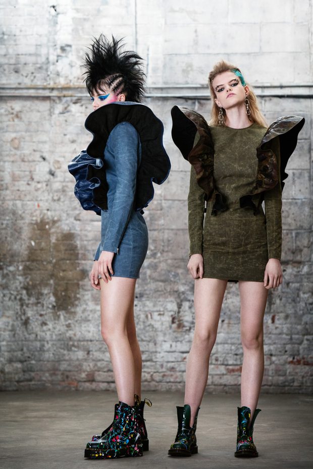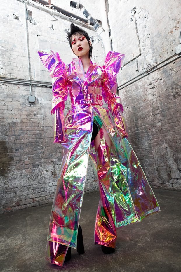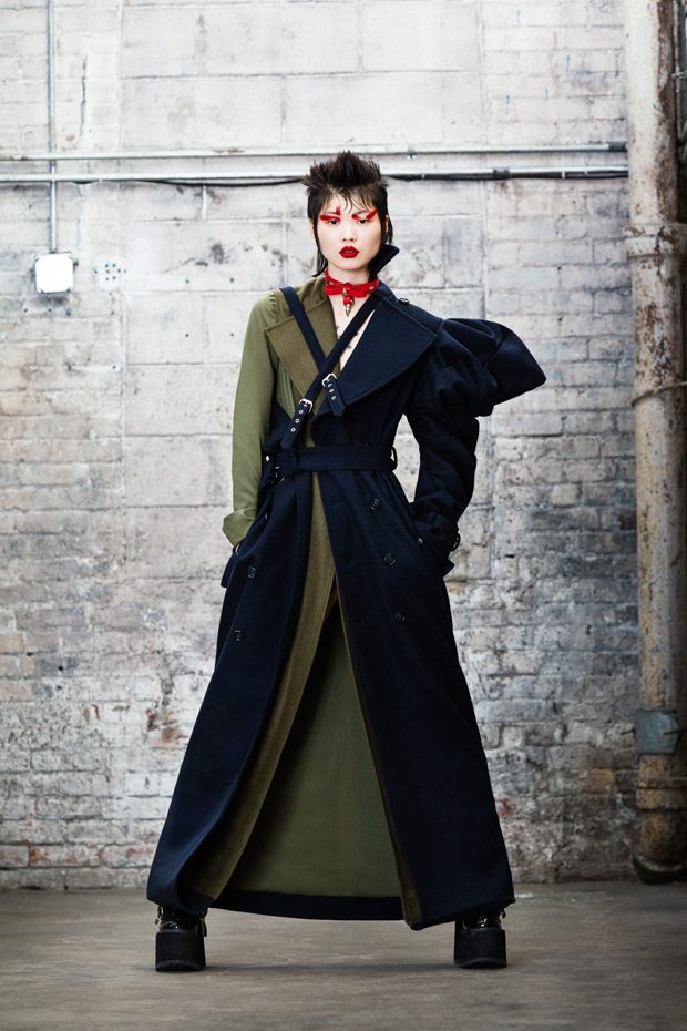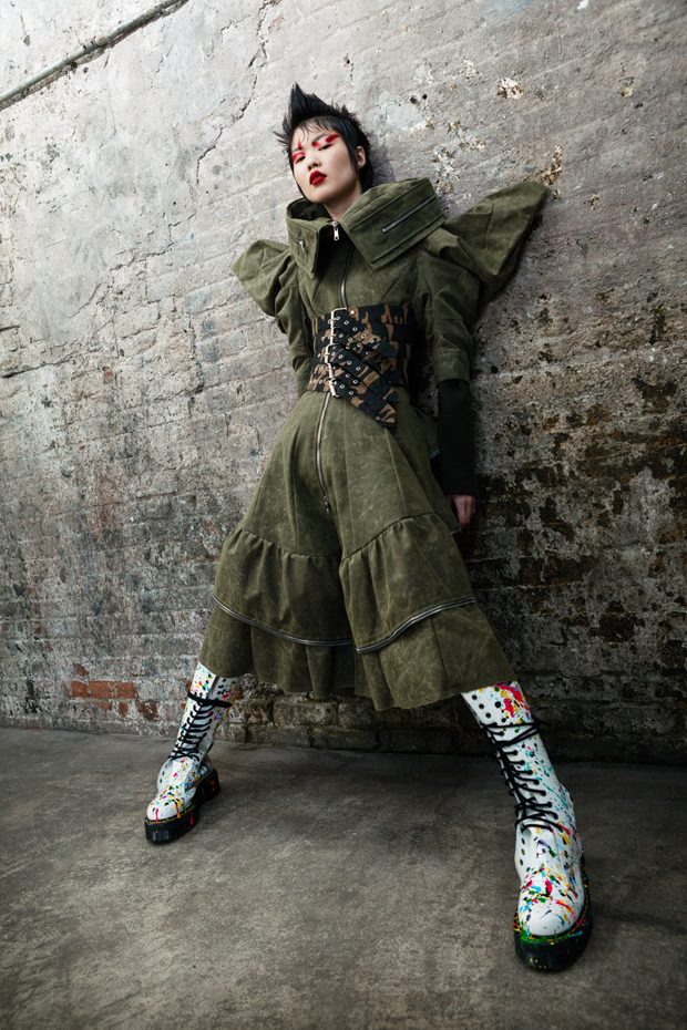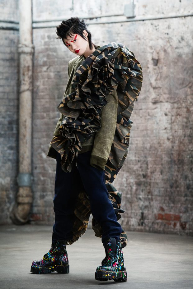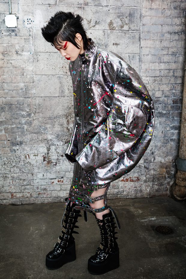 The collection, titled “Fable Warrior”, is a vibrant effort that uses innovative materials to thrust elements of bondage and punk into the future for a surreal demeanour. In keeping with the brand’s guiding ideology of elastic interpretation and daring innovation, Fable Warrior’s Punk-futuristic design philosophy draws inspiration from military livery and structured contours, incorporating Kaimin’s signature youthful ruckus. With this collection, Kaimin strives for a Yin and Yang balance to harmonise opposites, including: muscular vs soft fabrics; organic vs futuristic patterns; dark vs playful floral colours; and fluid curves vs geometric shapes. The unique materials – some rigid and some pliable – include a variety of leathers, ranging from glossy and iridescent to matte, as well as elegant synthetic ruffles, flowing mesh, and a mixture of hard-waxed twill. – from Kaimin