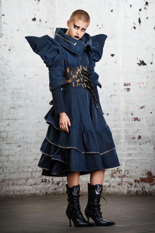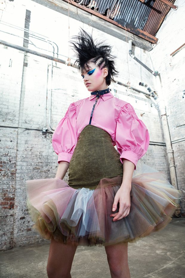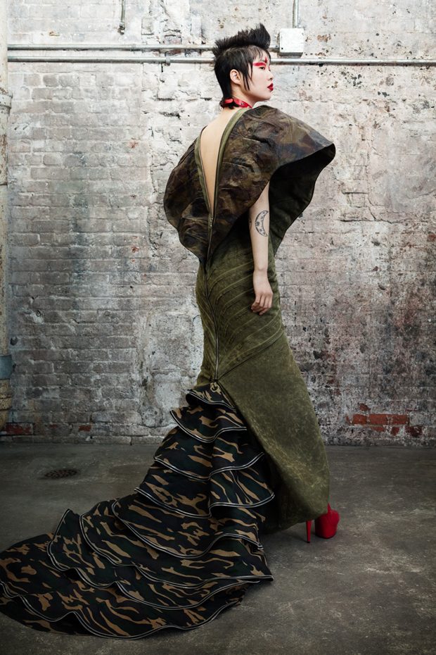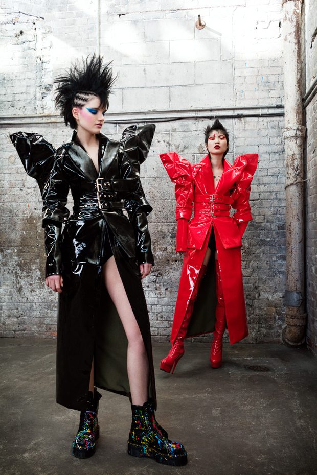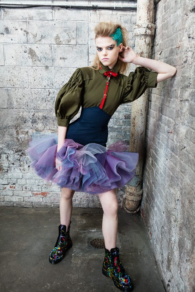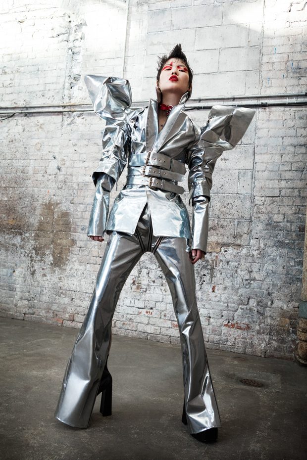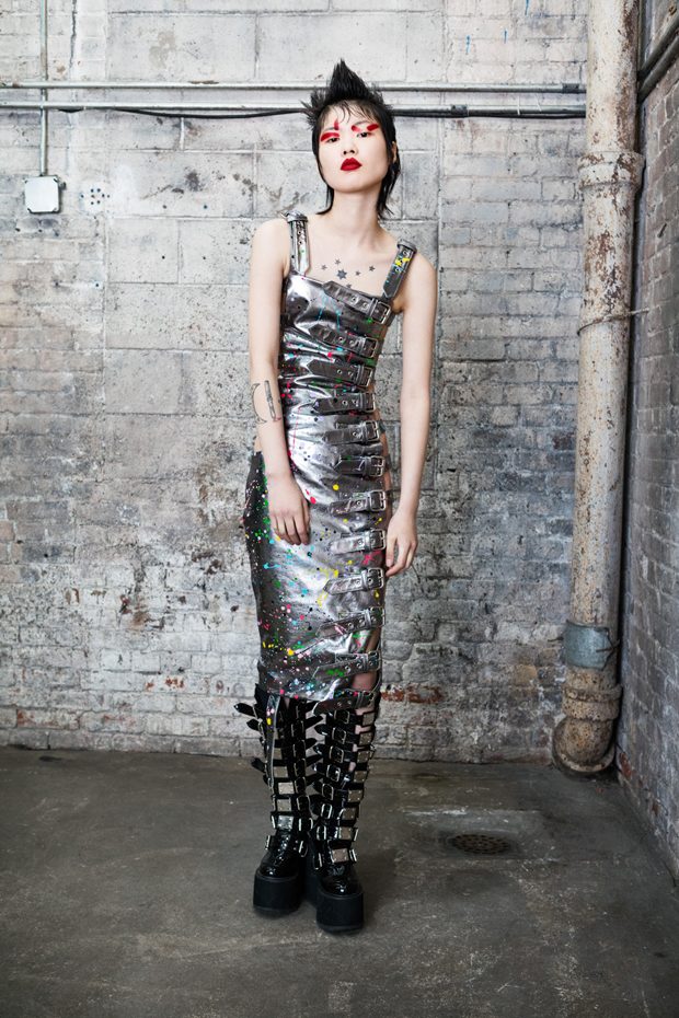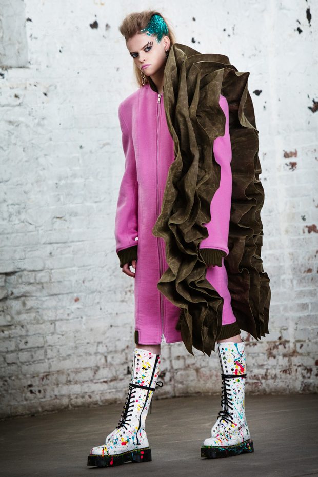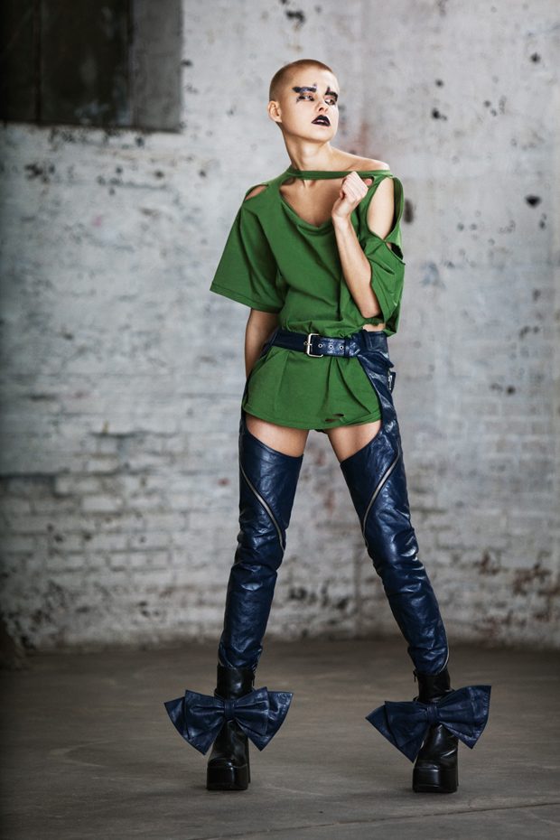 The collection, titled “Fable Warrior”, is a vibrant effort that uses innovative materials to thrust elements of bondage and punk into the future for a surreal demeanour. In keeping with the brand’s guiding ideology of elastic interpretation and daring innovation, Fable Warrior’s Punk-futuristic design philosophy draws inspiration from military livery and structured contours, incorporating Kaimin’s signature youthful ruckus. With this collection, Kaimin strives for a Yin and Yang balance to harmonise opposites, including: muscular vs soft fabrics; organic vs futuristic patterns; dark vs playful floral colours; and fluid curves vs geometric shapes. The unique materials – some rigid and some pliable – include a variety of leathers, ranging from glossy and iridescent to matte, as well as elegant synthetic ruffles, flowing mesh, and a mixture of hard-waxed twill. – from Kaimin
