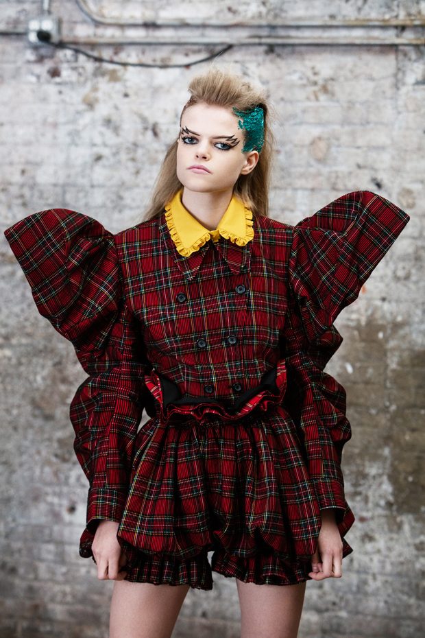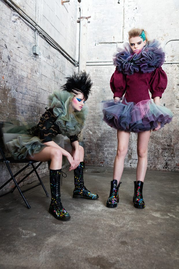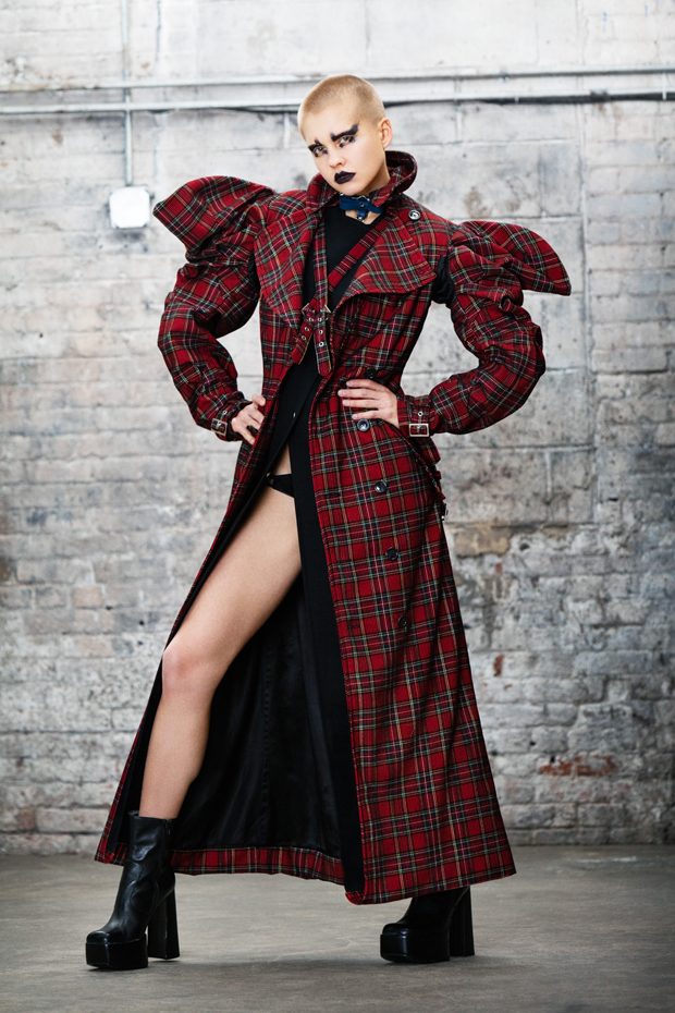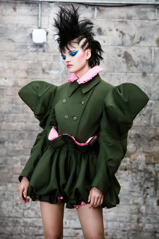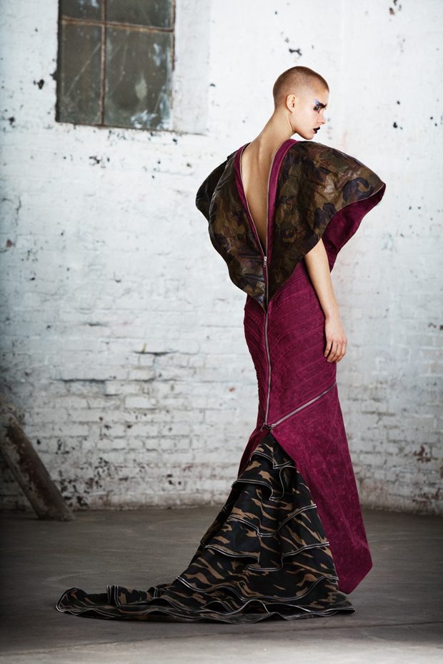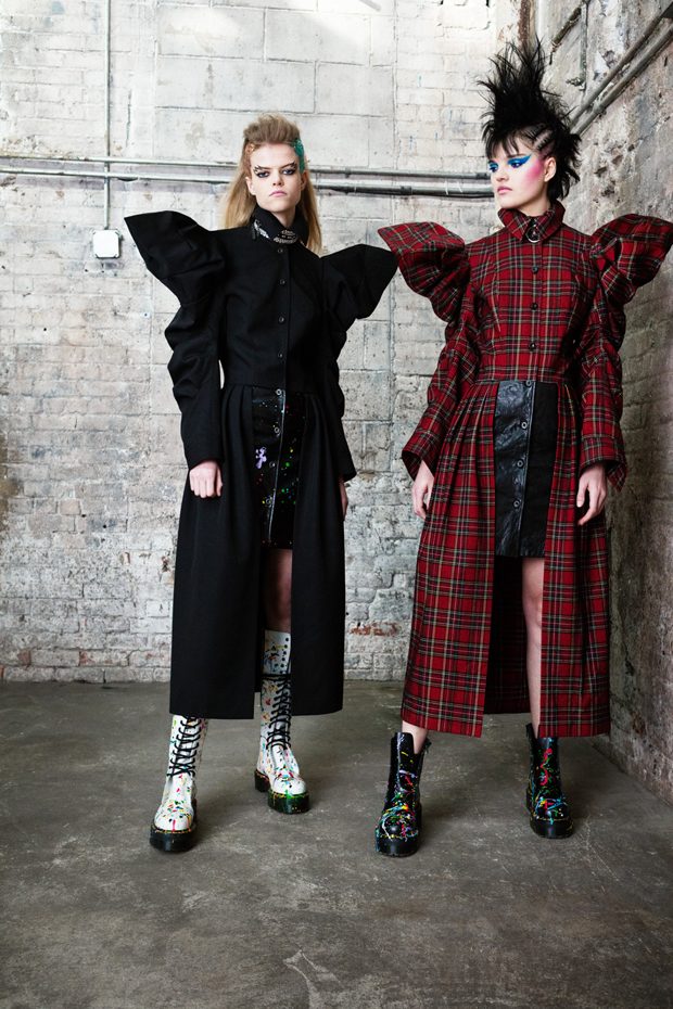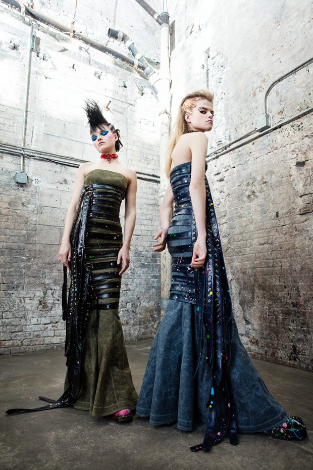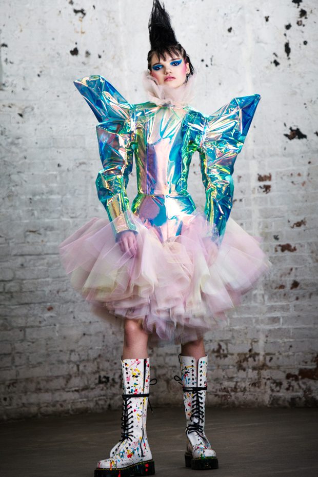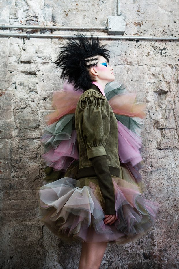 The collection, titled “Fable Warrior”, is a vibrant effort that uses innovative materials to thrust elements of bondage and punk into the future for a surreal demeanour. In keeping with the brand’s guiding ideology of elastic interpretation and daring innovation, Fable Warrior’s Punk-futuristic design philosophy draws inspiration from military livery and structured contours, incorporating Kaimin’s signature youthful ruckus. With this collection, Kaimin strives for a Yin and Yang balance to harmonise opposites, including: muscular vs soft fabrics; organic vs futuristic patterns; dark vs playful floral colours; and fluid curves vs geometric shapes. The unique materials – some rigid and some pliable – include a variety of leathers, ranging from glossy and iridescent to matte, as well as elegant synthetic ruffles, flowing mesh, and a mixture of hard-waxed twill. – from Kaimin
