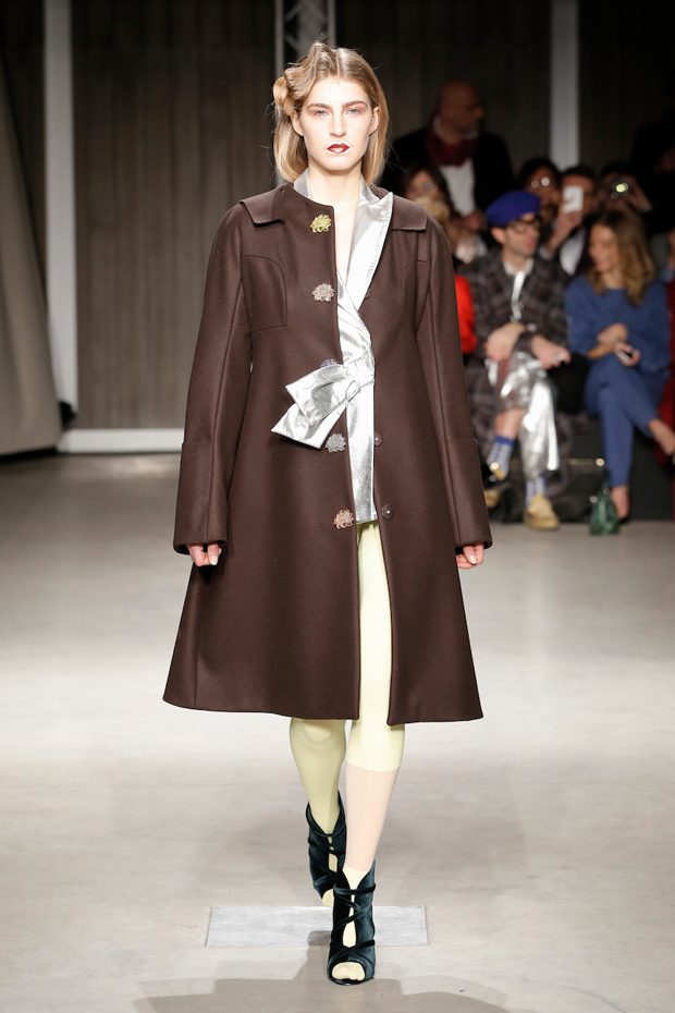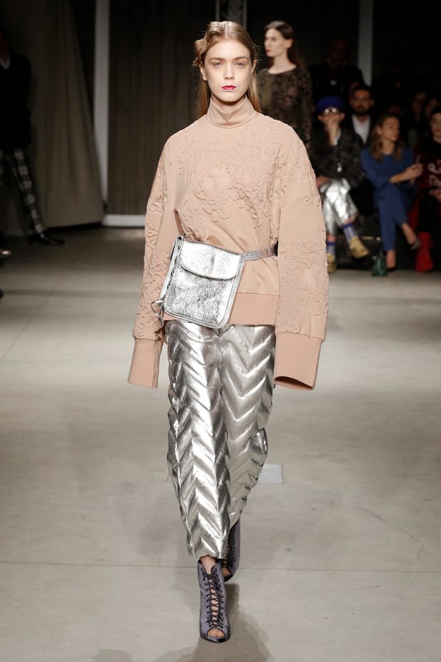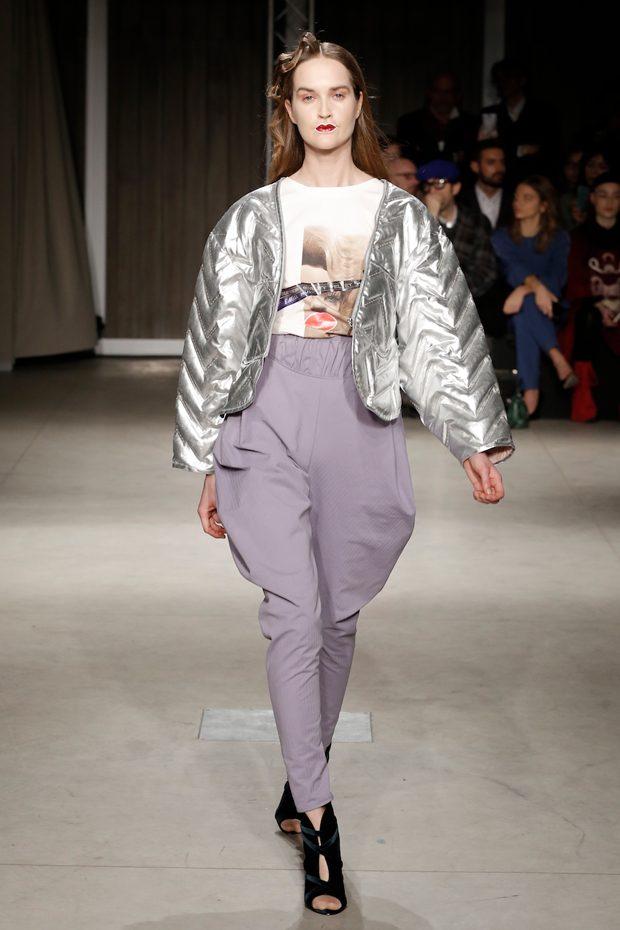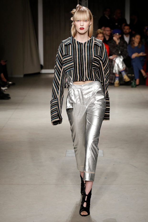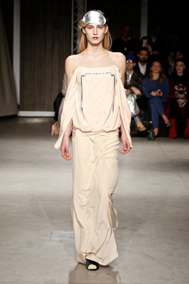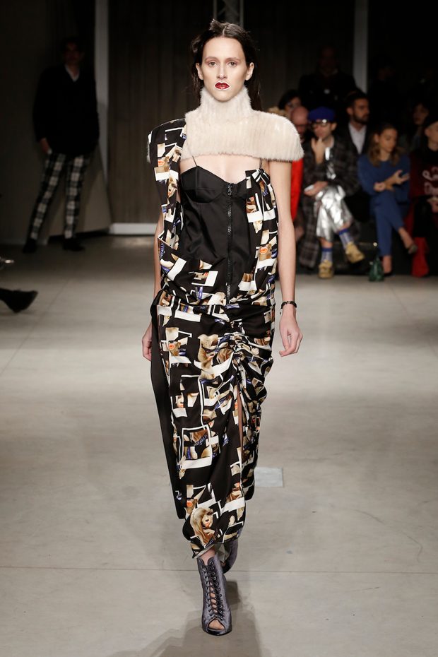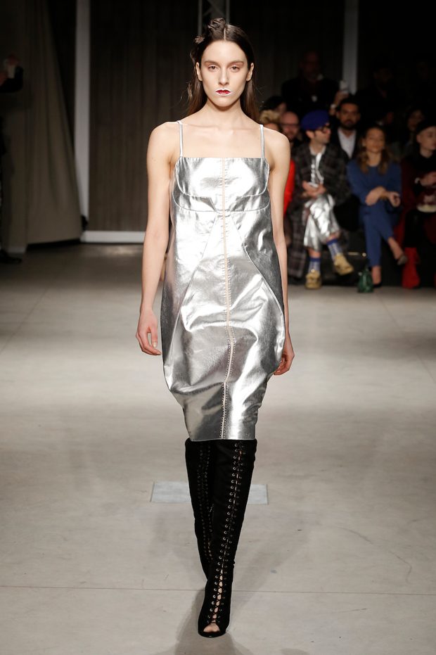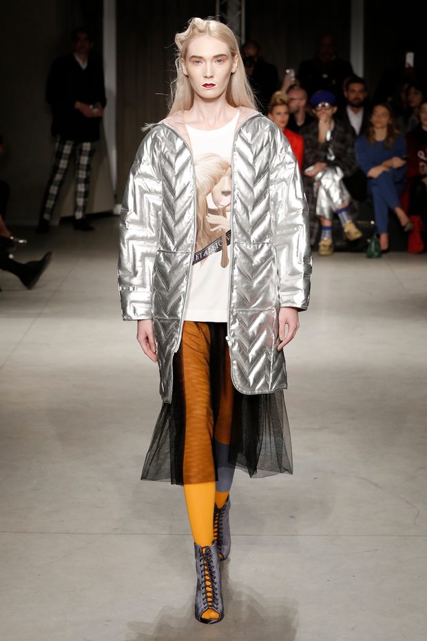 Tailored mocha-coloured coats wrap the linearity of the nude petticoat-dresses, which frame irregular plissé sealed by silver techno-taping, as the directly heat-sealed stuffed plumage. Romantic velvets with patterns recalling tangles of roses, like the perfume of old lace, come with elastic ropes stolen from the sport world. Artisanal and technological coexist in maxi thermoformed floral merinos pullovers. Coated silver decorates geometric intarsia underlined by sartorial stitchings and details of three-dimensional bows, while the t shirts shout off the pop slogan “metallic velvet” in ribbons selvage on synthetic faces. The same faces that fluidly move surfaces in prints of decomposed polaroids and draped together with neoprene corsetry. – from Alberto Zambelli