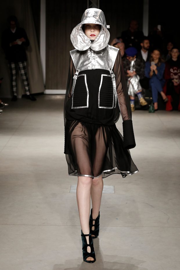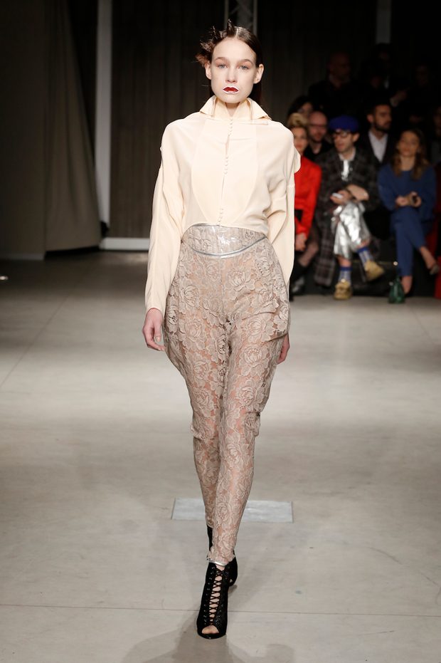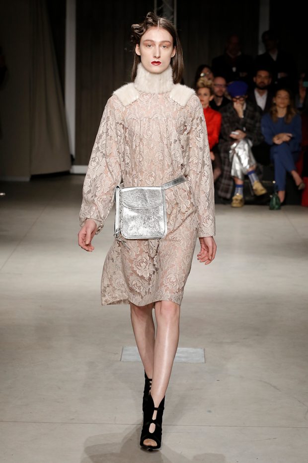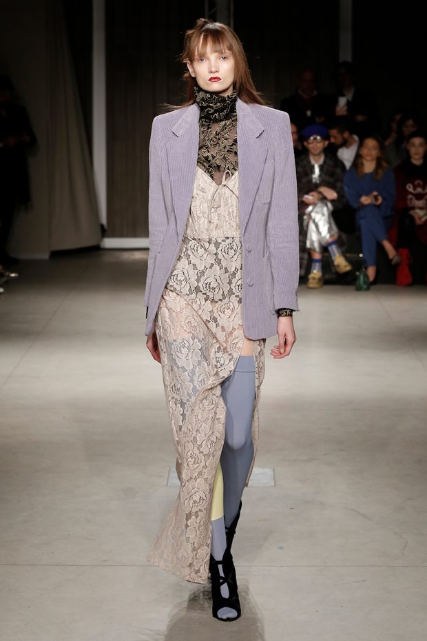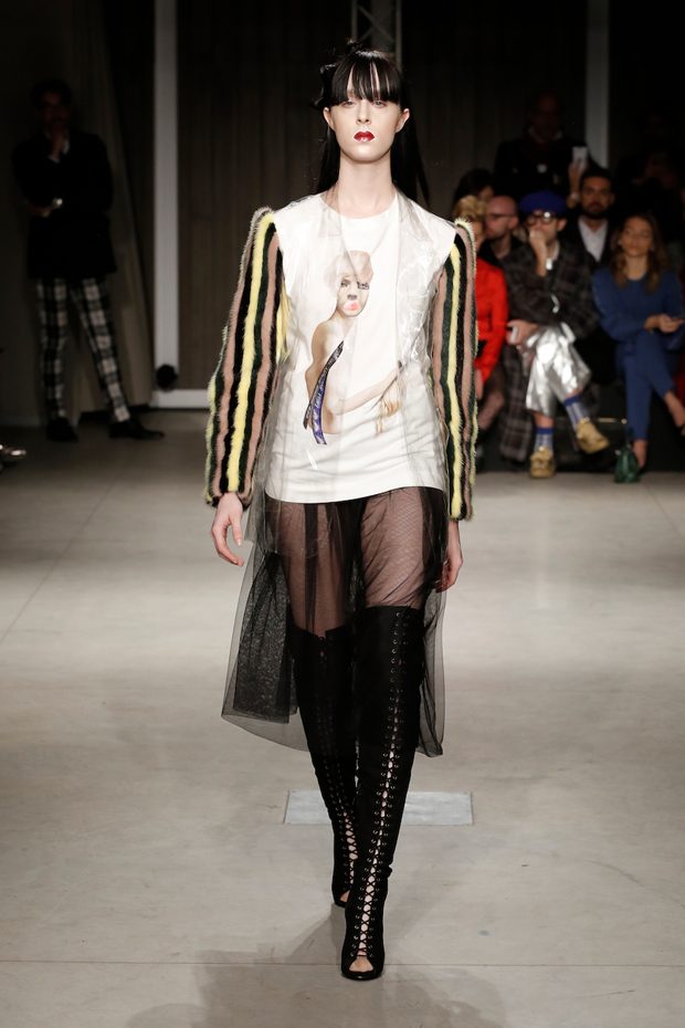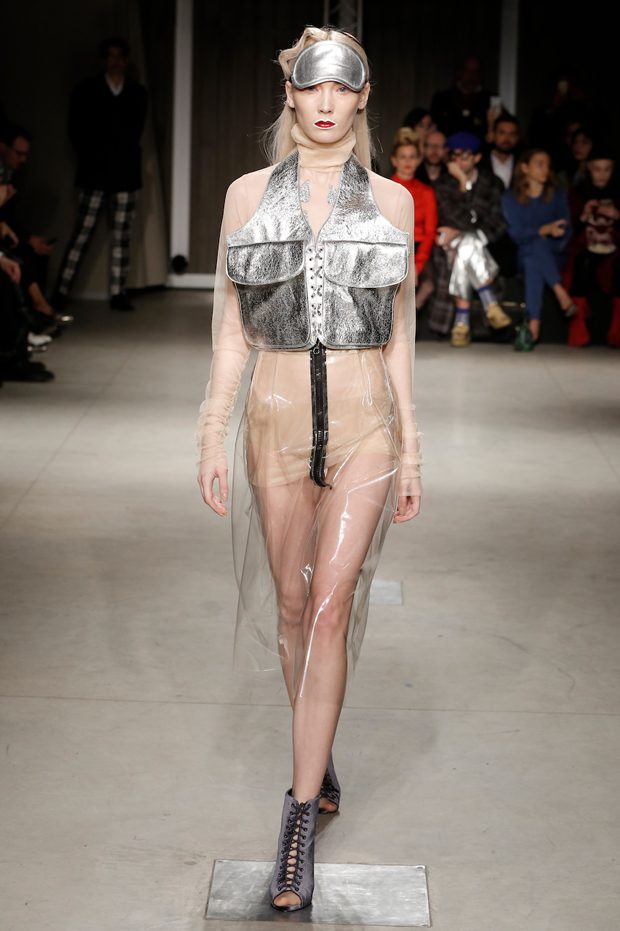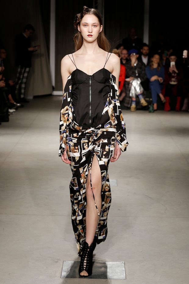 Tailored mocha-coloured coats wrap the linearity of the nude petticoat-dresses, which frame irregular plissé sealed by silver techno-taping, as the directly heat-sealed stuffed plumage. Romantic velvets with patterns recalling tangles of roses, like the perfume of old lace, come with elastic ropes stolen from the sport world. Artisanal and technological coexist in maxi thermoformed floral merinos pullovers. Coated silver decorates geometric intarsia underlined by sartorial stitchings and details of three-dimensional bows, while the t shirts shout off the pop slogan “metallic velvet” in ribbons selvage on synthetic faces. The same faces that fluidly move surfaces in prints of decomposed polaroids and draped together with neoprene corsetry. – from Alberto Zambelli
