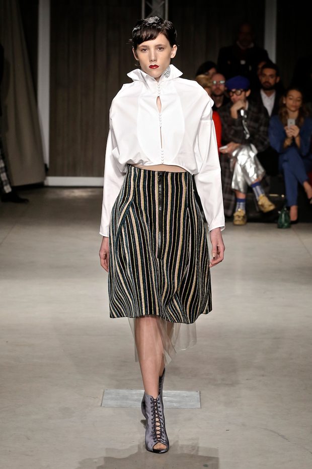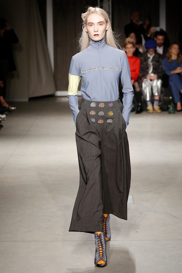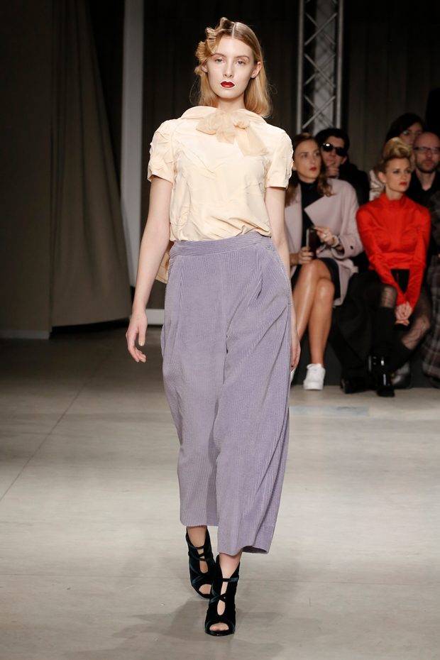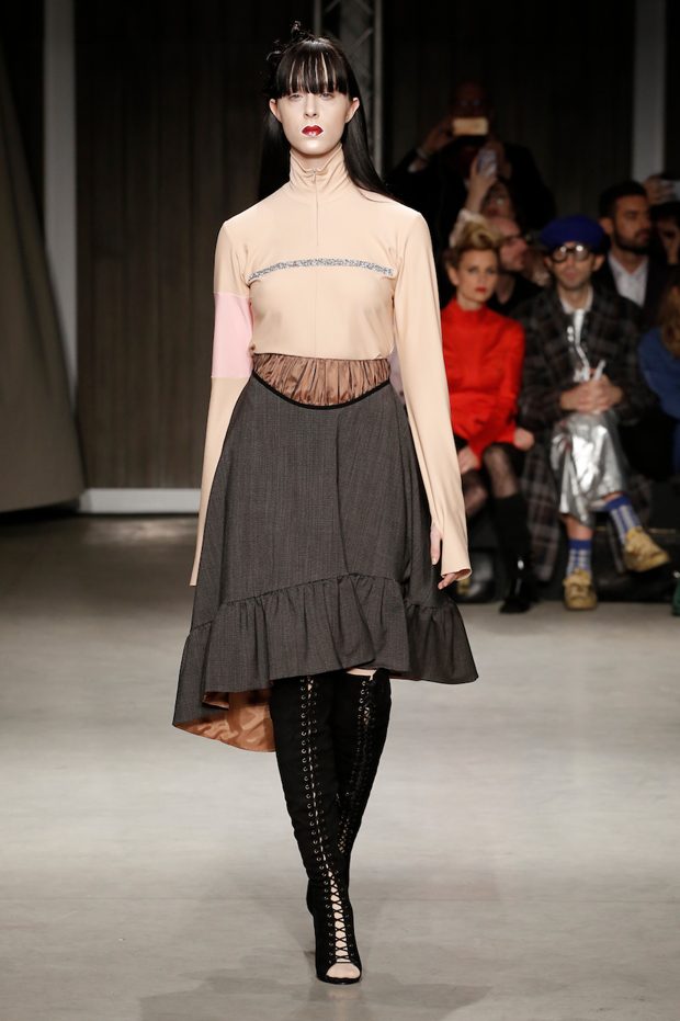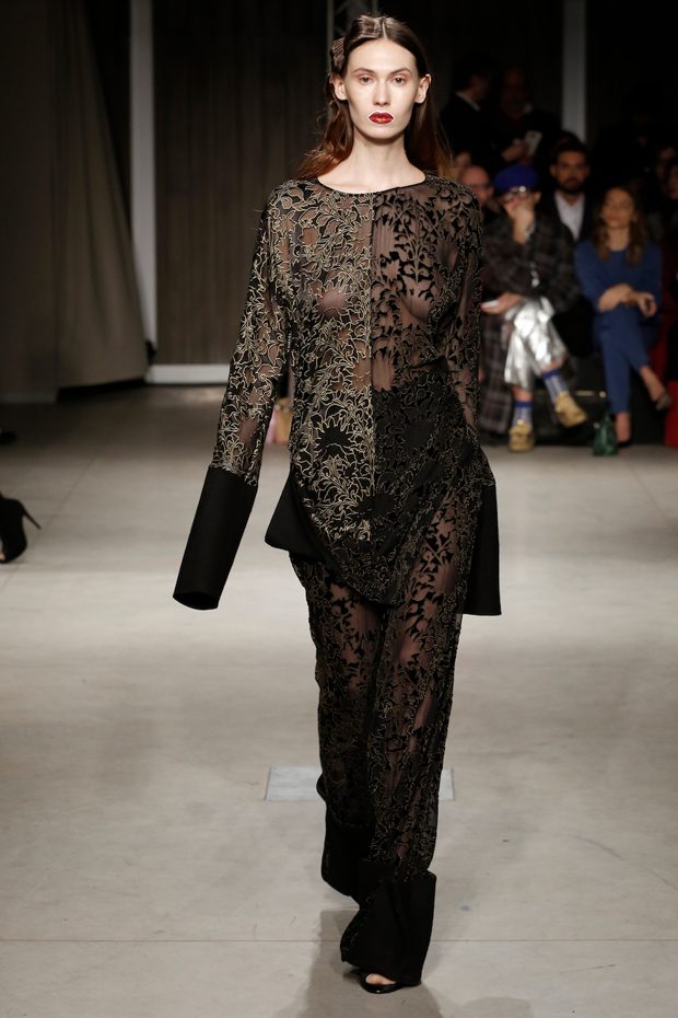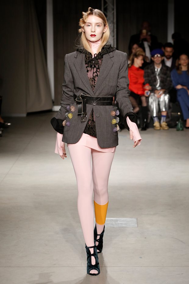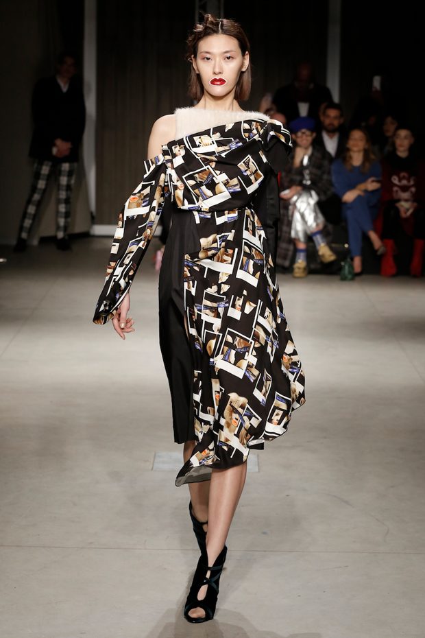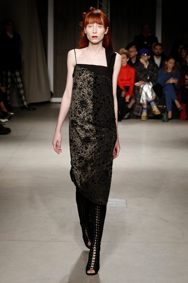 Tailored mocha-coloured coats wrap the linearity of the nude petticoat-dresses, which frame irregular plissé sealed by silver techno-taping, as the directly heat-sealed stuffed plumage. Romantic velvets with patterns recalling tangles of roses, like the perfume of old lace, come with elastic ropes stolen from the sport world. Artisanal and technological coexist in maxi thermoformed floral merinos pullovers. Coated silver decorates geometric intarsia underlined by sartorial stitchings and details of three-dimensional bows, while the t shirts shout off the pop slogan “metallic velvet” in ribbons selvage on synthetic faces. The same faces that fluidly move surfaces in prints of decomposed polaroids and draped together with neoprene corsetry. – from Alberto Zambelli