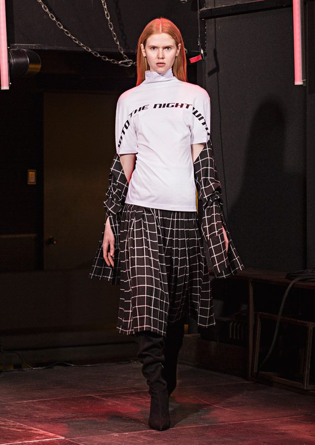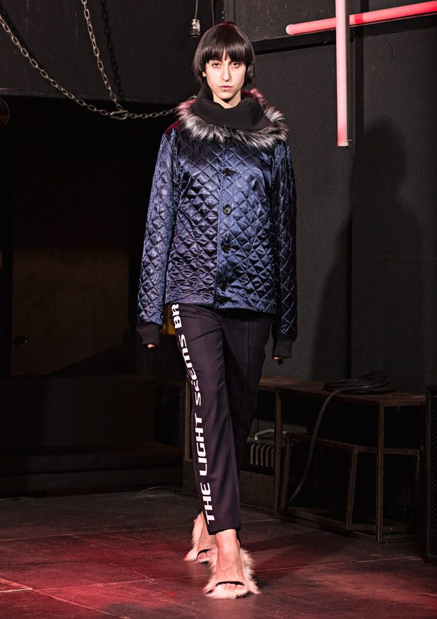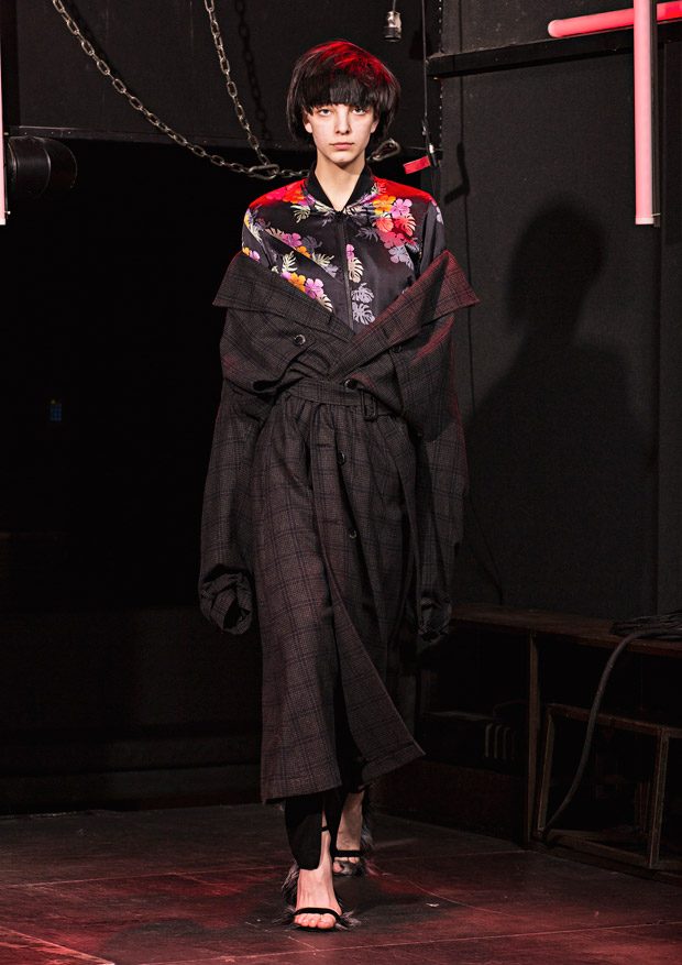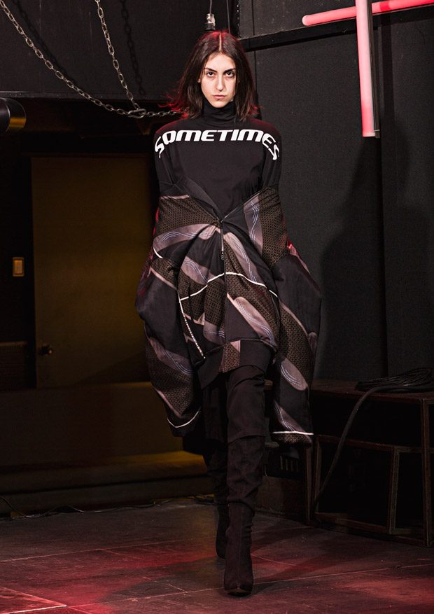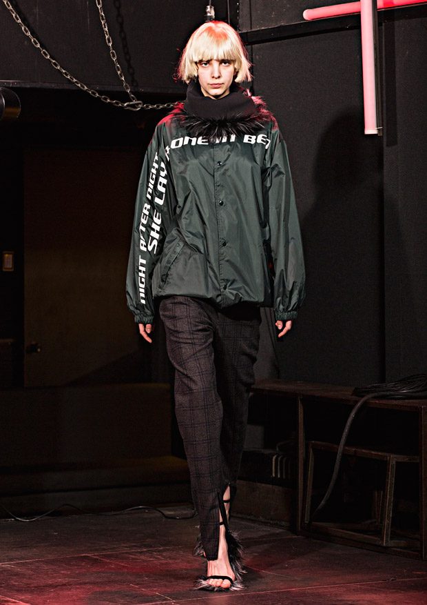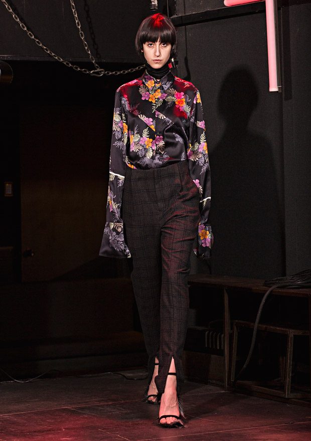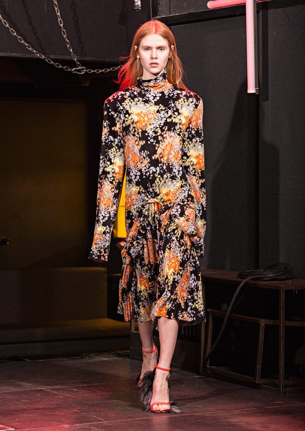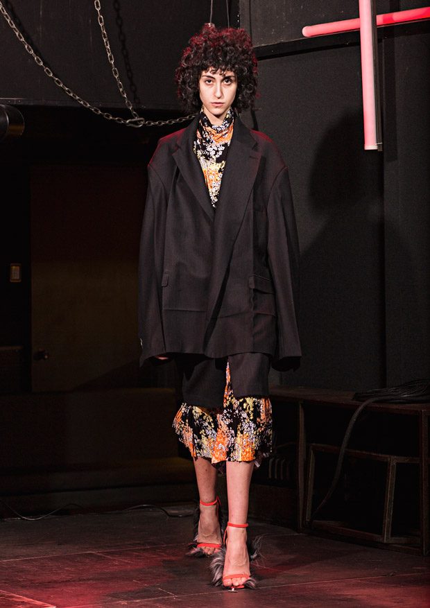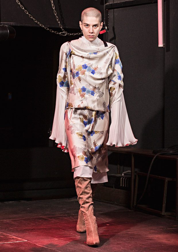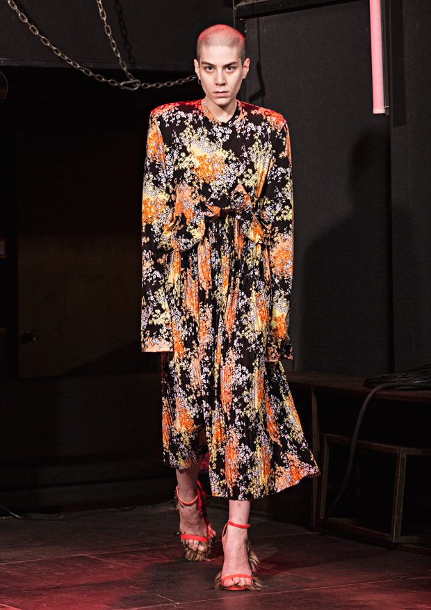 “A girl that unexpectedly links diverse references such as a classic pop band like the cure, and a children’s fantasy books author, Penelope Farmer, is the lead character ?? Angelos Frentzos’ women’s collection for fall-winter 2017-18. Following his men’s collection, Frentzos continues to explore classic tailoring with precise cut but modern details in juxtaposition to the blocked fluidity of traditionally more feminine fabrics. Oversized bags that suggest the life of a contemporary nomad and padded outerwear for protection compliment phrases from “charlotte sometimes” by the cure, that appear printed on some of the garments of the collection. The woman of this collection is dressed in micro pleats that give movement and a strong image and in oversized proportions, a reference to the out of scale doll parts. Bold colors and retro scarf graphics in silk twill offer a touch of femininity, while sauvage flowers and college references in bombers and knits are a sign of youth. Standards in every Frentzos collection, like the classic bomber jacket, are combined with dresses in lurex, silk georgette and floral prints, for a contemporary woman that relates to the lyric “sometimes i’m dreaming”.”