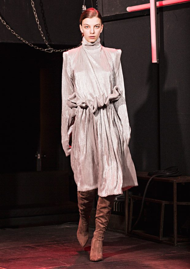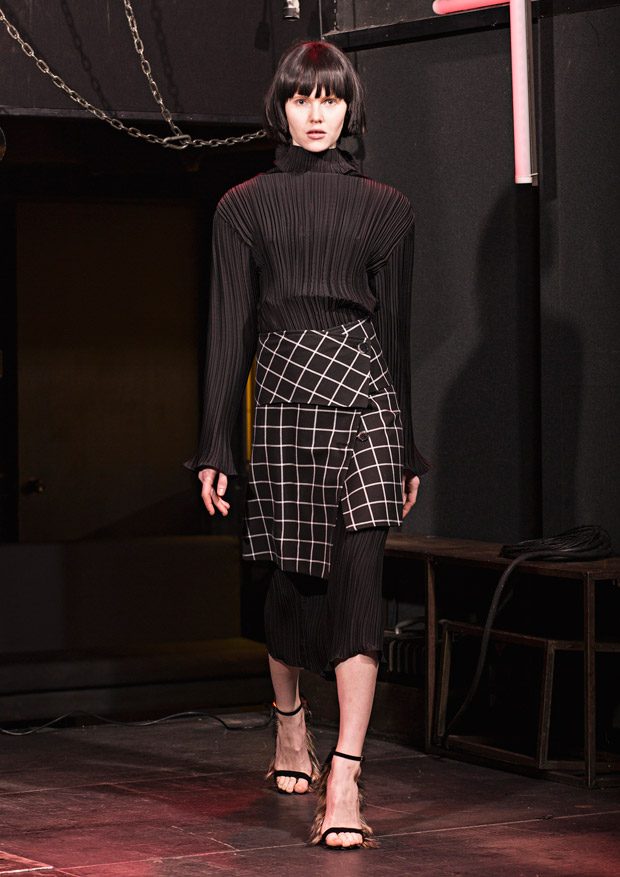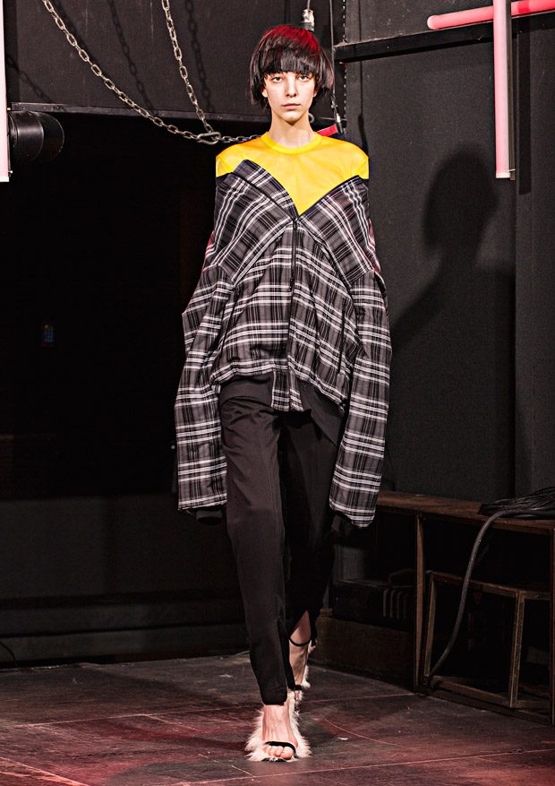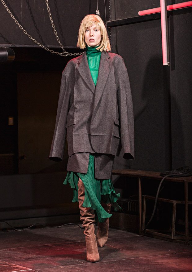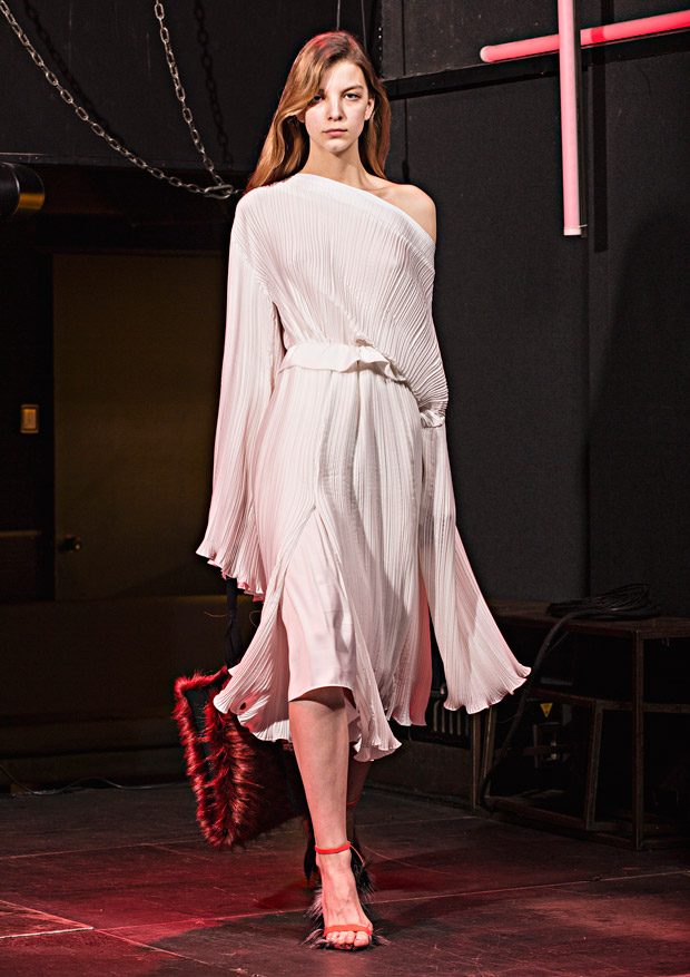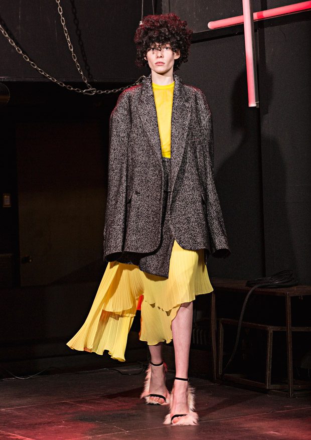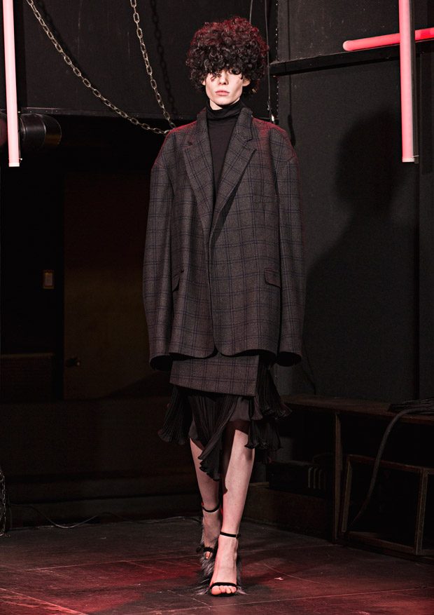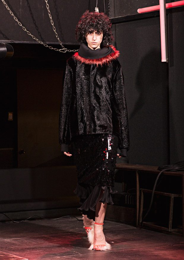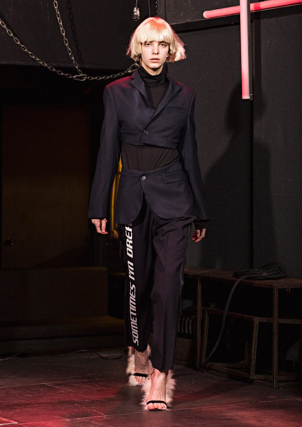 “A girl that unexpectedly links diverse references such as a classic pop band like the cure, and a children’s fantasy books author, Penelope Farmer, is the lead character ?? Angelos Frentzos’ women’s collection for fall-winter 2017-18. Following his men’s collection, Frentzos continues to explore classic tailoring with precise cut but modern details in juxtaposition to the blocked fluidity of traditionally more feminine fabrics. Oversized bags that suggest the life of a contemporary nomad and padded outerwear for protection compliment phrases from “charlotte sometimes” by the cure, that appear printed on some of the garments of the collection. The woman of this collection is dressed in micro pleats that give movement and a strong image and in oversized proportions, a reference to the out of scale doll parts. Bold colors and retro scarf graphics in silk twill offer a touch of femininity, while sauvage flowers and college references in bombers and knits are a sign of youth. Standards in every Frentzos collection, like the classic bomber jacket, are combined with dresses in lurex, silk georgette and floral prints, for a contemporary woman that relates to the lyric “sometimes i’m dreaming”.”