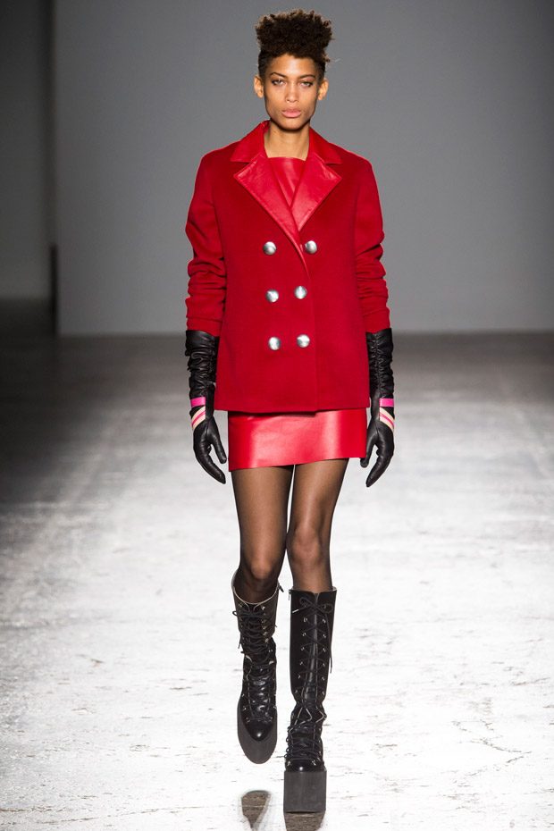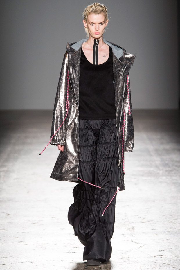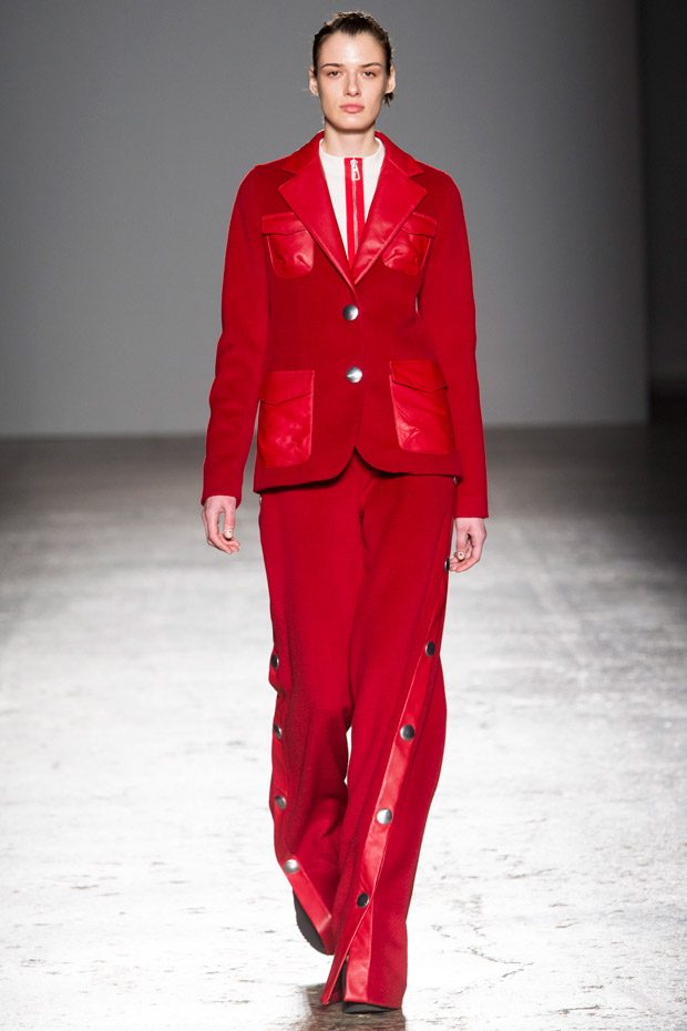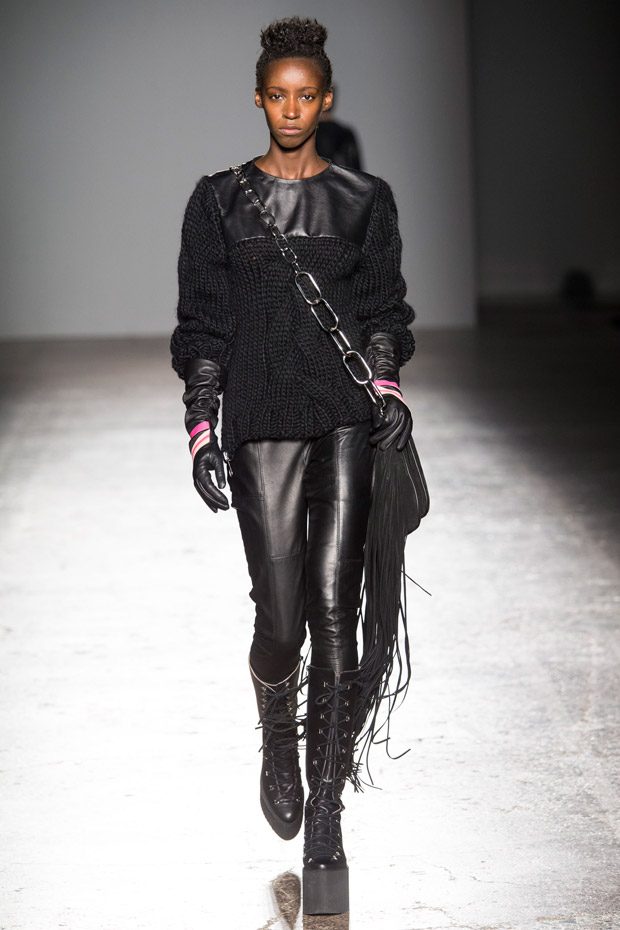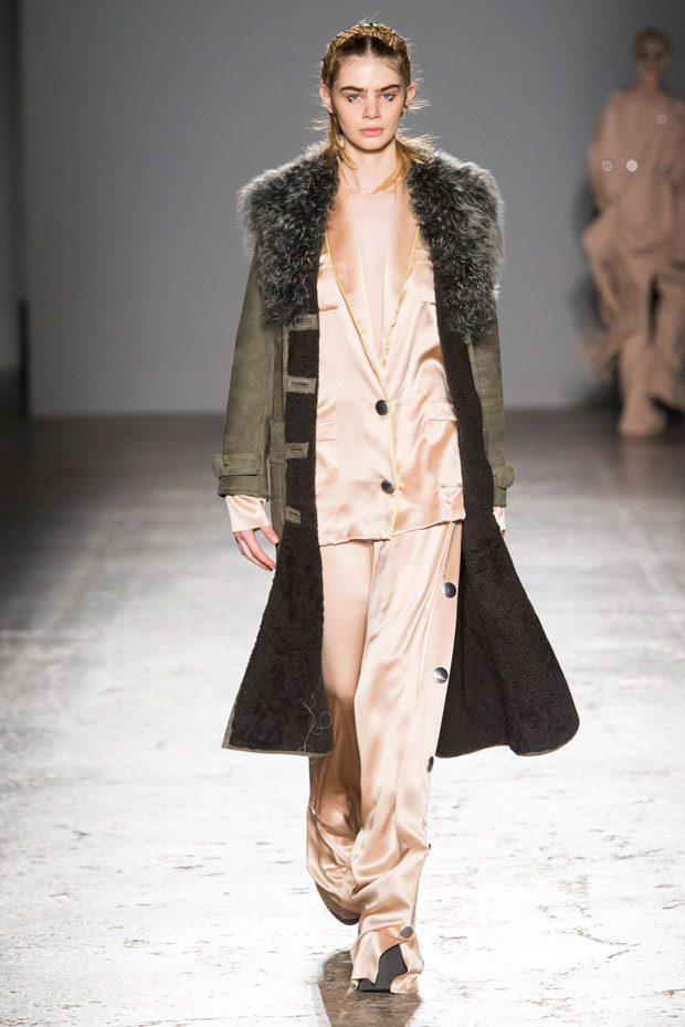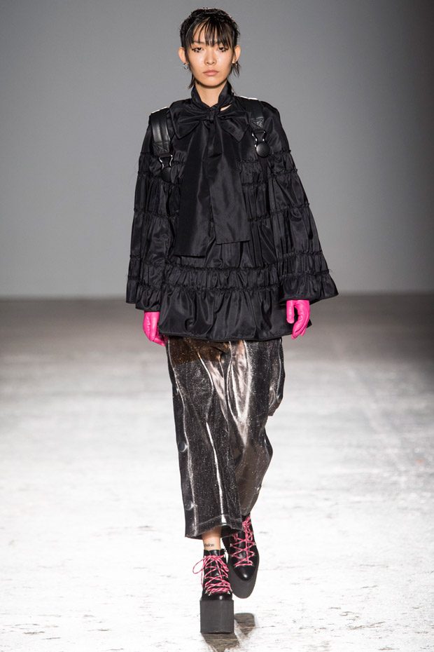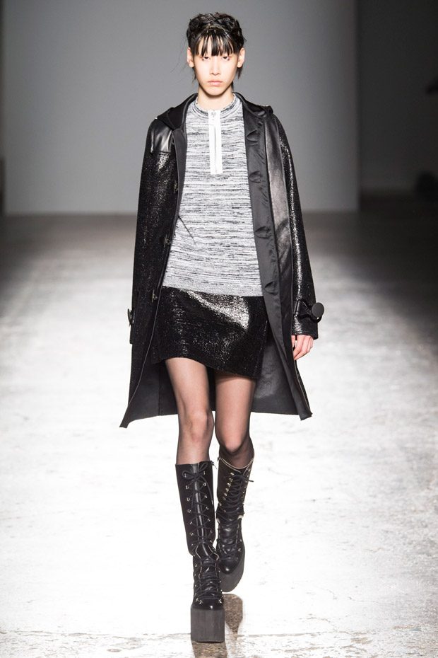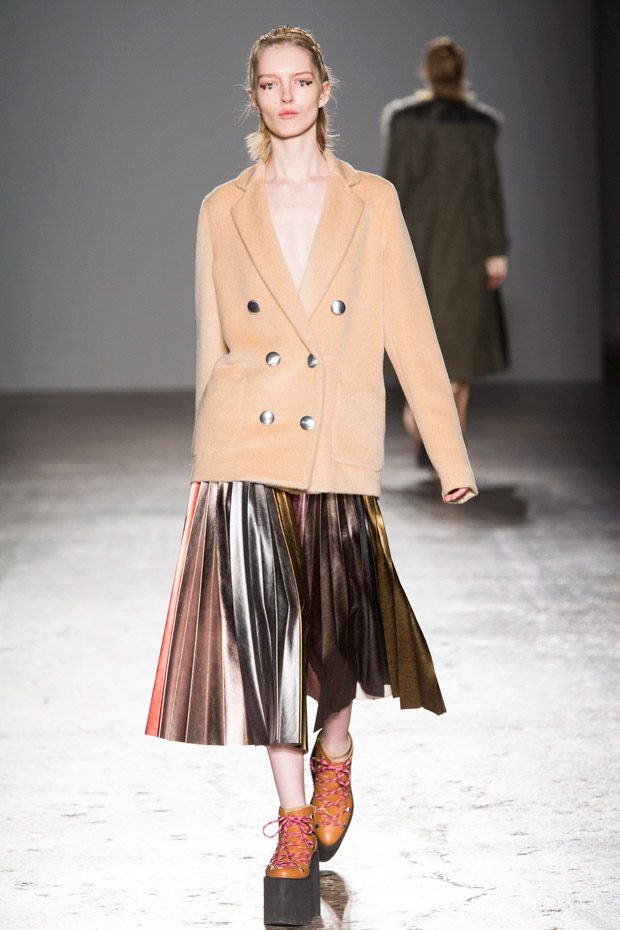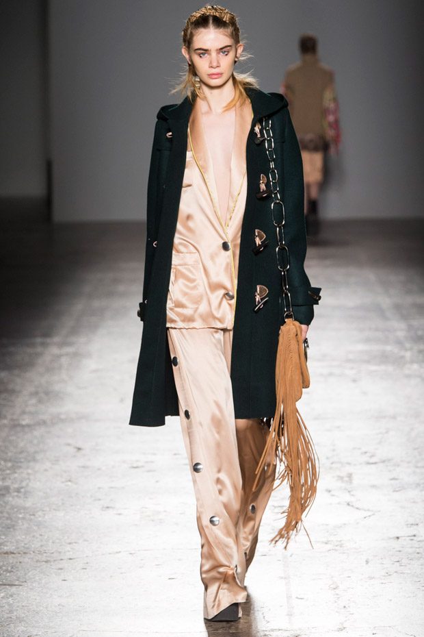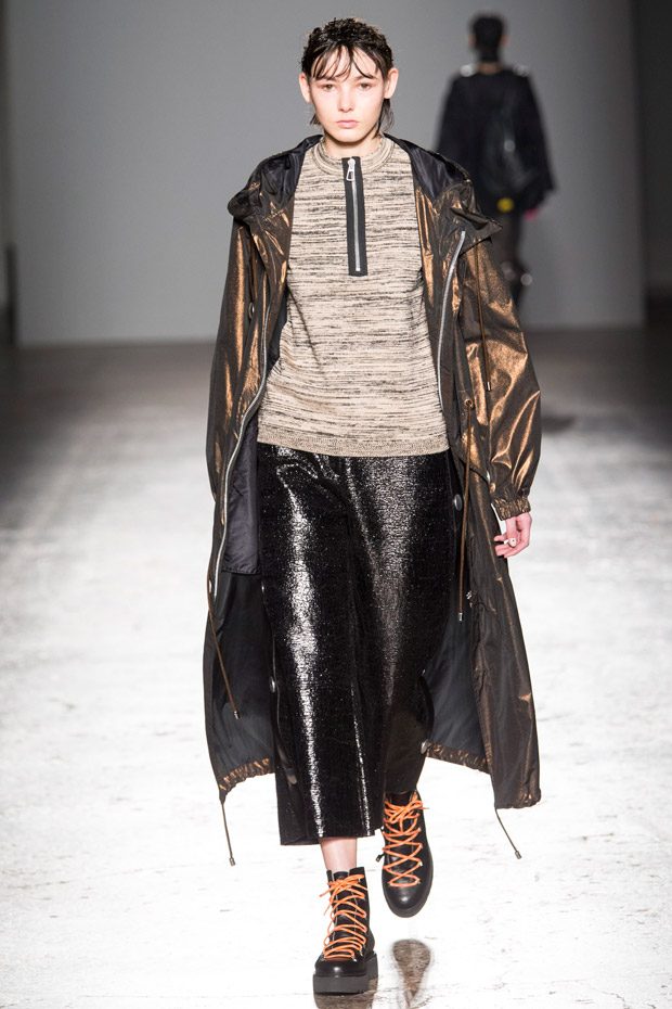 “The spirit to dare remaining yourself, ethnic influences mingle with technology and innovation. In praise of contrasts: past and present, tradition and experimentation, luxury and casual, they create an image of contemporary and urban appeal. Sports references combined with precious materials define a renewed elegance and more aware femininity. Coats and knitwear are protagonists and declined in alpaca total looks with 3d effect. Men’s pinstripes, cashmere velour, valencienne lace, denim, taffetas, macro corduroys and printed silk, jacquard fil coupé, all mated, coated, pleated, hand-rolled with “crackle” effect for outfits with underground allure and architectural shapes.“