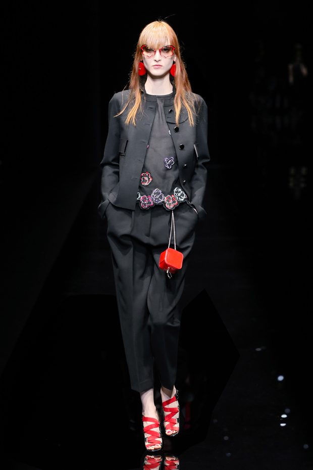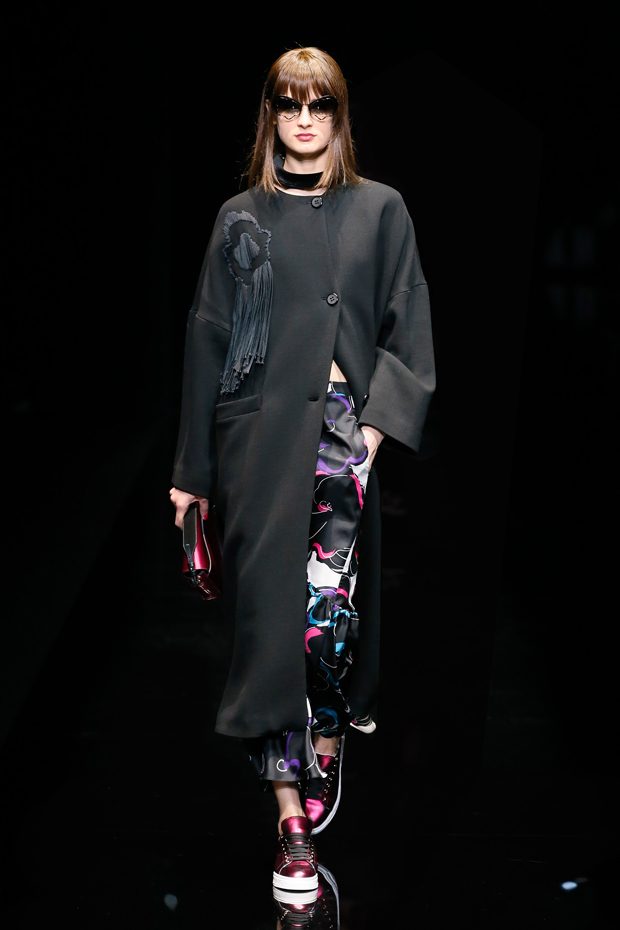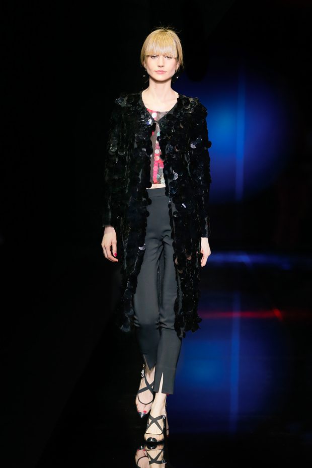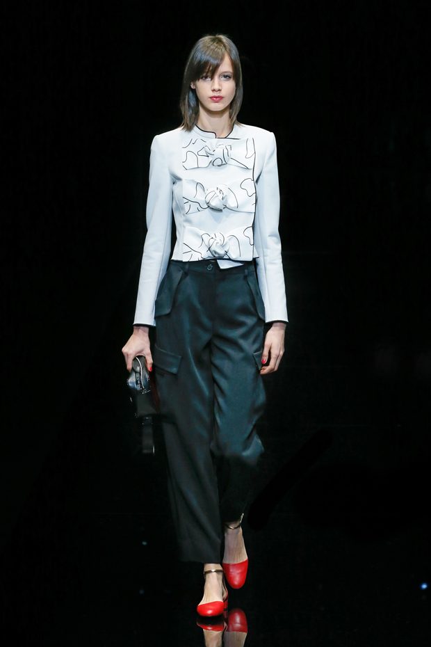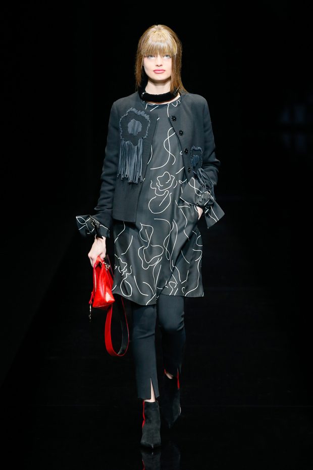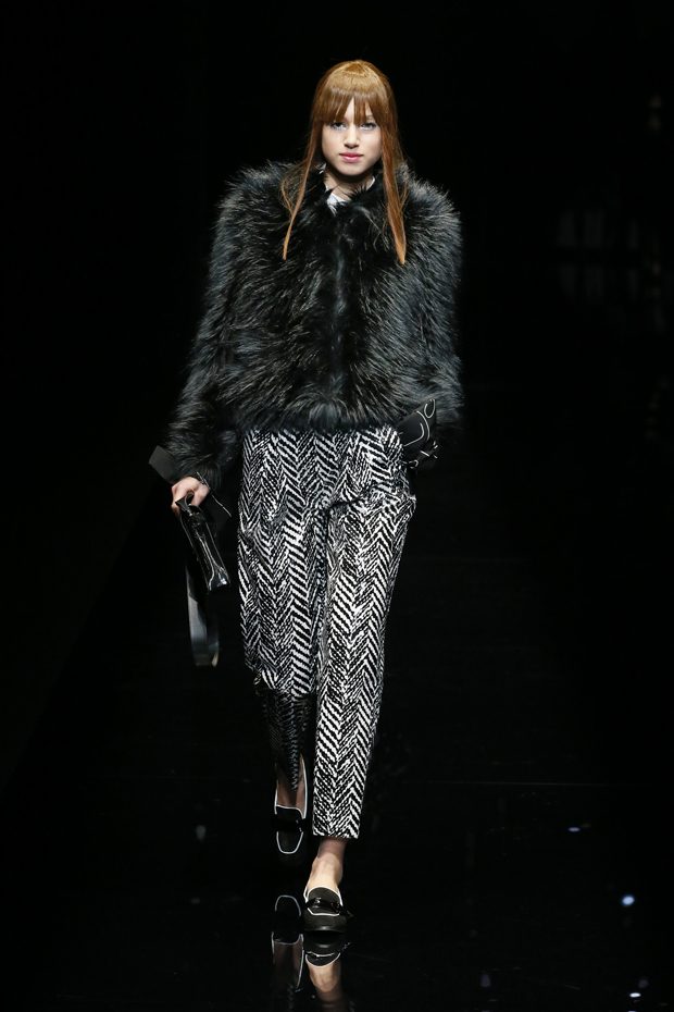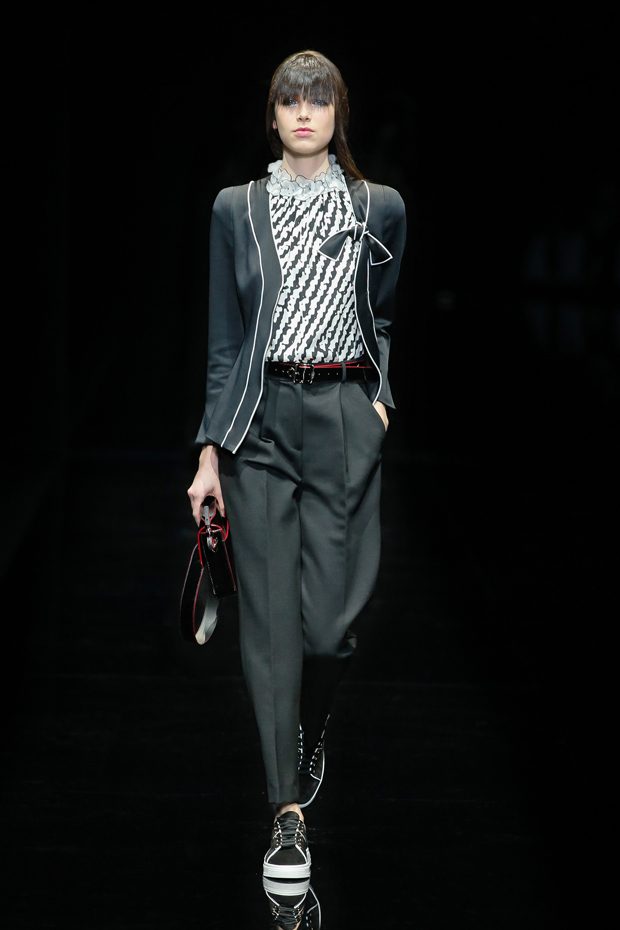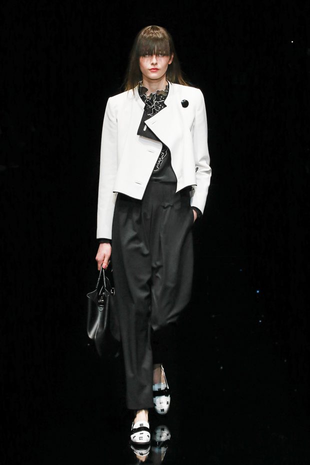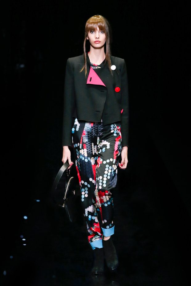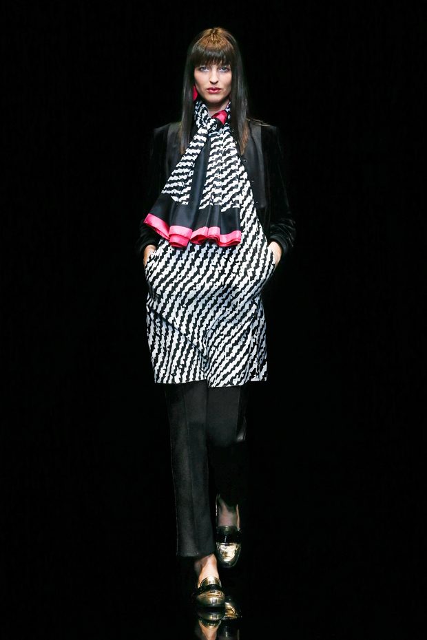 Graphic allure, for dynamic women gazing out from under edgy fringes. A collection marked by a restless, metropolitan spirit, constructed from opposites that mix in a harmony of crescendo, diversity and contrast. The clash here expresses individuality and personality. The game of contrasts starts with black and white in opposition, representing the dialogue — in typical Armani fashion — between male and female. Prince of Wales check, chevron and polka dot patterns are enlarged on pvc backgrounds in an intentionally artificial manner, then applied to suits and generously-sized coats; the outfits are augmented by plastrons that echo the look of black tie. Recurrent throughout are tight trousers. Floral prints, pictorial scenes and sequin embroideries are expressed using graphic techniques, which display quick, instinctive strokes. Flashes of red and fuchsia break into pitch black. – from Emporio Armani