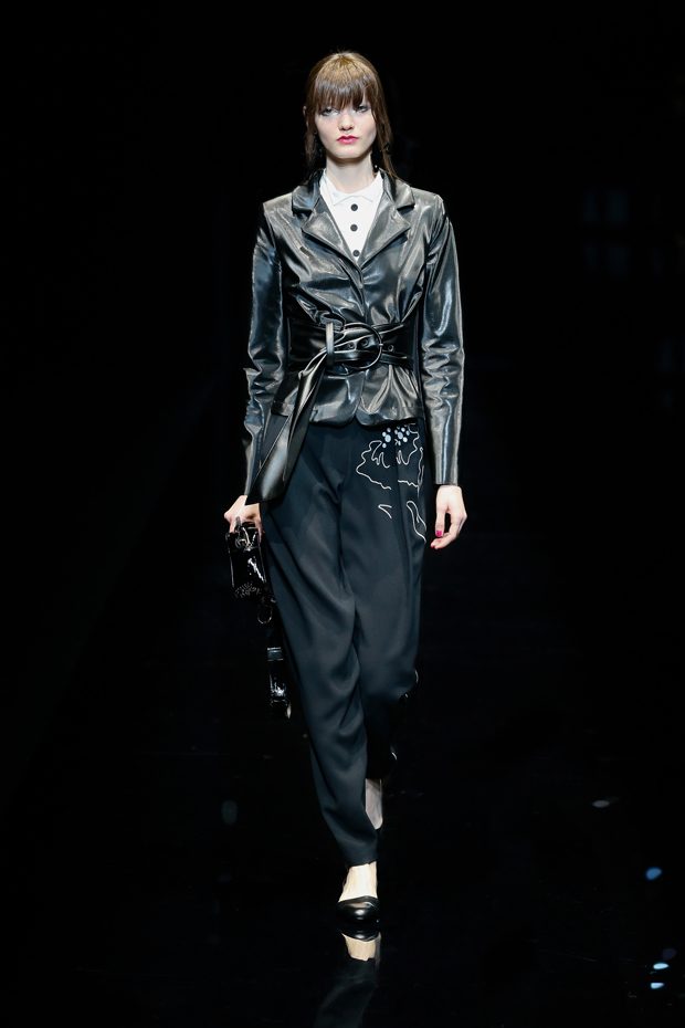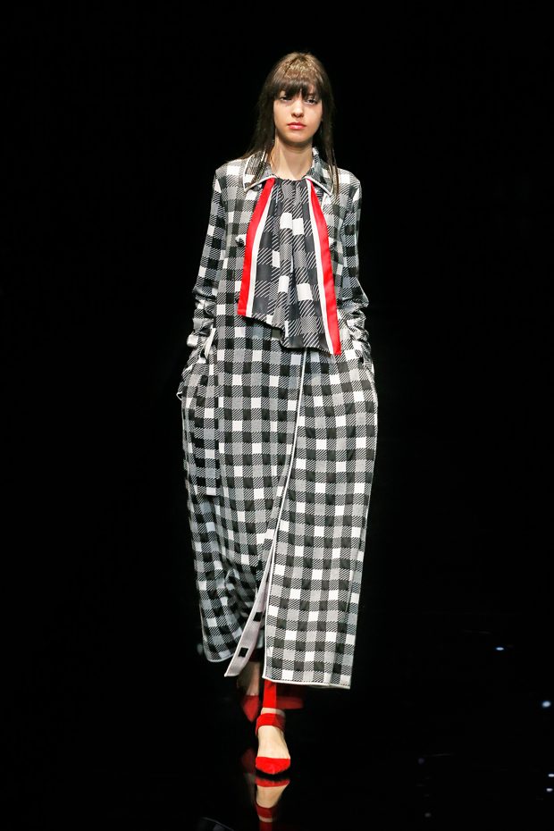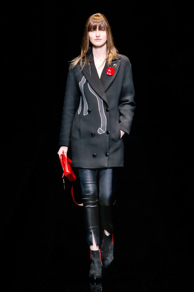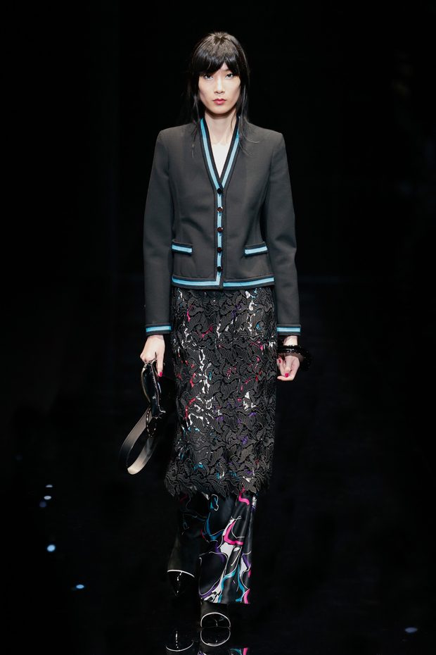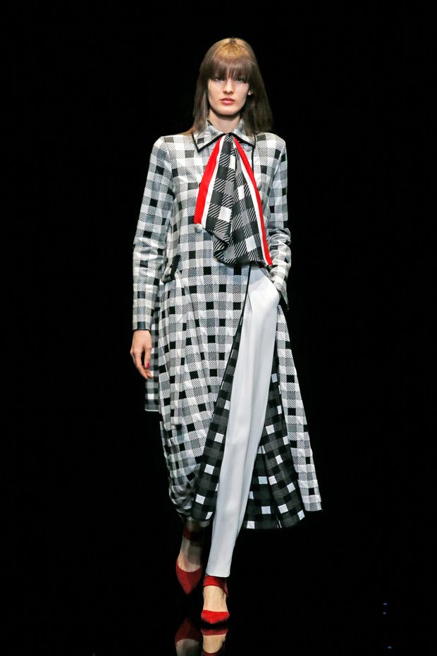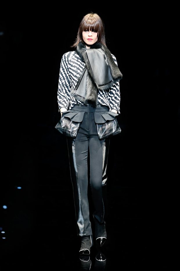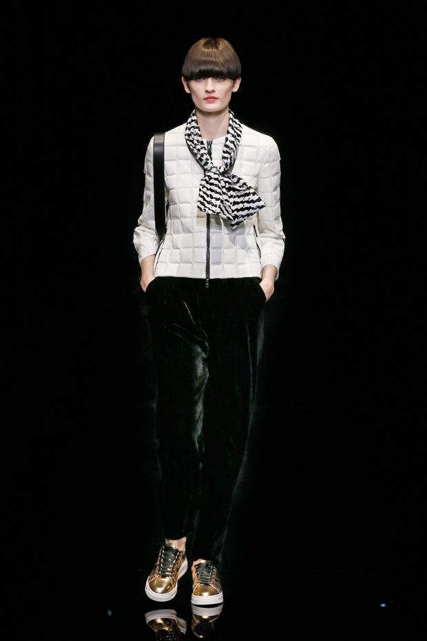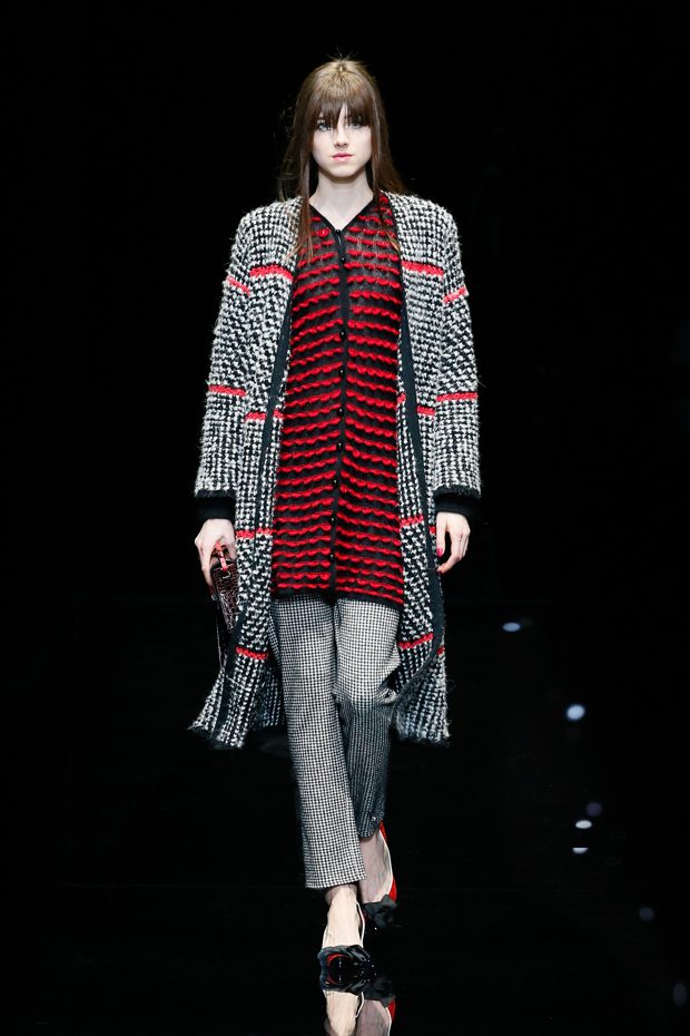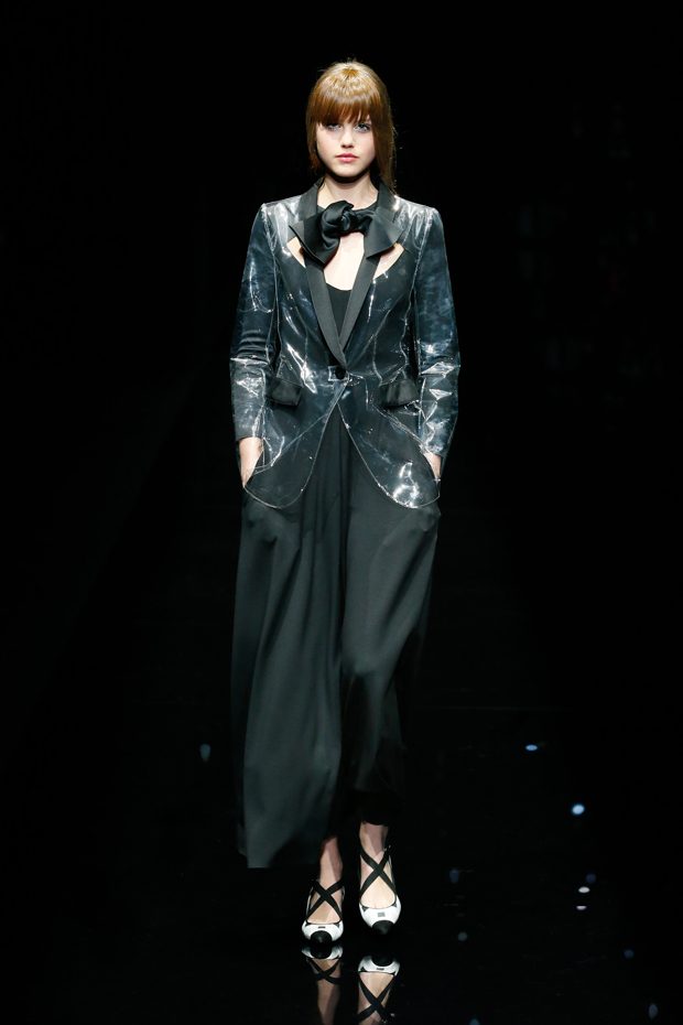 Graphic allure, for dynamic women gazing out from under edgy fringes. A collection marked by a restless, metropolitan spirit, constructed from opposites that mix in a harmony of crescendo, diversity and contrast. The clash here expresses individuality and personality. The game of contrasts starts with black and white in opposition, representing the dialogue — in typical Armani fashion — between male and female. Prince of Wales check, chevron and polka dot patterns are enlarged on pvc backgrounds in an intentionally artificial manner, then applied to suits and generously-sized coats; the outfits are augmented by plastrons that echo the look of black tie. Recurrent throughout are tight trousers. Floral prints, pictorial scenes and sequin embroideries are expressed using graphic techniques, which display quick, instinctive strokes. Flashes of red and fuchsia break into pitch black. – from Emporio Armani