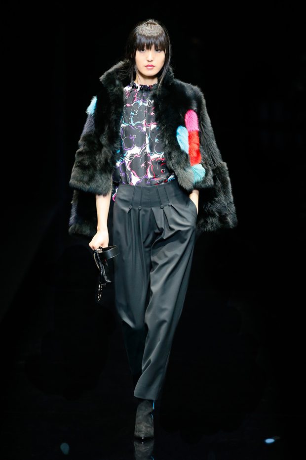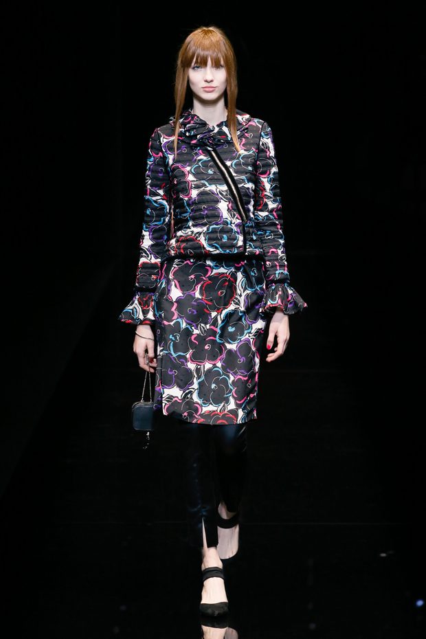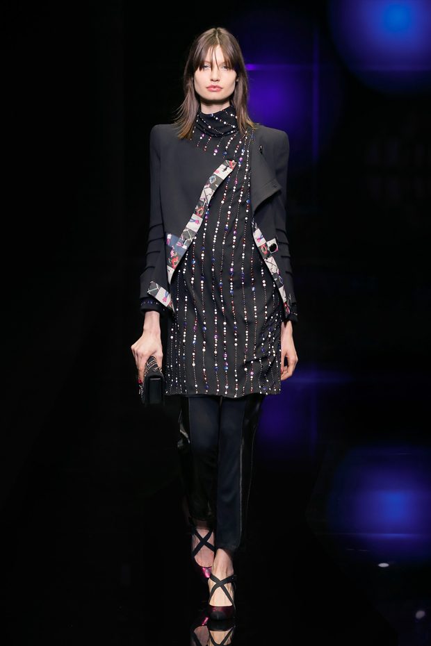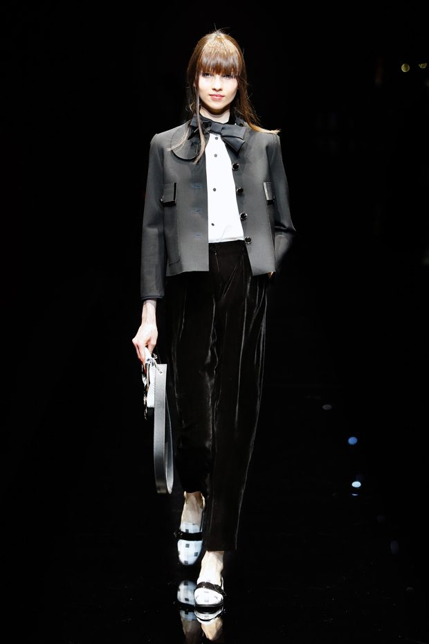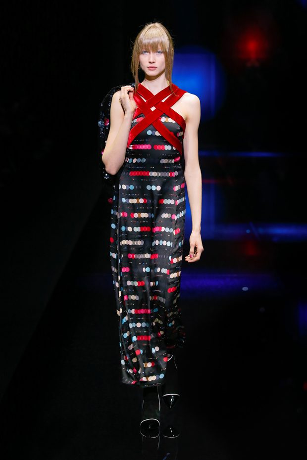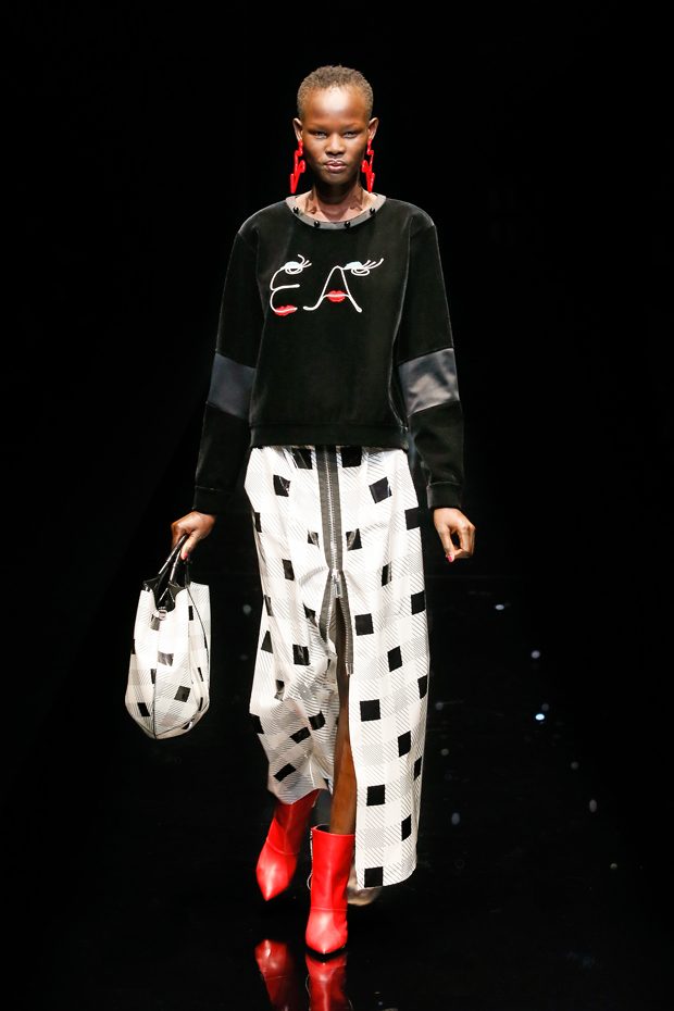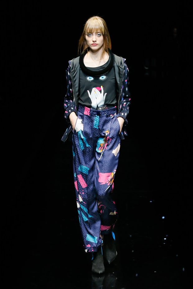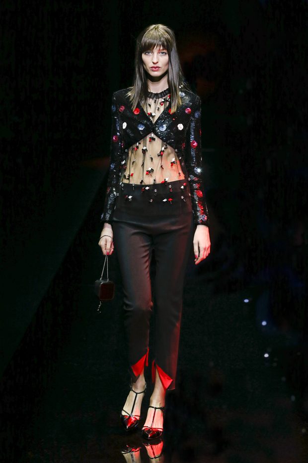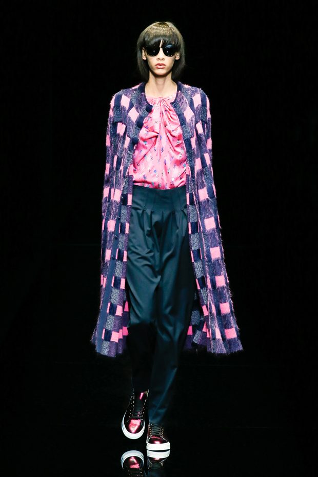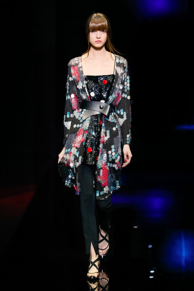 Graphic allure, for dynamic women gazing out from under edgy fringes. A collection marked by a restless, metropolitan spirit, constructed from opposites that mix in a harmony of crescendo, diversity and contrast. The clash here expresses individuality and personality. The game of contrasts starts with black and white in opposition, representing the dialogue — in typical Armani fashion — between male and female. Prince of Wales check, chevron and polka dot patterns are enlarged on pvc backgrounds in an intentionally artificial manner, then applied to suits and generously-sized coats; the outfits are augmented by plastrons that echo the look of black tie. Recurrent throughout are tight trousers. Floral prints, pictorial scenes and sequin embroideries are expressed using graphic techniques, which display quick, instinctive strokes. Flashes of red and fuchsia break into pitch black. – from Emporio Armani