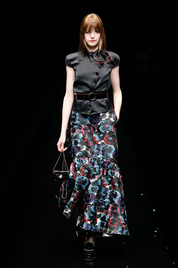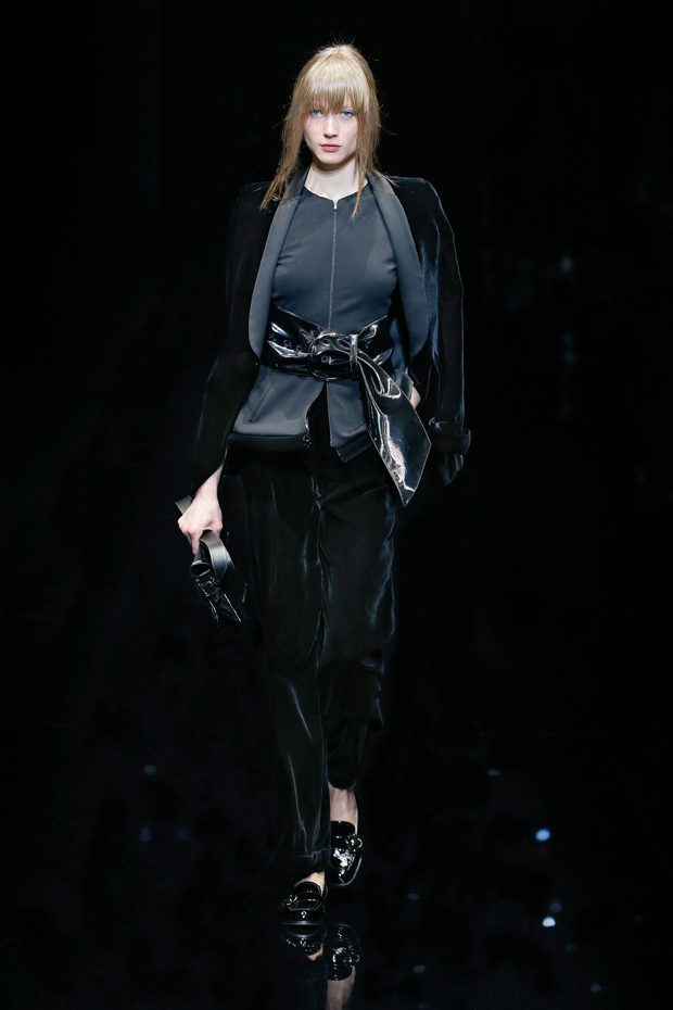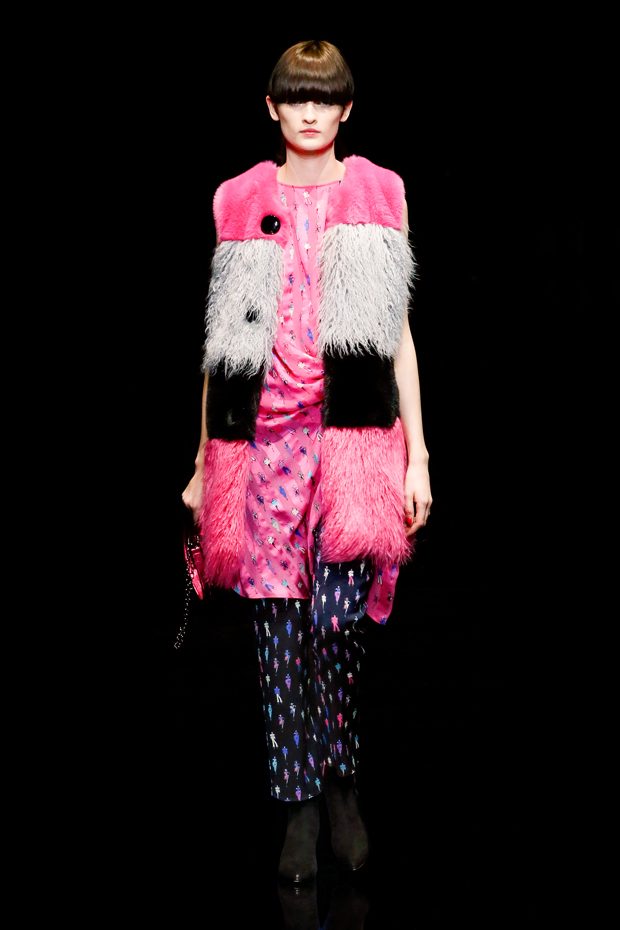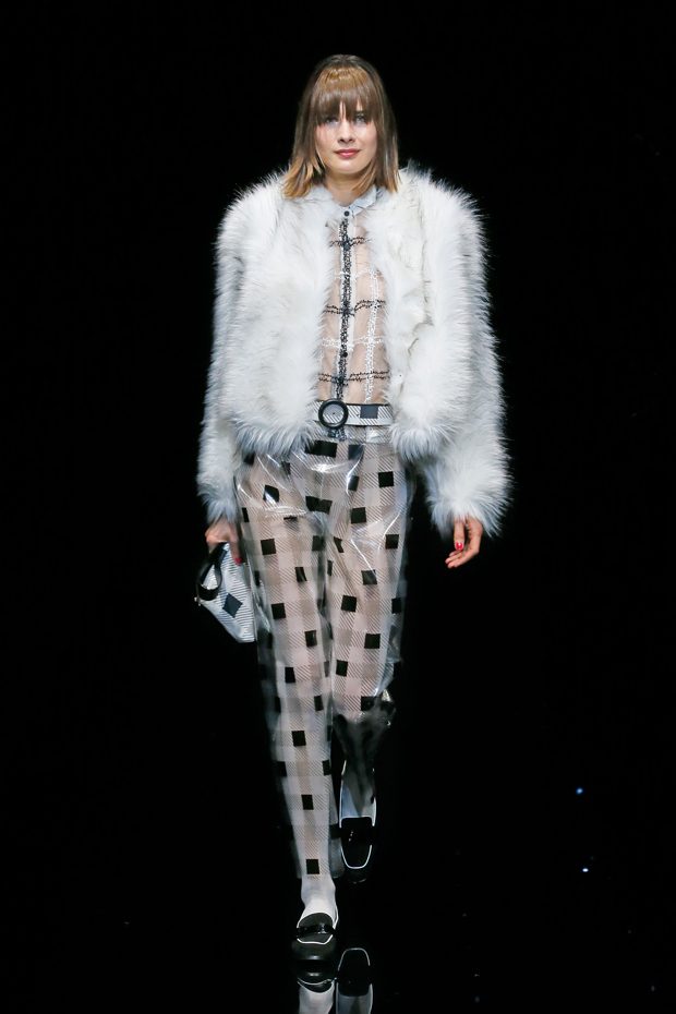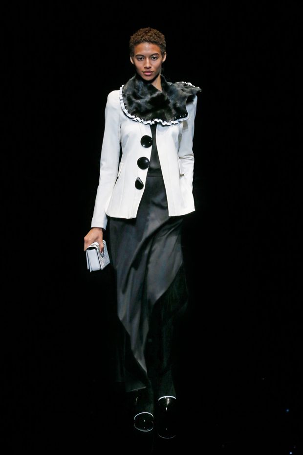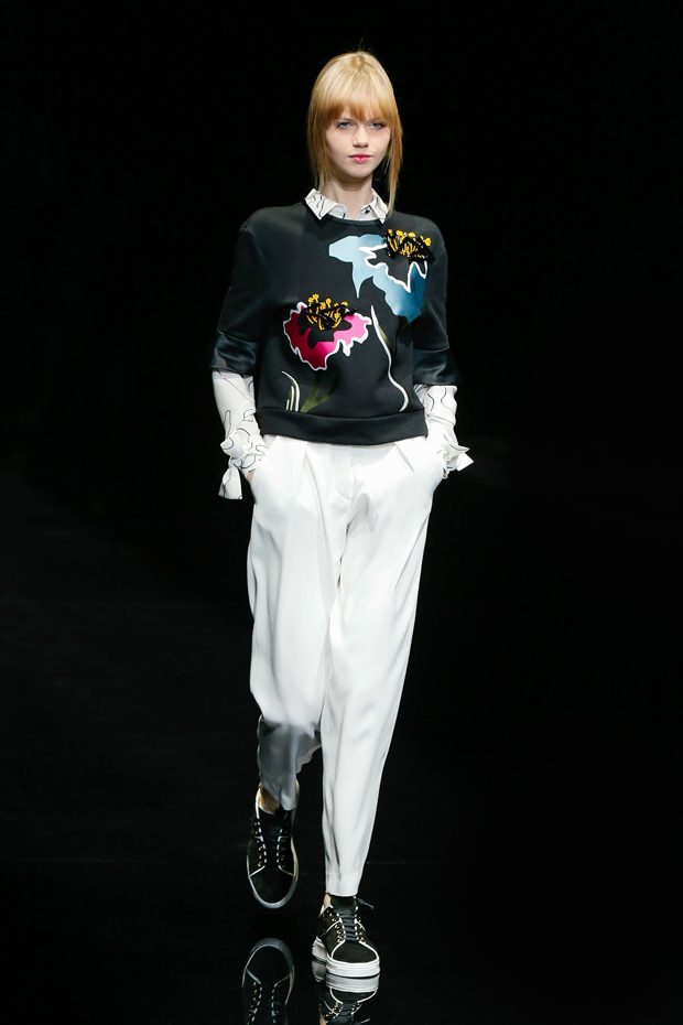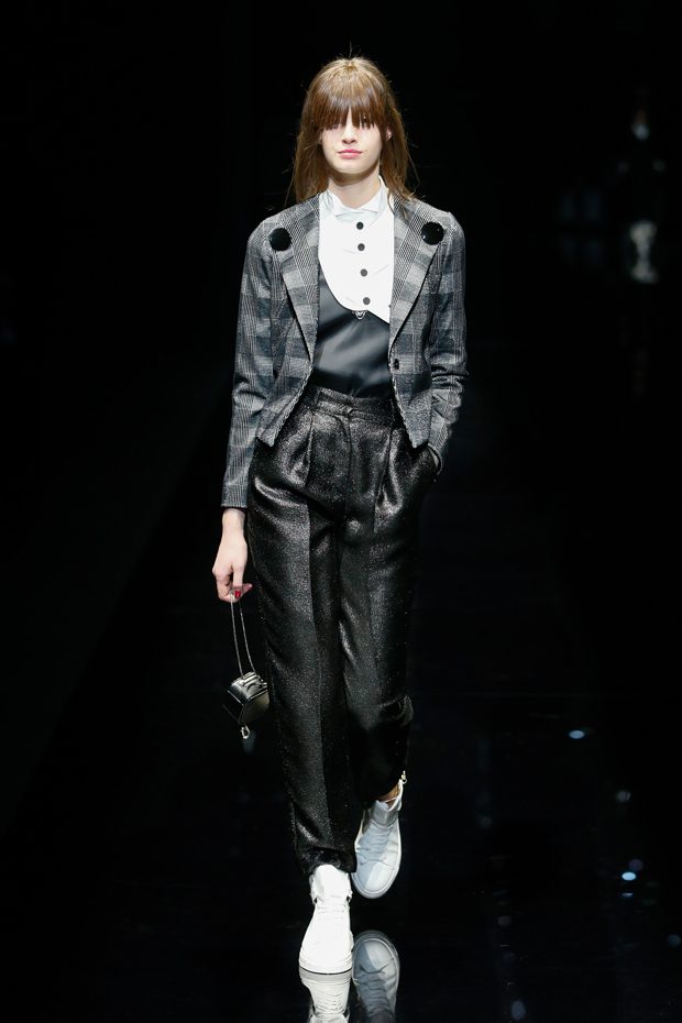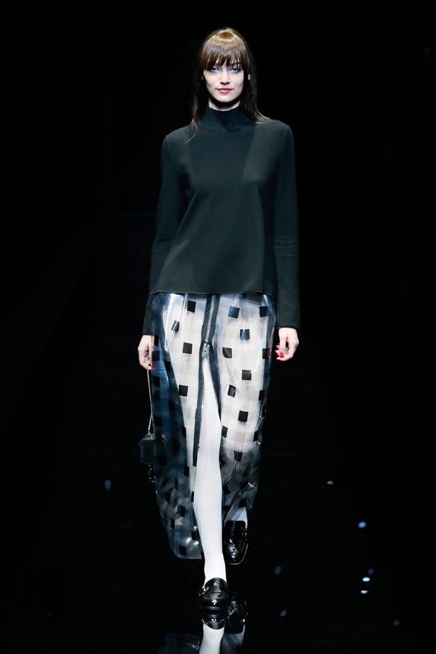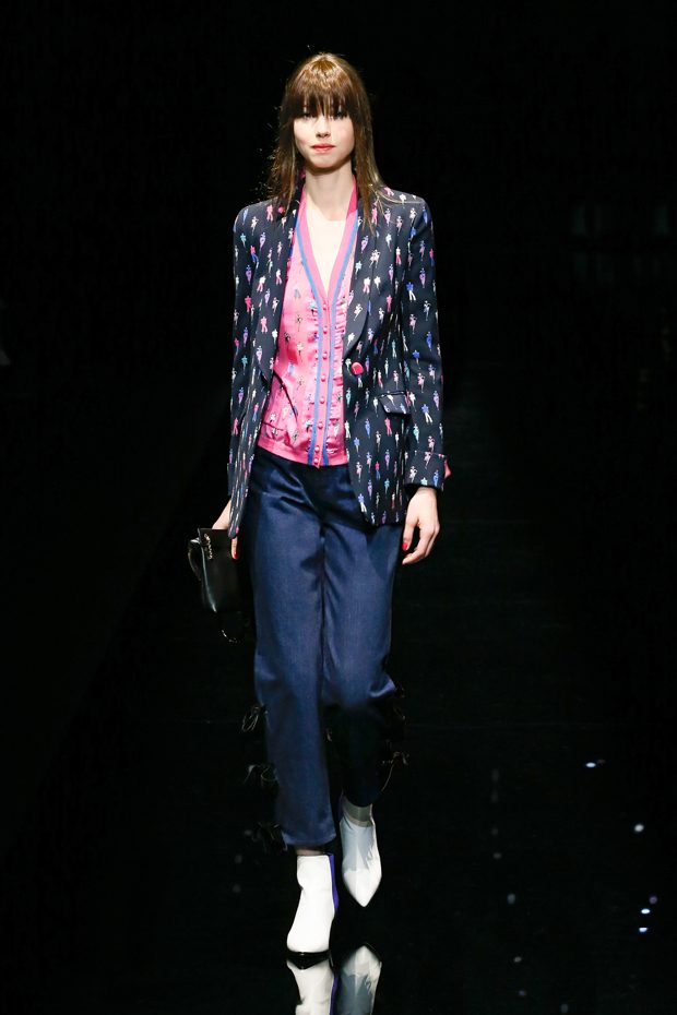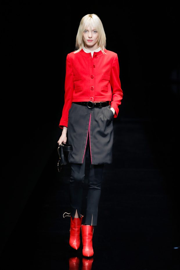 Graphic allure, for dynamic women gazing out from under edgy fringes. A collection marked by a restless, metropolitan spirit, constructed from opposites that mix in a harmony of crescendo, diversity and contrast. The clash here expresses individuality and personality. The game of contrasts starts with black and white in opposition, representing the dialogue — in typical Armani fashion — between male and female. Prince of Wales check, chevron and polka dot patterns are enlarged on pvc backgrounds in an intentionally artificial manner, then applied to suits and generously-sized coats; the outfits are augmented by plastrons that echo the look of black tie. Recurrent throughout are tight trousers. Floral prints, pictorial scenes and sequin embroideries are expressed using graphic techniques, which display quick, instinctive strokes. Flashes of red and fuchsia break into pitch black. – from Emporio Armani