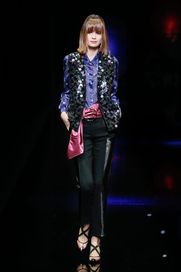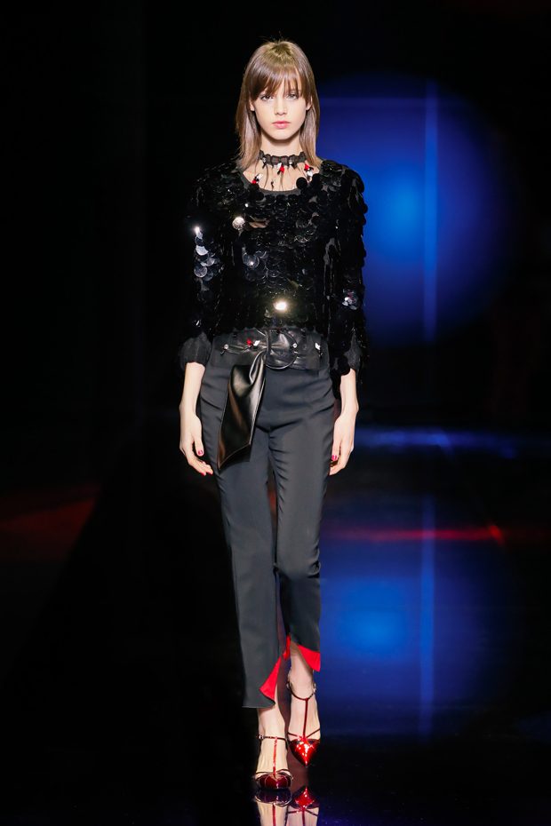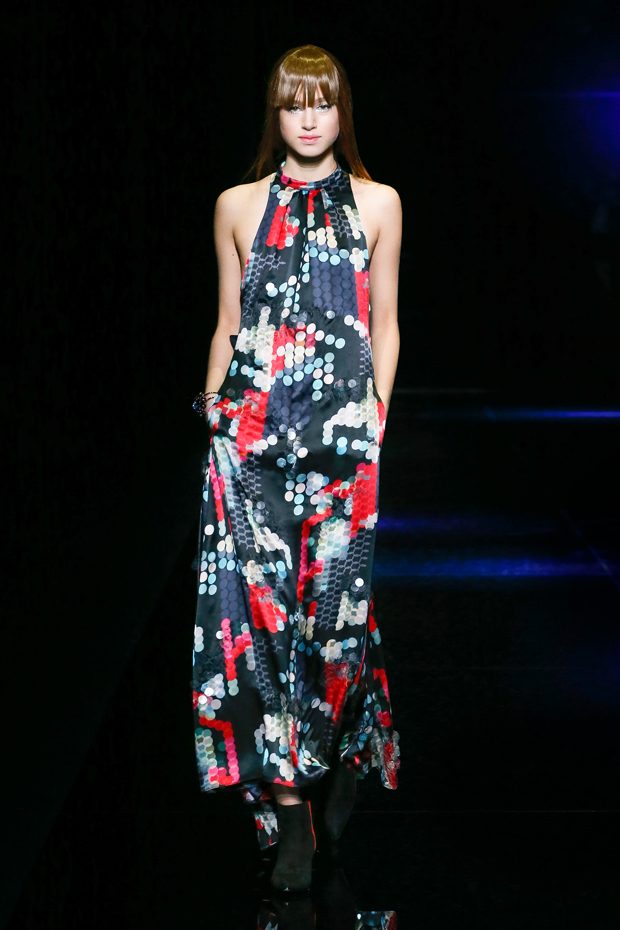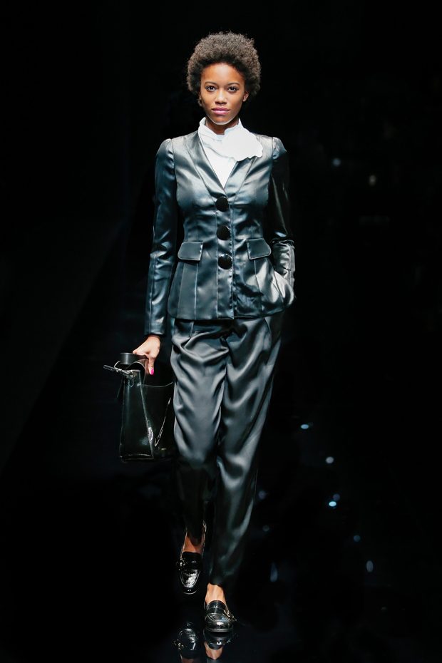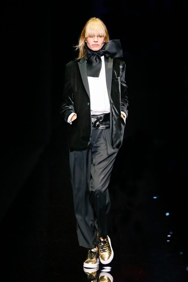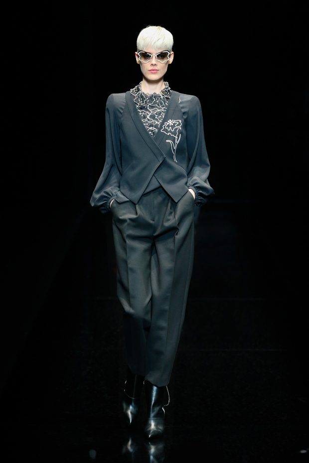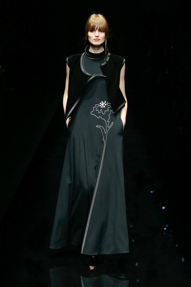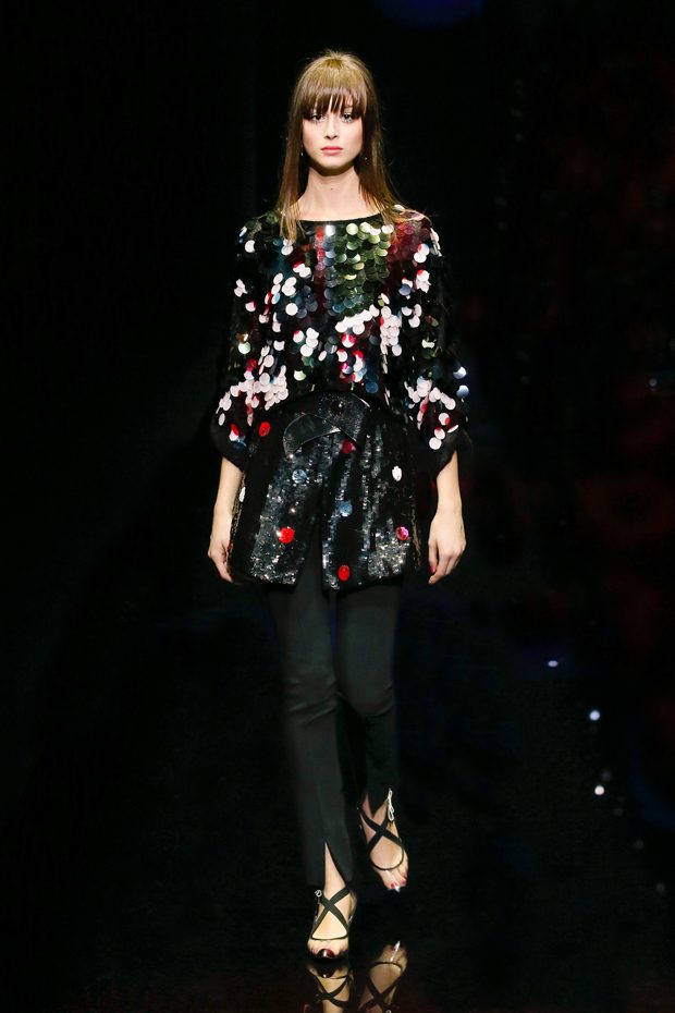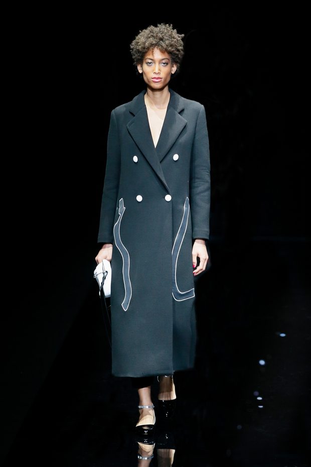 Graphic allure, for dynamic women gazing out from under edgy fringes. A collection marked by a restless, metropolitan spirit, constructed from opposites that mix in a harmony of crescendo, diversity and contrast. The clash here expresses individuality and personality. The game of contrasts starts with black and white in opposition, representing the dialogue — in typical Armani fashion — between male and female. Prince of Wales check, chevron and polka dot patterns are enlarged on pvc backgrounds in an intentionally artificial manner, then applied to suits and generously-sized coats; the outfits are augmented by plastrons that echo the look of black tie. Recurrent throughout are tight trousers. Floral prints, pictorial scenes and sequin embroideries are expressed using graphic techniques, which display quick, instinctive strokes. Flashes of red and fuchsia break into pitch black. – from Emporio Armani