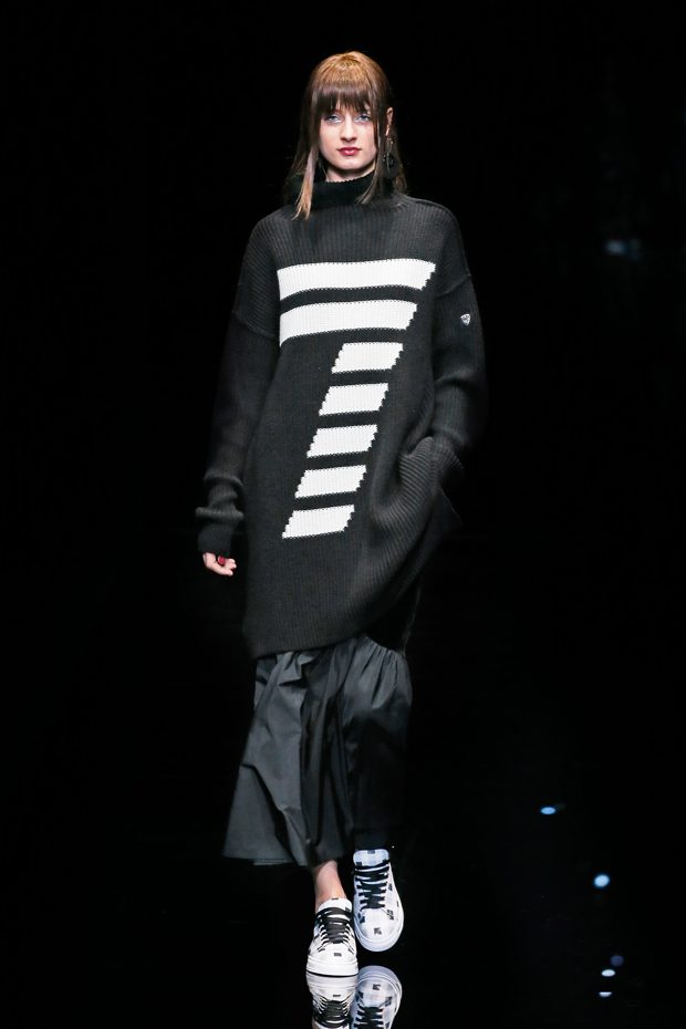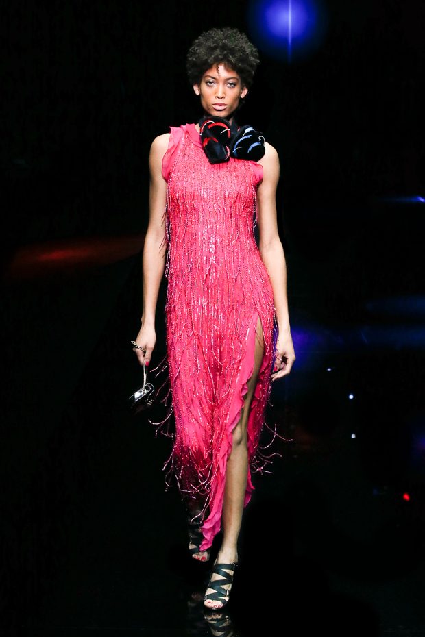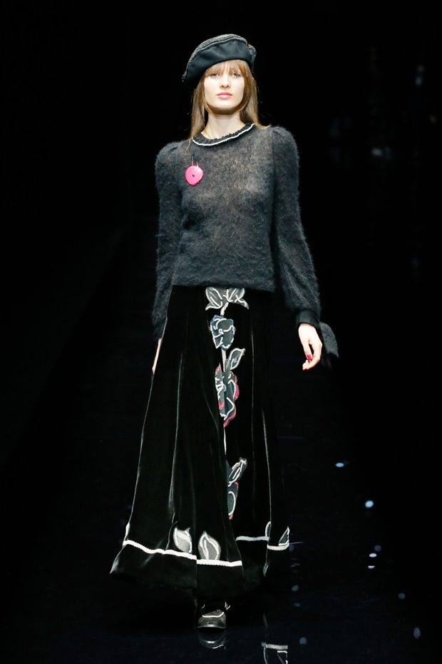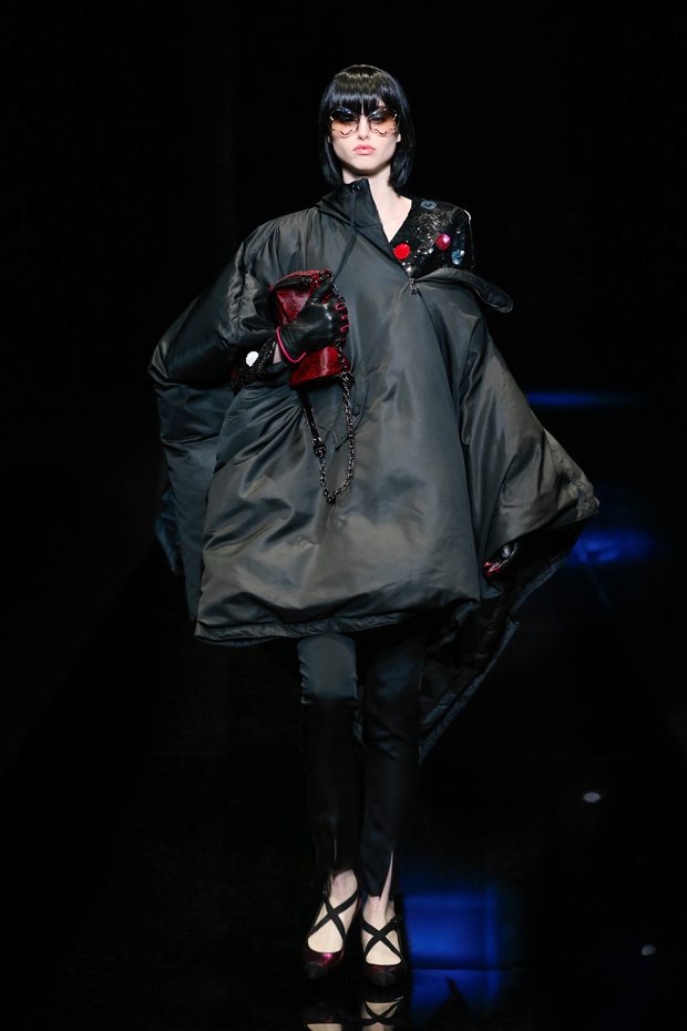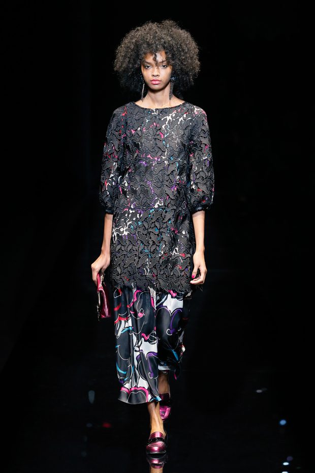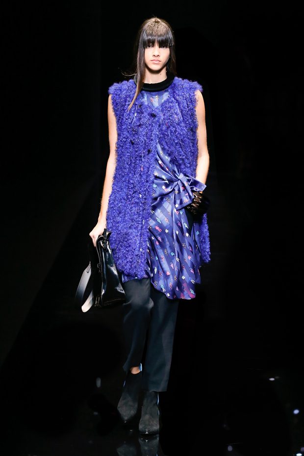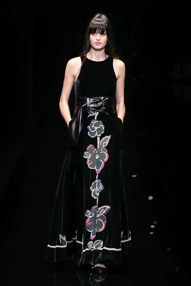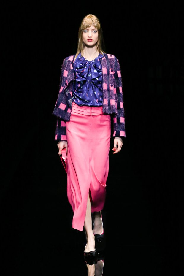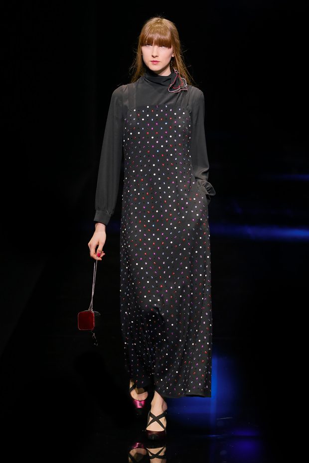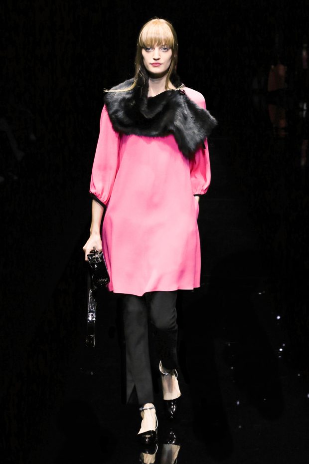 Graphic allure, for dynamic women gazing out from under edgy fringes. A collection marked by a restless, metropolitan spirit, constructed from opposites that mix in a harmony of crescendo, diversity and contrast. The clash here expresses individuality and personality. The game of contrasts starts with black and white in opposition, representing the dialogue — in typical Armani fashion — between male and female. Prince of Wales check, chevron and polka dot patterns are enlarged on pvc backgrounds in an intentionally artificial manner, then applied to suits and generously-sized coats; the outfits are augmented by plastrons that echo the look of black tie. Recurrent throughout are tight trousers. Floral prints, pictorial scenes and sequin embroideries are expressed using graphic techniques, which display quick, instinctive strokes. Flashes of red and fuchsia break into pitch black. – from Emporio Armani