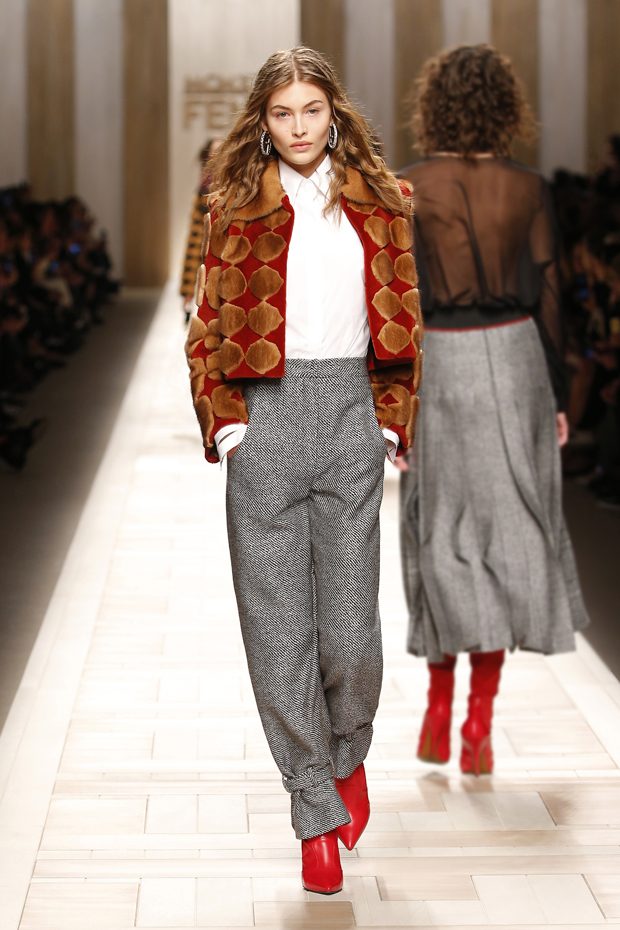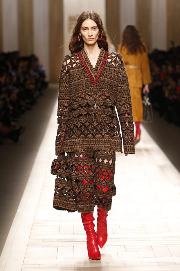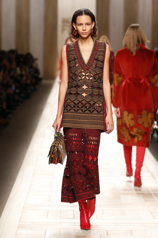 The FENDI muse for the Fall/Winter 2017-18 Collection emerges at dawn: a cinematic character pacing the streets of Rome. Framing her free spirit, the graphic heritage of FENDI rises to the fore. Geometric patterns are inspired by Viennese woodblock printing and 18th century Italian papiers dominotés, which come to life in an array of mosaic techniques, from cut-out knitwear to marquetry furs and acanthus leaf-printed silk. Colours exude autumnal warmth: from carmine red like sealing wax to camel, cobalt and petrol blue, optic white or palest blush pink, they highlight the Collection’s decorative, modern hand. – from Fendi