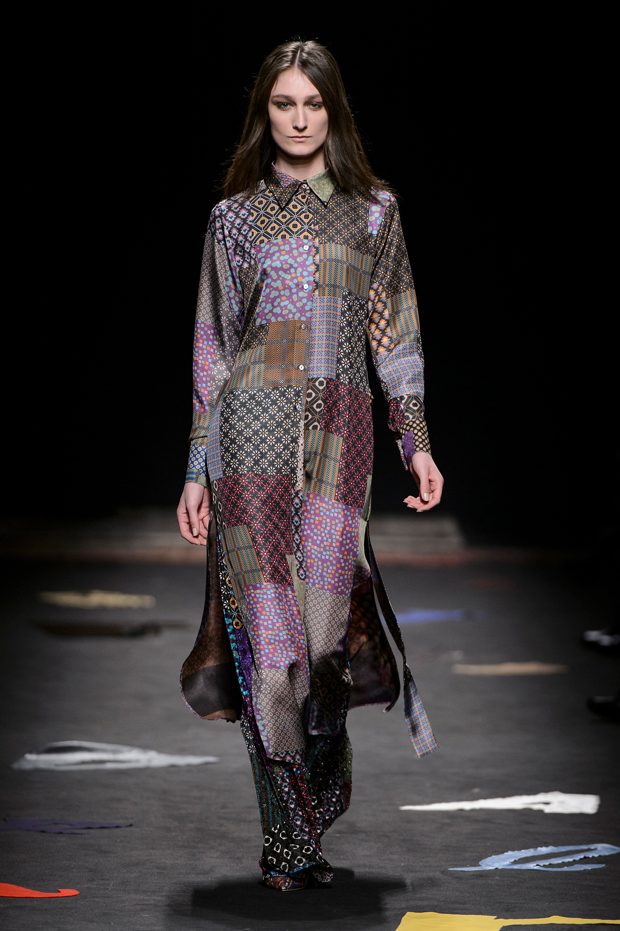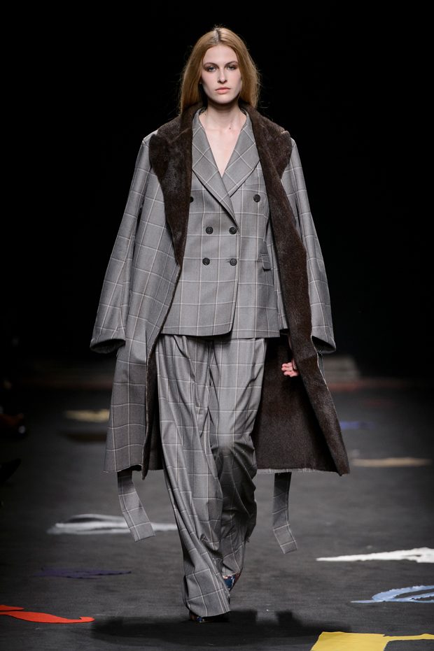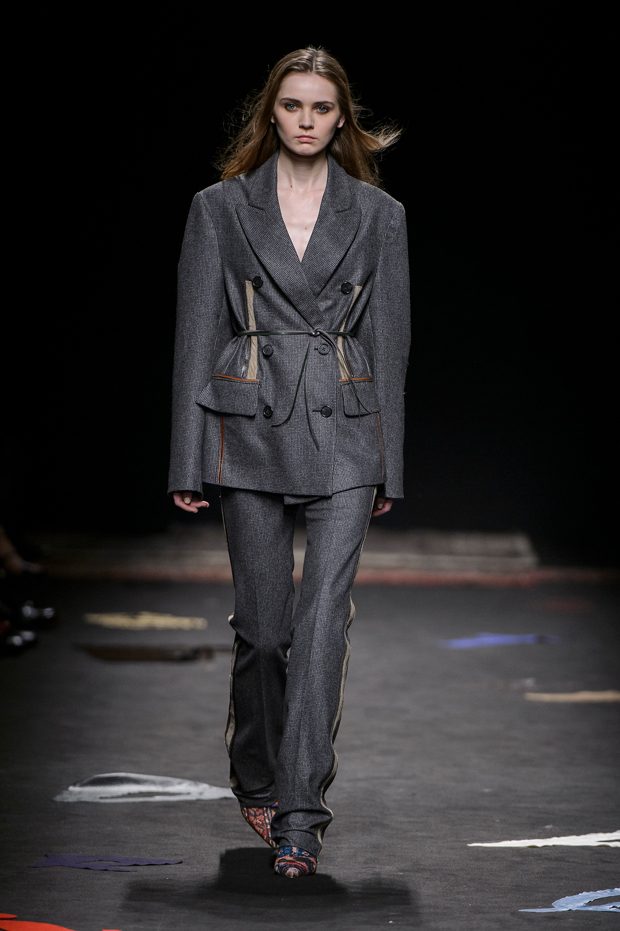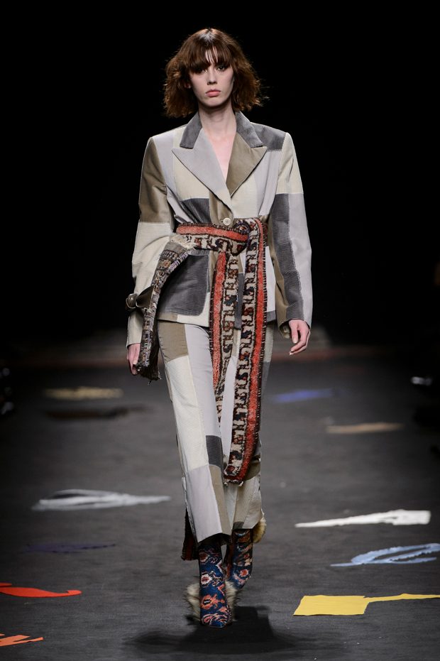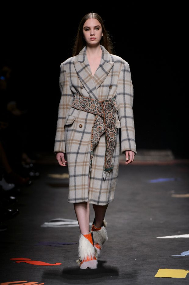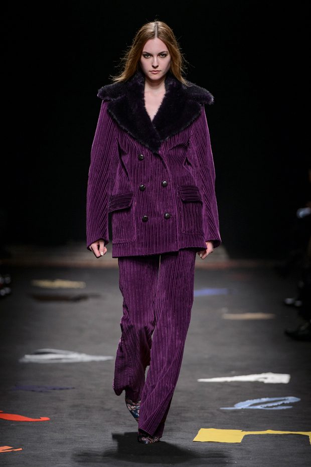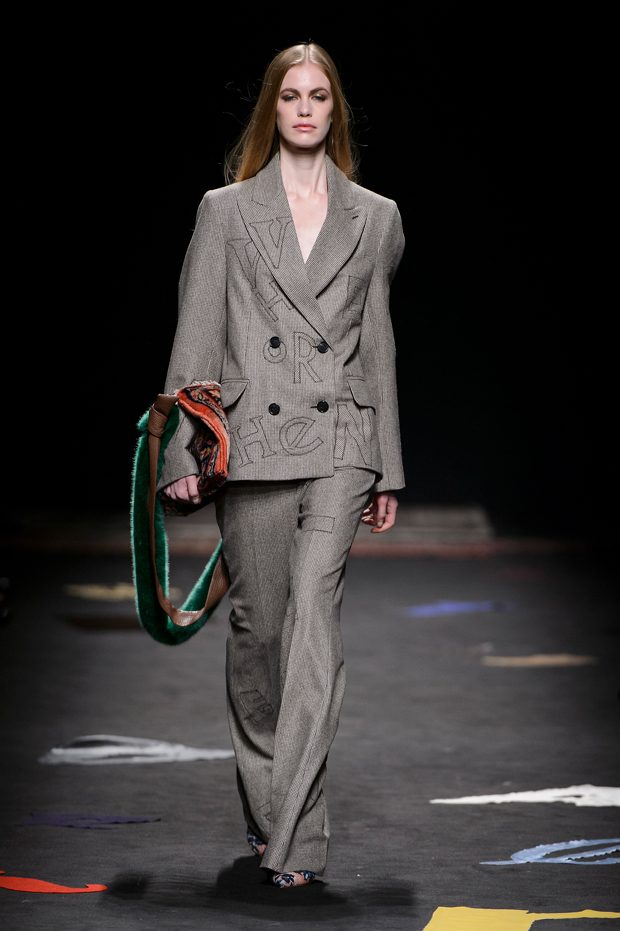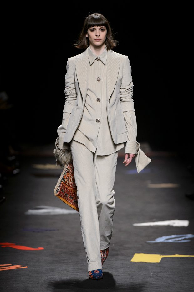 The byword is blazer-blazer-blazer. Double-breasted, first and foremost, but single-breasted too. They both become coats, often oversized, as if they had been borrowed from a husband’s wardrobe. Lots of male fabrics: herringbone, prince of wales, large check or bonded alpaca alternate with bonded crepe, mélange flannel, windowpane tasmanian, broad wale corduroy or velvets forming their own patchwork. And all together with patchwork-pattern prints. – from Maurizio Pecoraro