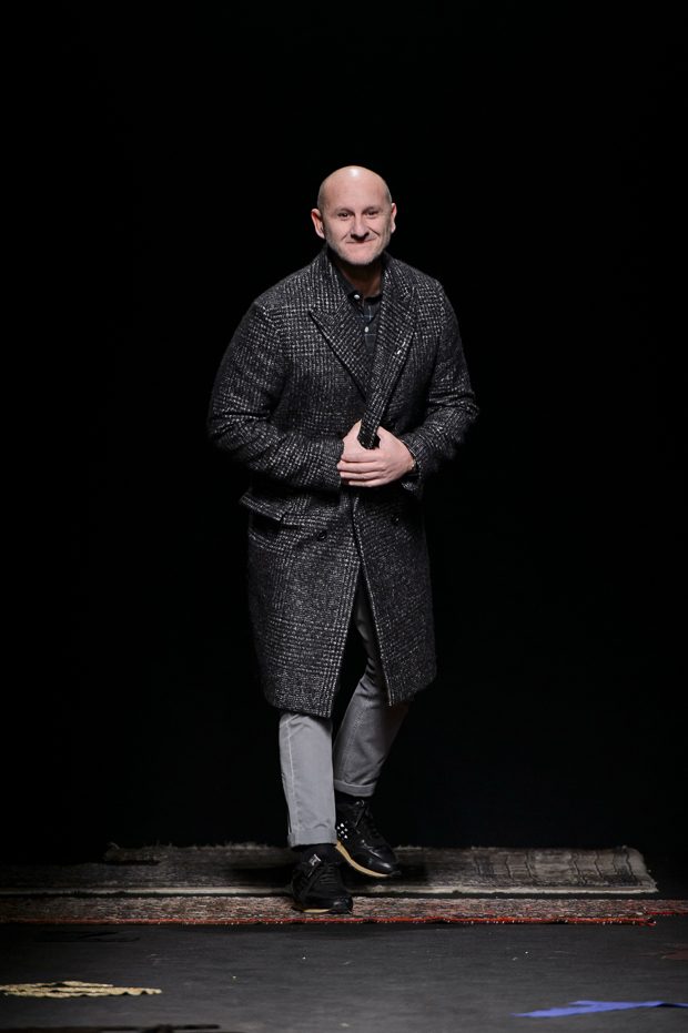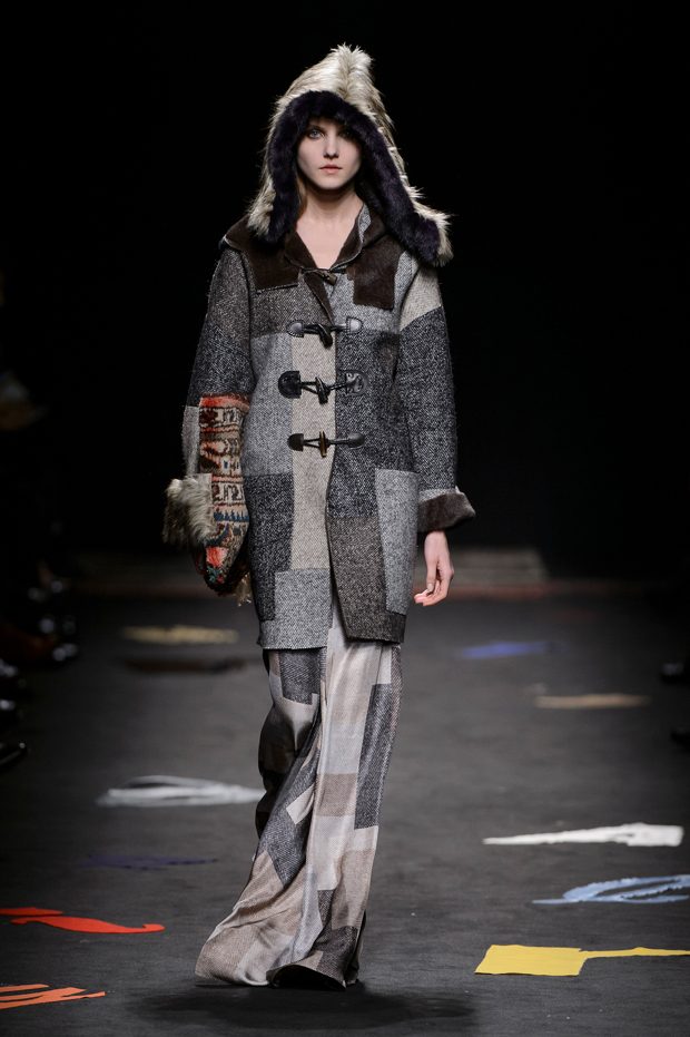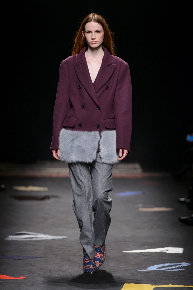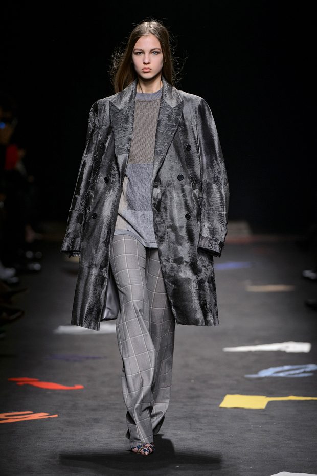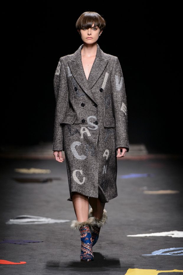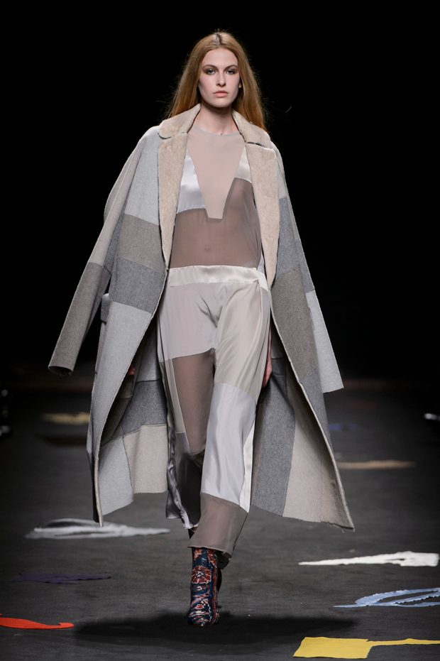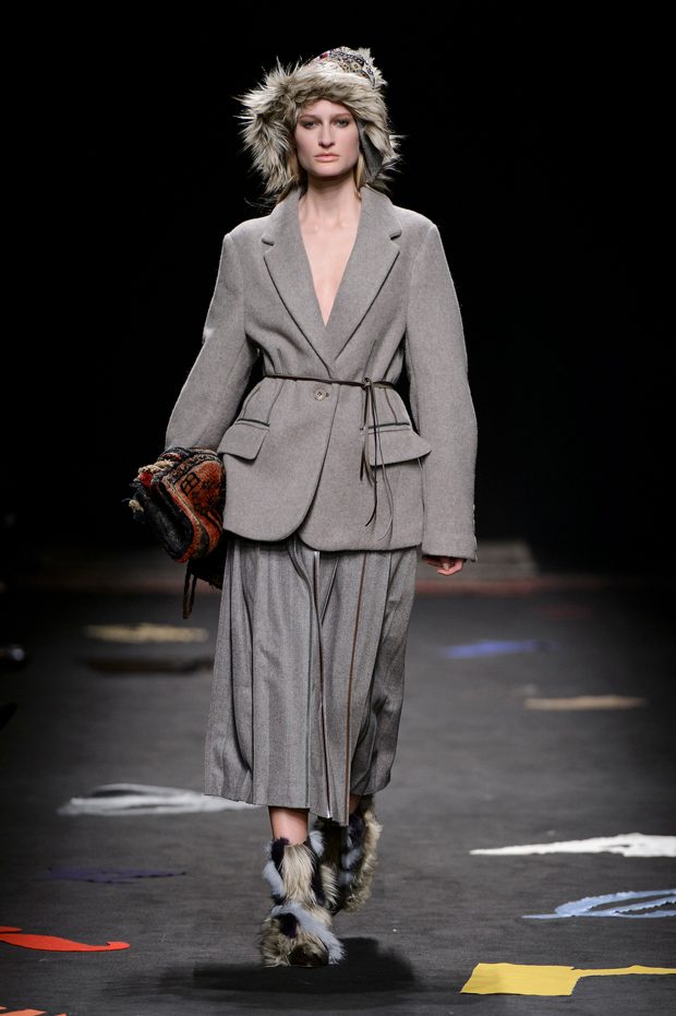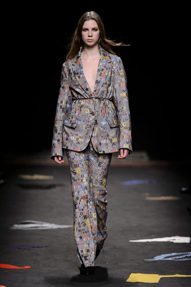 The byword is blazer-blazer-blazer. Double-breasted, first and foremost, but single-breasted too. They both become coats, often oversized, as if they had been borrowed from a husband’s wardrobe. Lots of male fabrics: herringbone, prince of wales, large check or bonded alpaca alternate with bonded crepe, mélange flannel, windowpane tasmanian, broad wale corduroy or velvets forming their own patchwork. And all together with patchwork-pattern prints. – from Maurizio Pecoraro