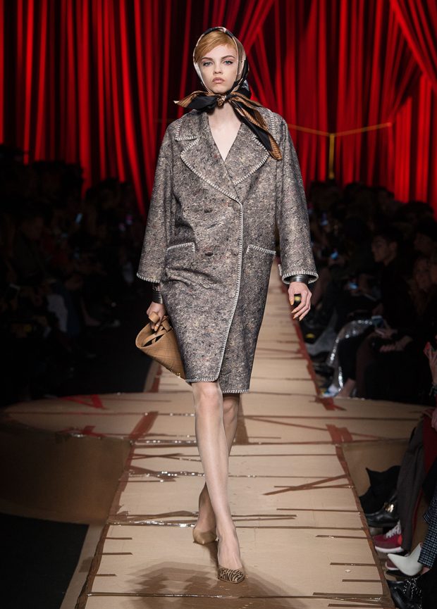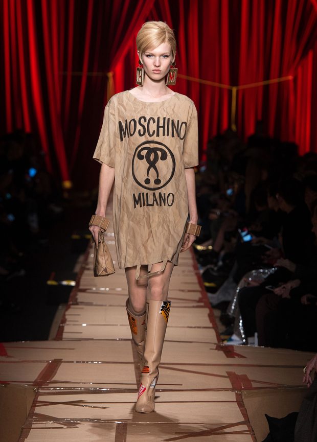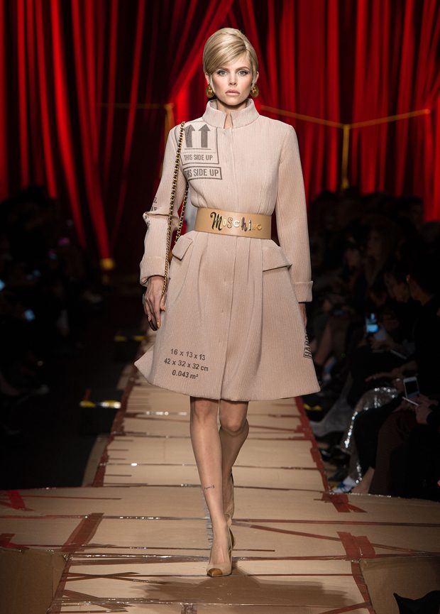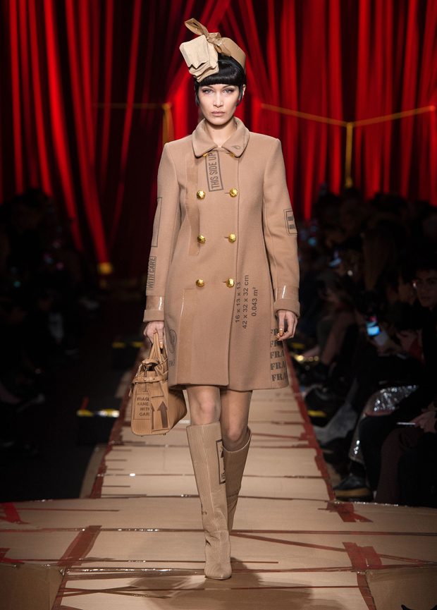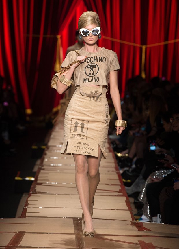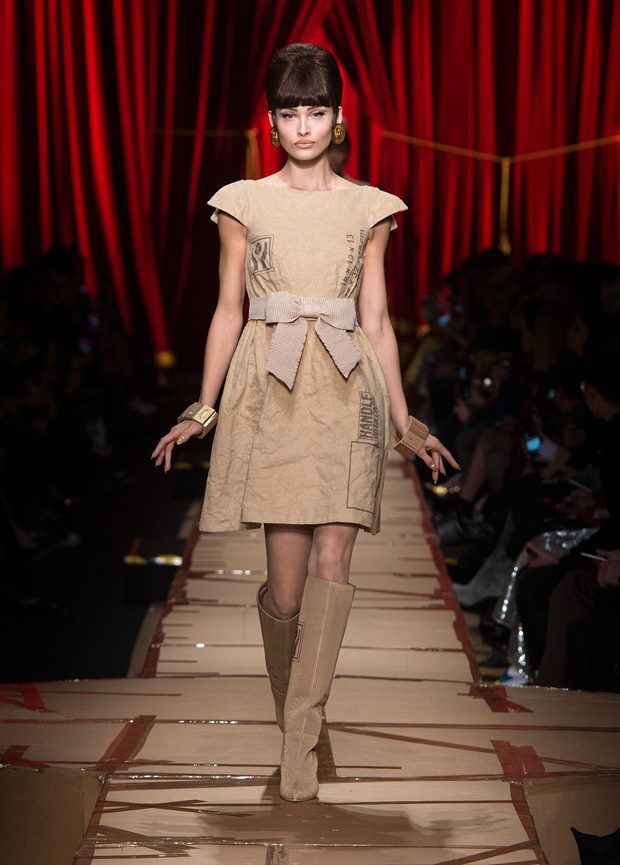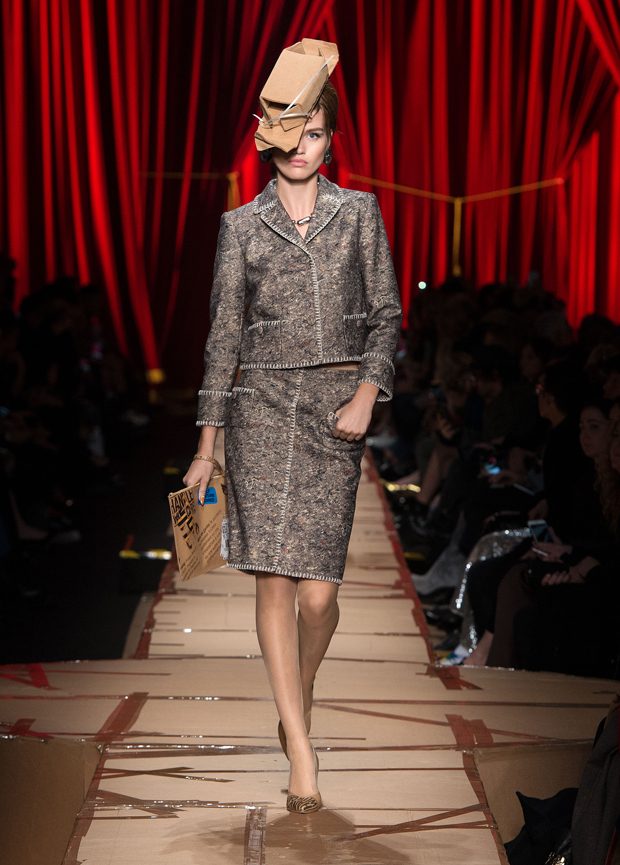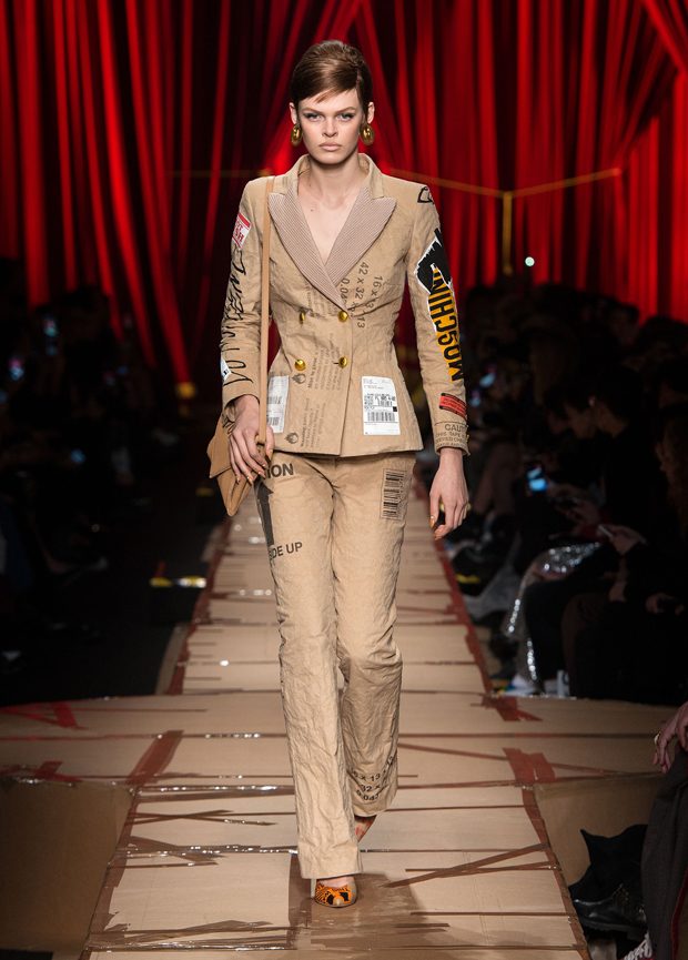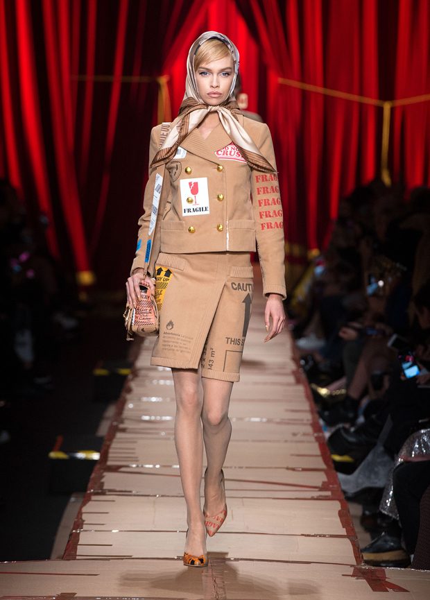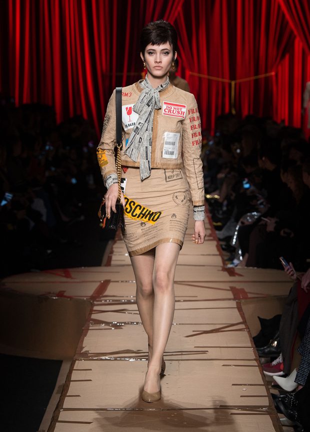 The collection opens with a series of looks we’re calling “Cardboard Couture” – these are uptown-elegant silhouettes for day crafted in what appears to what most people rip open then throw out when their online orders arrive: packaging! “Fragile” stickers, “This Way Up” stamps, “Do Not Crush” warnings, duct tape trims and tracking dockets provide the functional equivalent to floral on Scott’s special delivery pieces. Her oeuvre extend from cardboard into a soignee skirt suit and off-color camel coat hewn in gray packing felt with duct tape accents, to a skirt of frayed newsprint fringe, and looks in boldly opaque bubble-wrap. – from Moschino