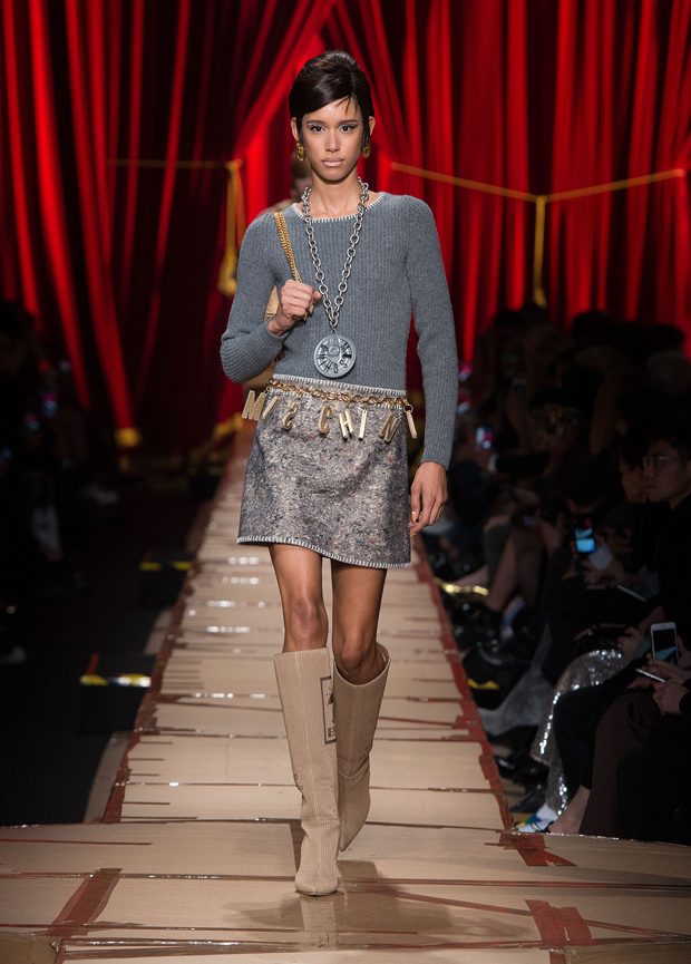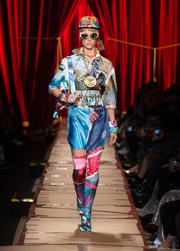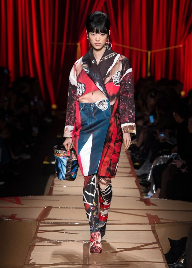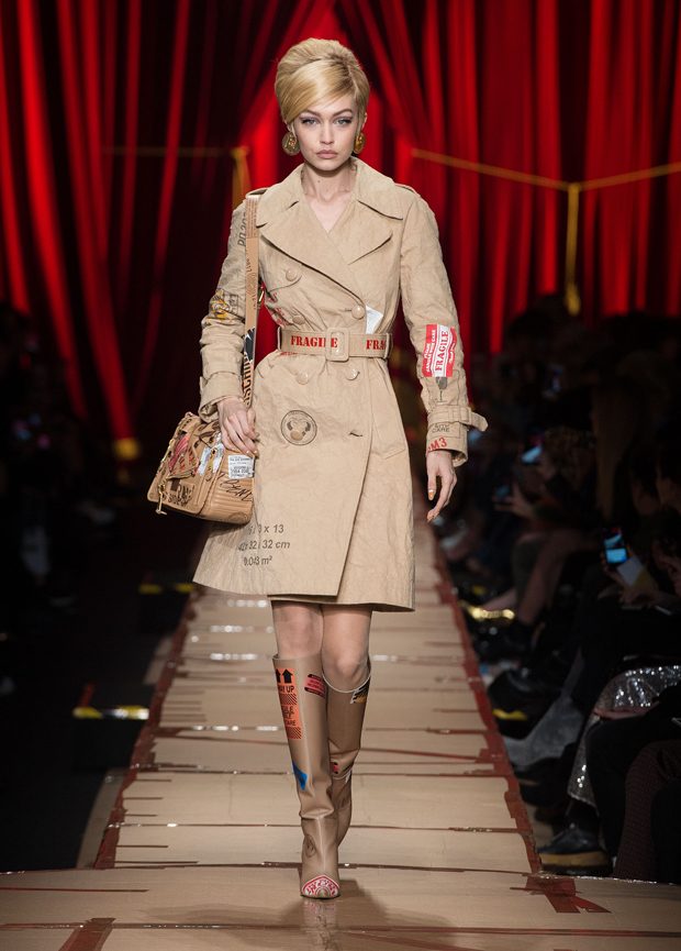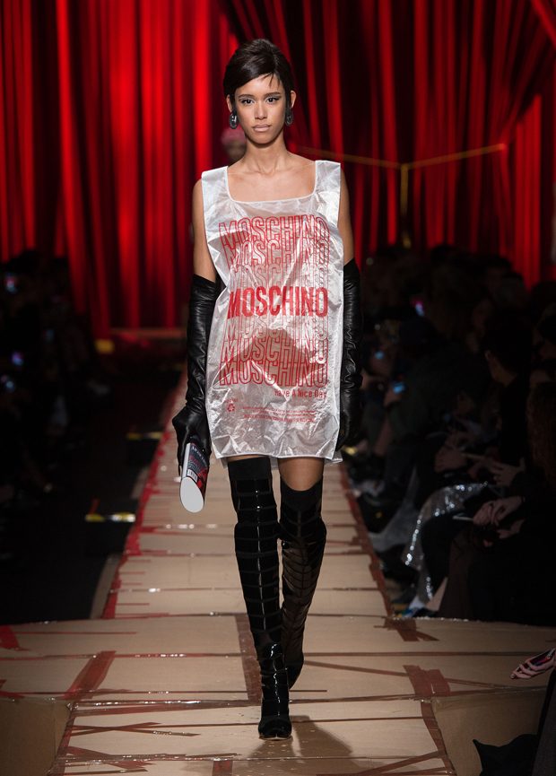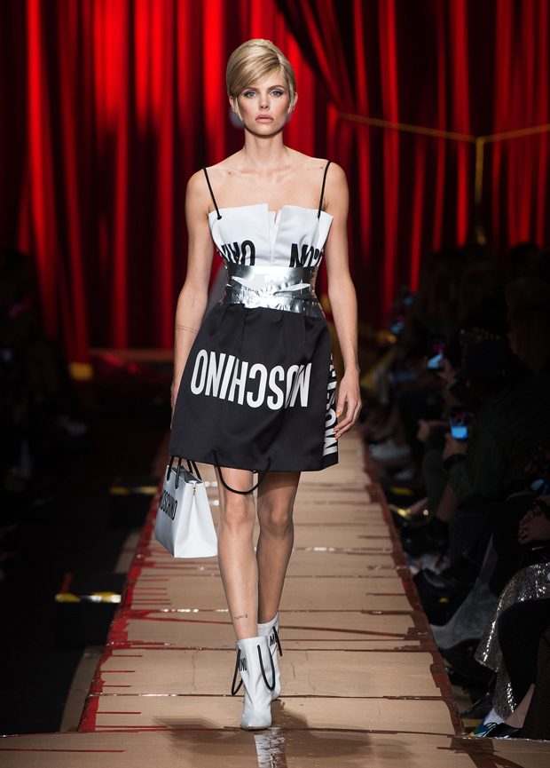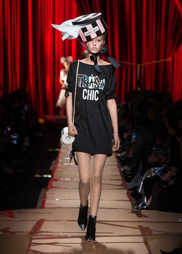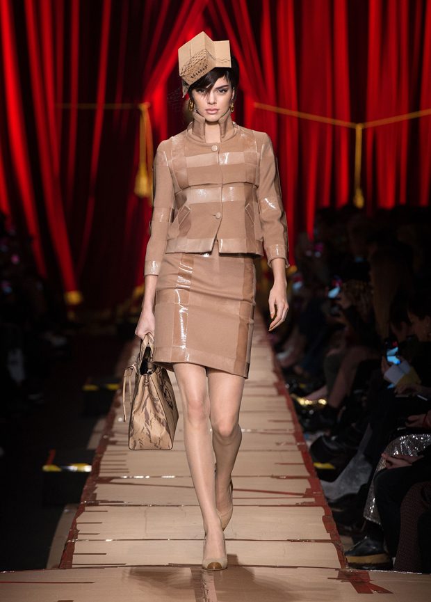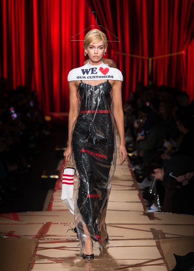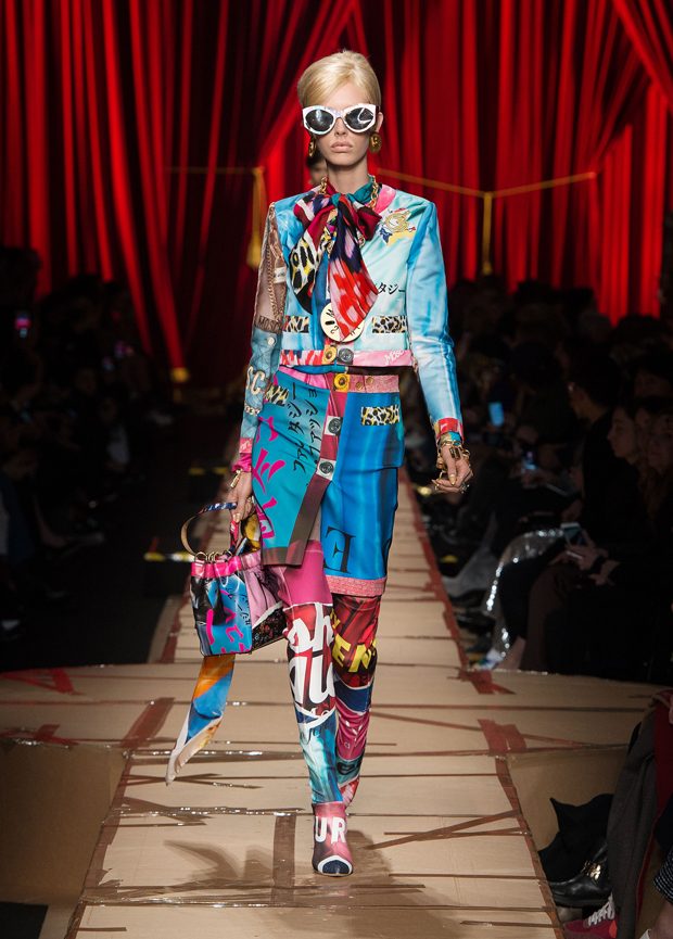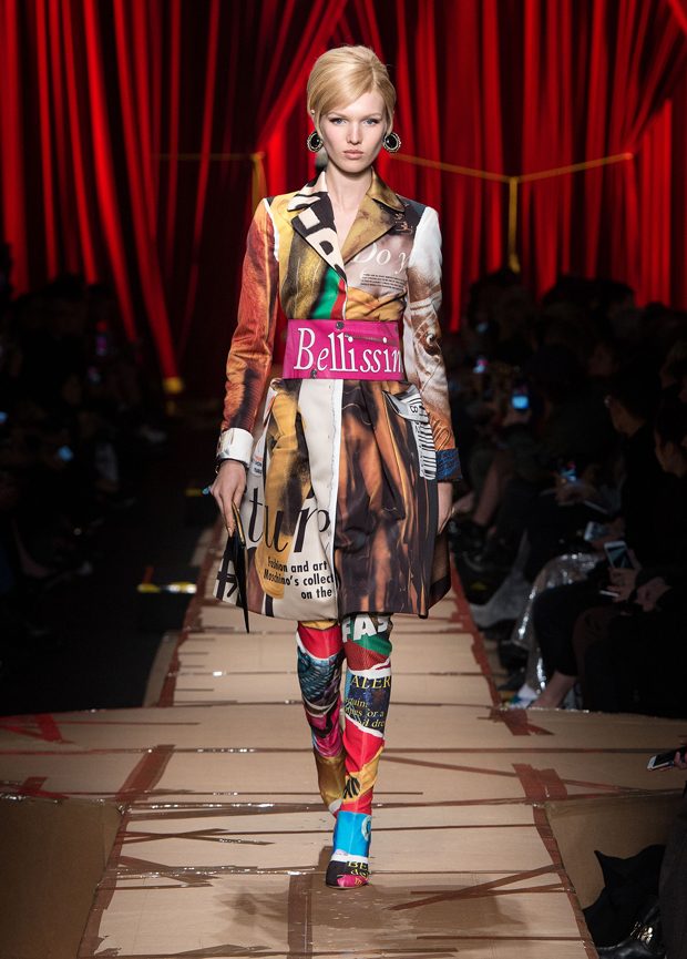 The collection opens with a series of looks we’re calling “Cardboard Couture” – these are uptown-elegant silhouettes for day crafted in what appears to what most people rip open then throw out when their online orders arrive: packaging! “Fragile” stickers, “This Way Up” stamps, “Do Not Crush” warnings, duct tape trims and tracking dockets provide the functional equivalent to floral on Scott’s special delivery pieces. Her oeuvre extend from cardboard into a soignee skirt suit and off-color camel coat hewn in gray packing felt with duct tape accents, to a skirt of frayed newsprint fringe, and looks in boldly opaque bubble-wrap. – from Moschino