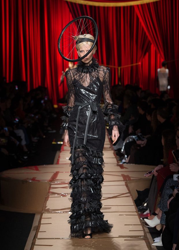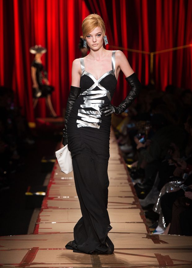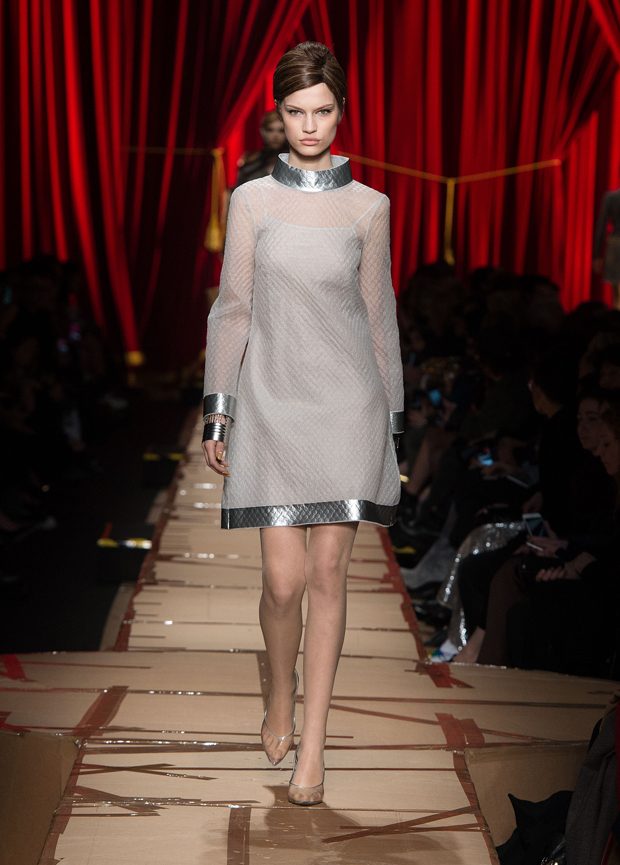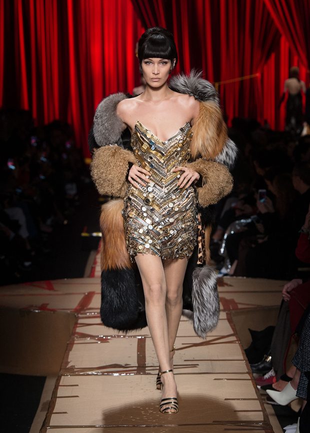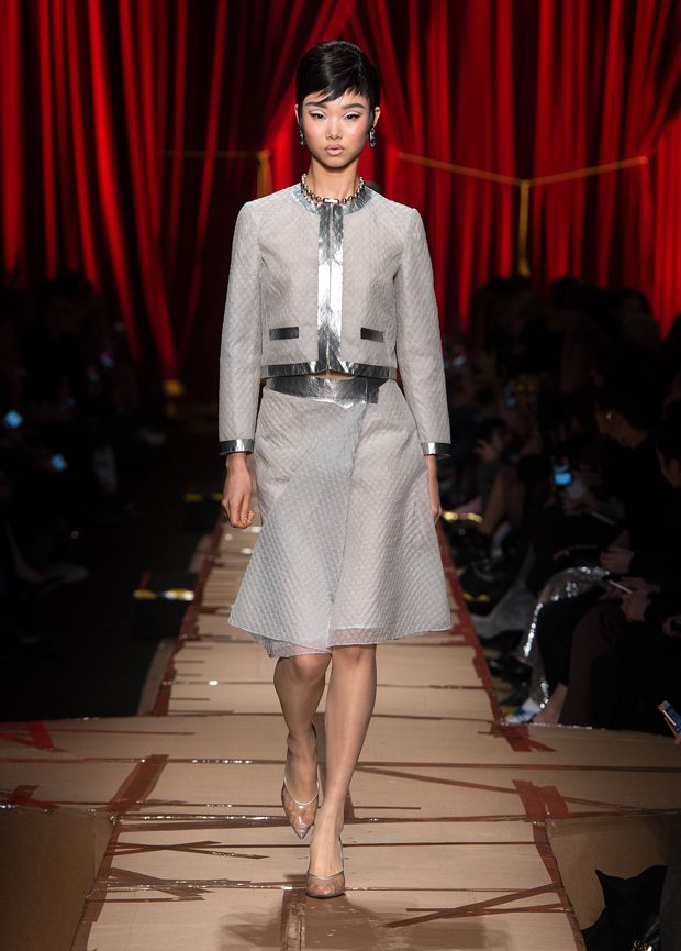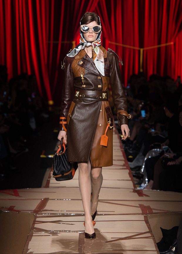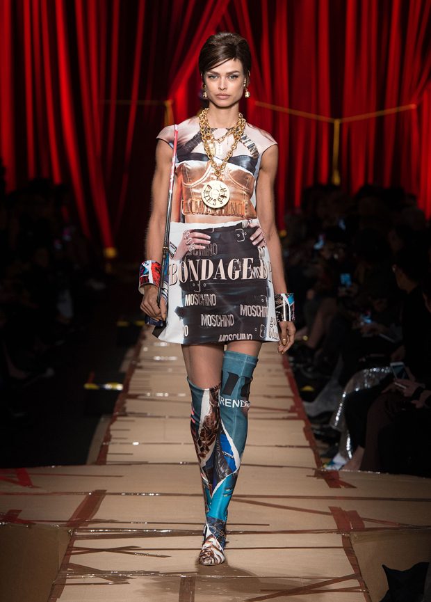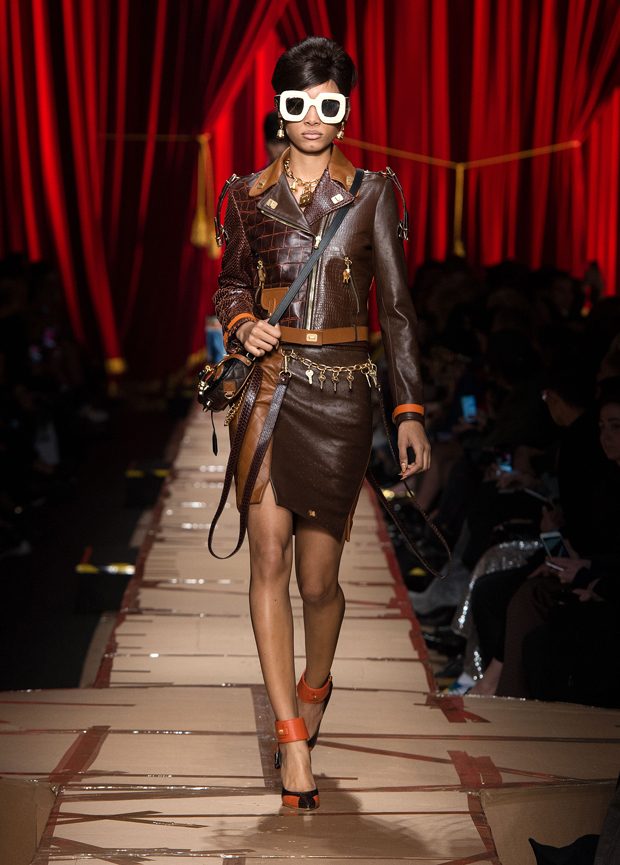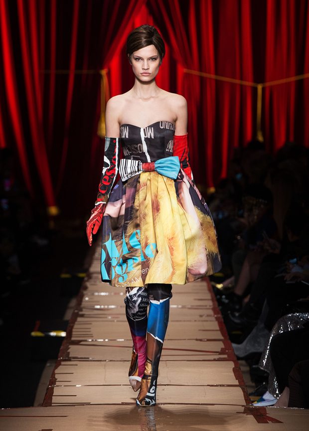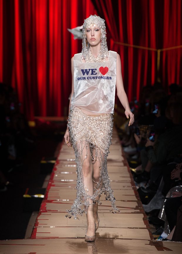 The collection opens with a series of looks we’re calling “Cardboard Couture” – these are uptown-elegant silhouettes for day crafted in what appears to what most people rip open then throw out when their online orders arrive: packaging! “Fragile” stickers, “This Way Up” stamps, “Do Not Crush” warnings, duct tape trims and tracking dockets provide the functional equivalent to floral on Scott’s special delivery pieces. Her oeuvre extend from cardboard into a soignee skirt suit and off-color camel coat hewn in gray packing felt with duct tape accents, to a skirt of frayed newsprint fringe, and looks in boldly opaque bubble-wrap. – from Moschino