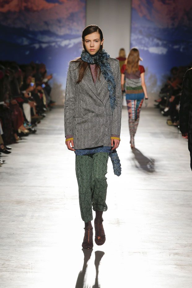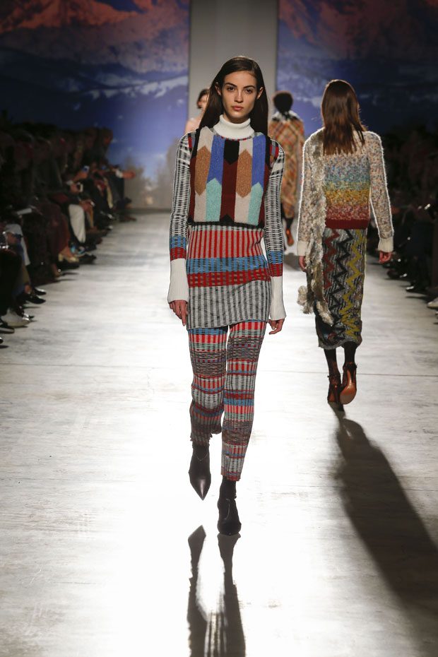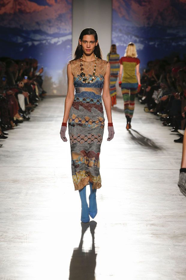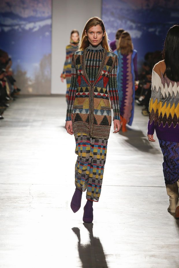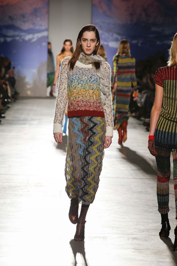 Each individual garment—from long, narrow single-breasted coats to snug or oversized pullovers; from long, loose-fitting cardigans to short, boxy blazers; from linear dresses to straight skirts and ribbed trousers; long, sleeveless evening wear to maxi sweaters worked by hand—becomes a demonstration of both art and craftsmanship. A statement on the versatility and permutability of a fashion that designs and redesigns itself on the body of each individual woman; exalting her personal uniqueness and style. Accentuating the refinement of each look, Missoni presents elegant elongated, pointed-toe kitten heels in calfskin or suede, single-tone knit stockings, and multicolored stone necklaces with silver and aluminum hook closures reminiscent of archeological findings. – from Missoni