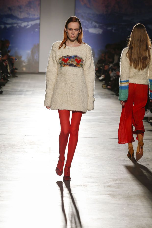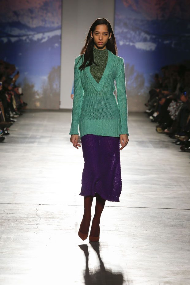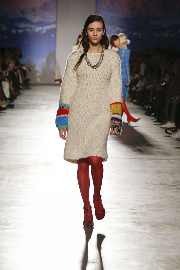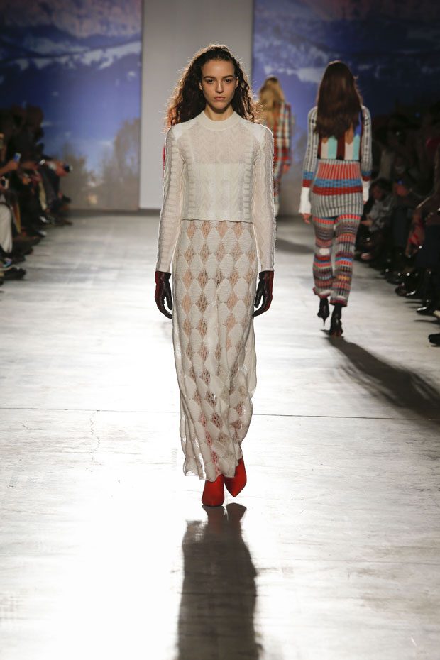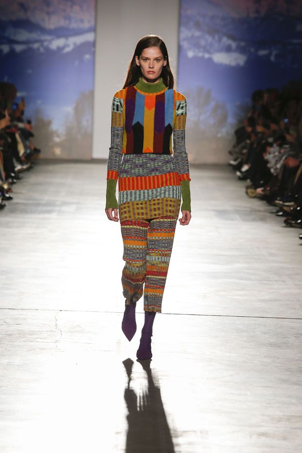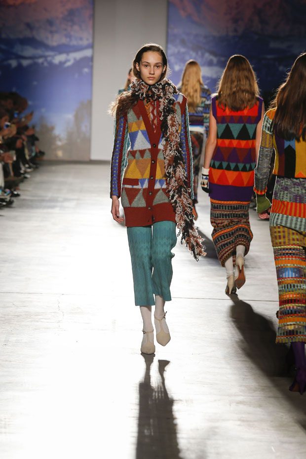 Each individual garment—from long, narrow single-breasted coats to snug or oversized pullovers; from long, loose-fitting cardigans to short, boxy blazers; from linear dresses to straight skirts and ribbed trousers; long, sleeveless evening wear to maxi sweaters worked by hand—becomes a demonstration of both art and craftsmanship. A statement on the versatility and permutability of a fashion that designs and redesigns itself on the body of each individual woman; exalting her personal uniqueness and style. Accentuating the refinement of each look, Missoni presents elegant elongated, pointed-toe kitten heels in calfskin or suede, single-tone knit stockings, and multicolored stone necklaces with silver and aluminum hook closures reminiscent of archeological findings. – from Missoni