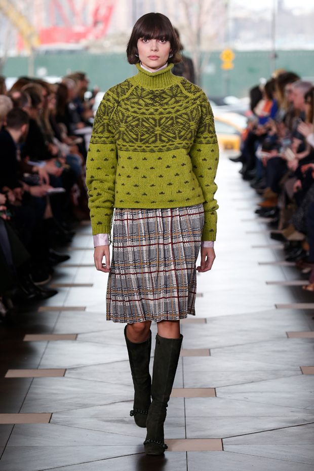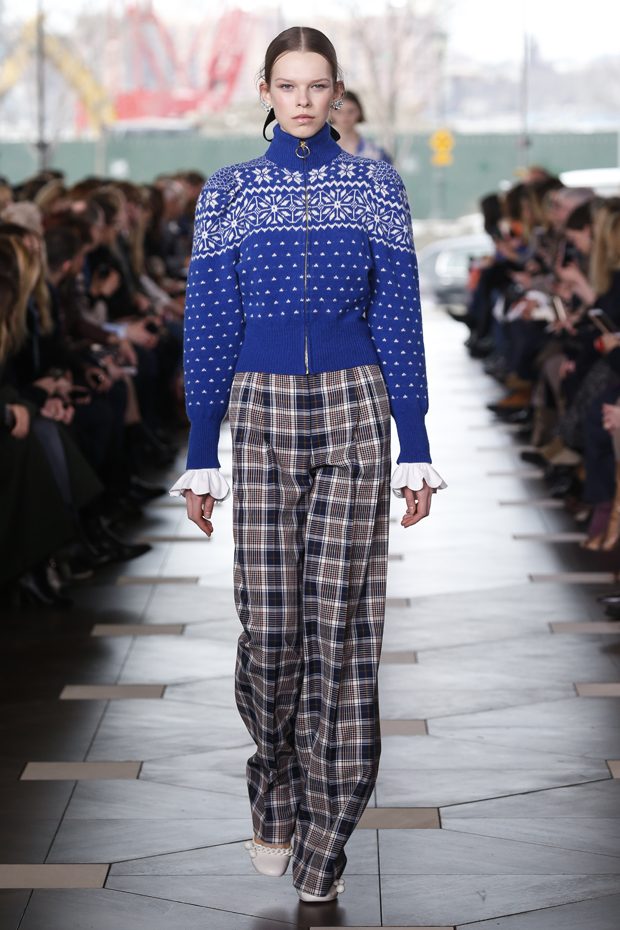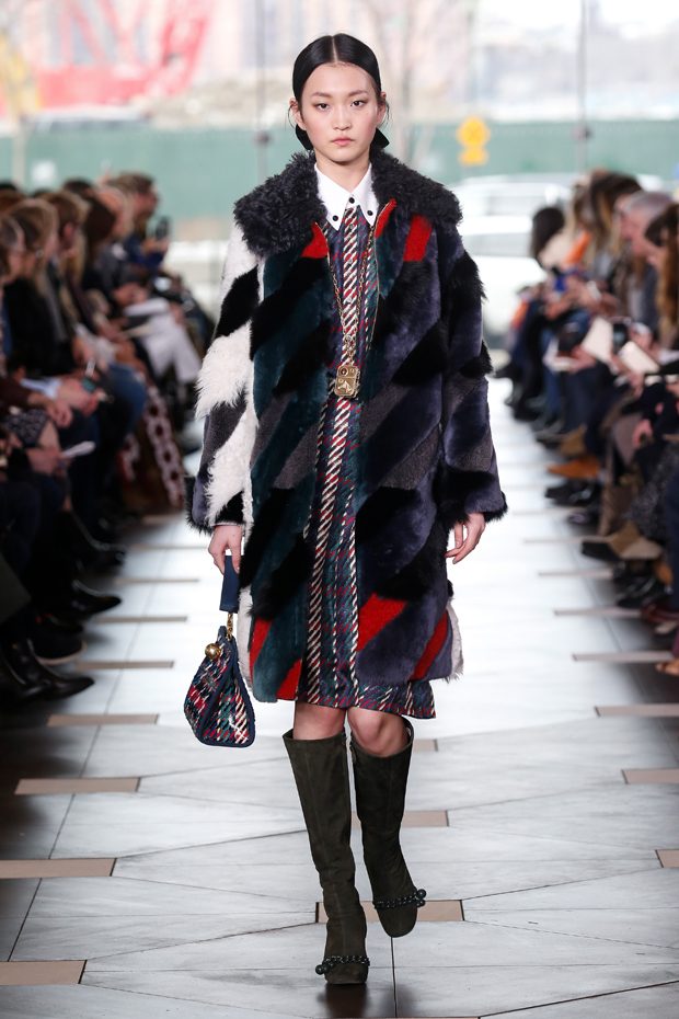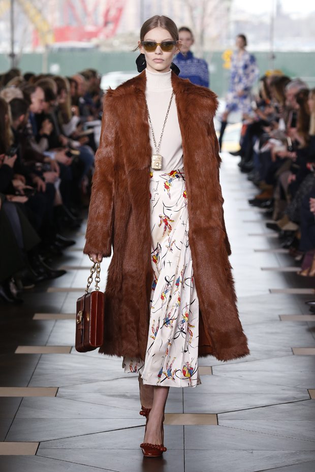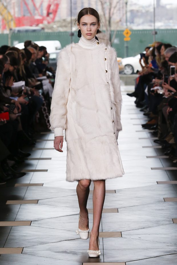 For Fall/Winter 2017, we found inspiration in the fearlessness and irreverence of Katharine Hepburn’s character in The Philadelphia Story. Her outdoor glamour combined with a confident femininity creates a modern take on the familiar style of my own roots in Philadelphia. We played with the idea of Fair Isle knits, barn jackets and winter whites and thought about contrast, creating variations on a theme: plaid tweeds, prints and enlarged in shearling. Accessories complete the story, from bow shoes and soft men’s briefcases to a pendant necklace inspired by my father’s cigarette lighter. – Tory Burch
