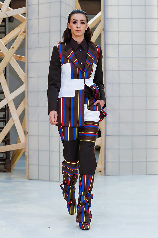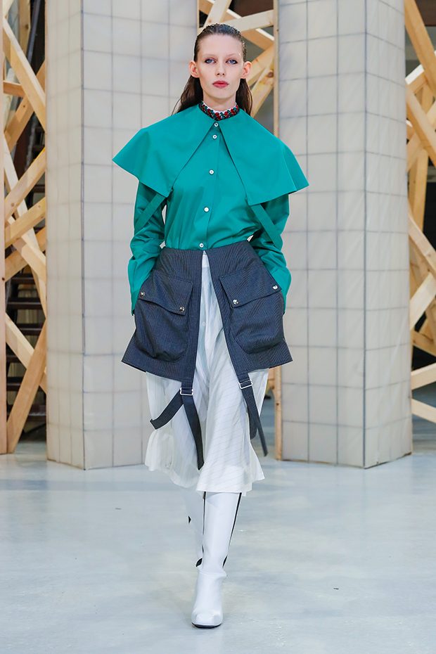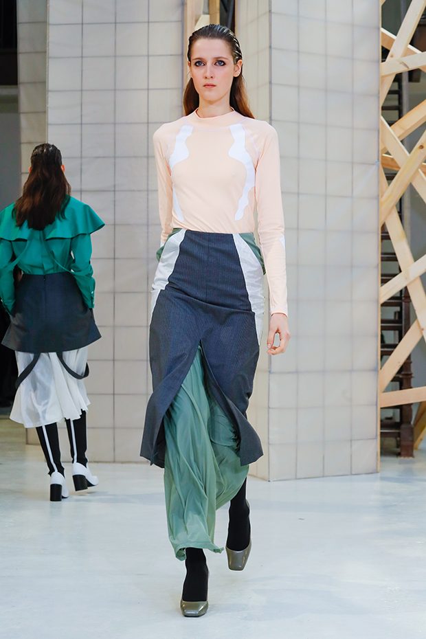 AALTO establishes a parallel between liberal freethinking, feminism and ancient, secret societies, such as freemasonry, who through the use of complex symbols and rituals have established a structured belief system that fuses nature, science and mysticism. Merging resistance, subculture, fantasy and an inclusive reality AALTO draws on this symbolism to create uniforms for the yet to be born travelers, and the next generation of great explorers, and resilient women who navigate their own course, seen in the airbrushed fantasy prints within the collection.?The collection’s vision of the future has echoes of Blade Runner juxtaposing the old and with the new; creating a quasi-chaotic aesthetic, as opposed to a future that is sterile and dehumanized as seen in Gattaca, another film that has had a strong influence on the collection. – from Aalto