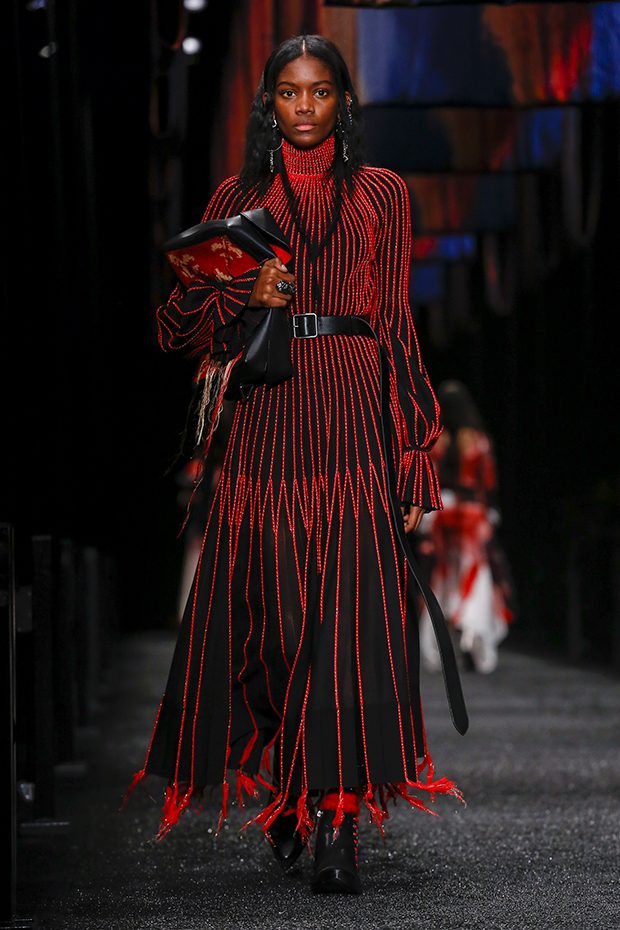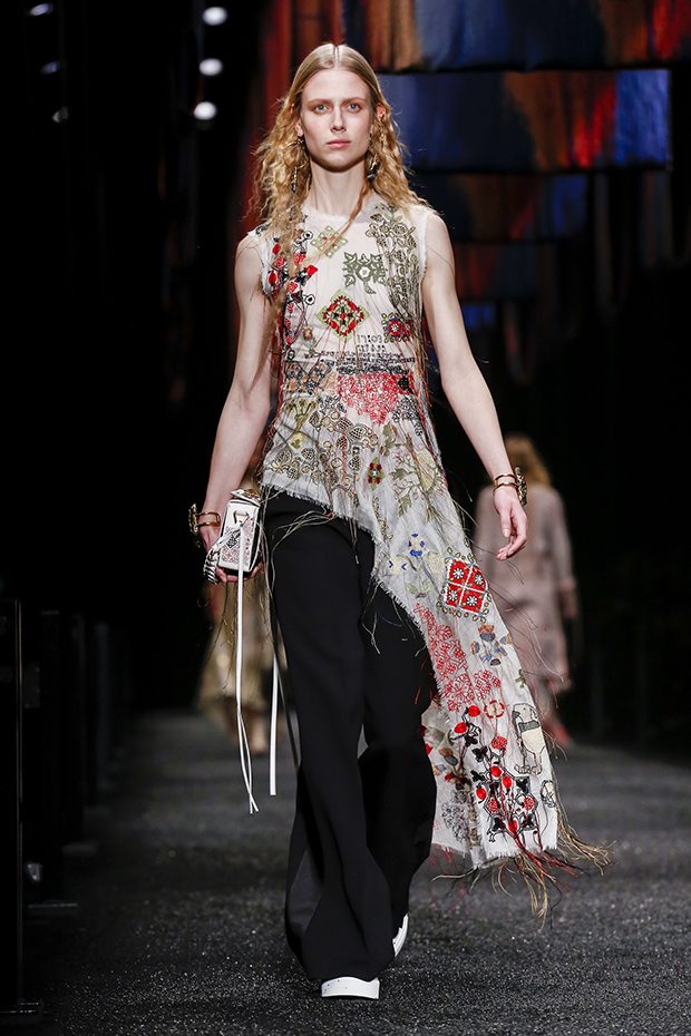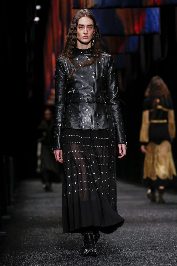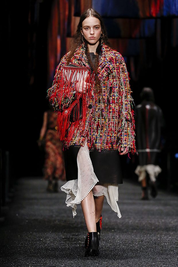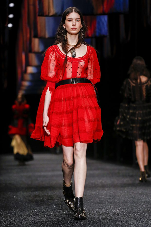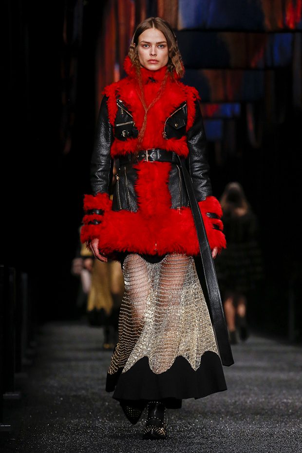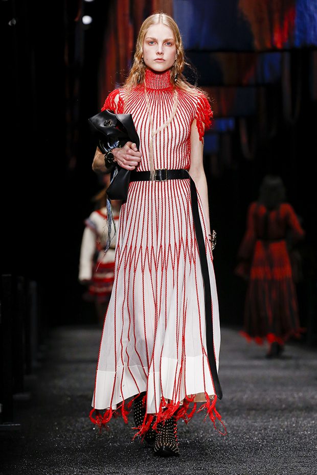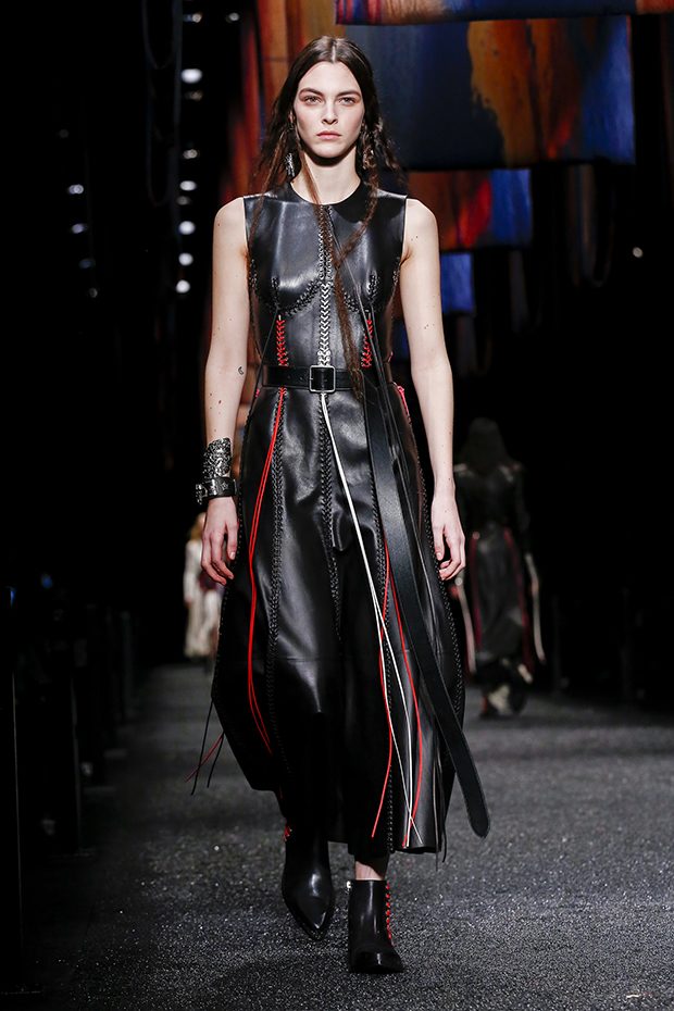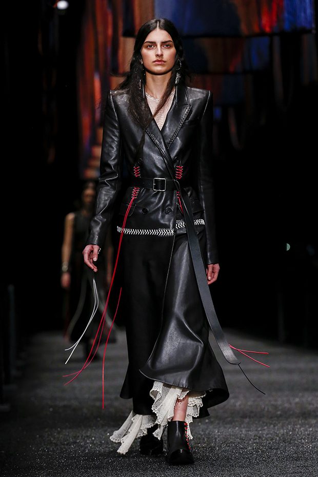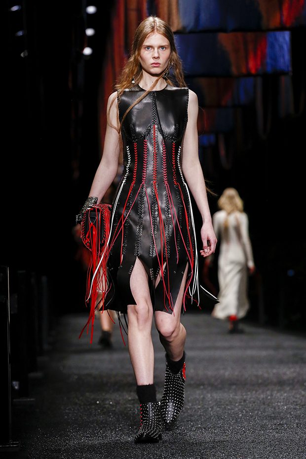 A fluid, elongated silhouette dominates. Edges are often kept raw. Medieval armour deconstructed and reinvented in their softest incarnations. Patch and pieced work, cross-stitching and naïve embroideries of flora and fauna – curative herbs, wild strawberries, English meadow flowers, baby deer and hares make their way across pashmina weight cashmere. Gold and silver eyelets with trailing coloured lacing, resembling the ‘Cloutie’ ribbons, are applied in a feminine way on delicate engineered knits and washed leathers. The ‘Wishing Tree’ inspired tweed is shot through with bright coloured twisted yarns and chiffon strips of fuchsia, crimson and lichen green. Tailoring and tuxedos in soft black and grey cashmere felt with a discreet leather edge or draped like blankets around the body are worn with wide-legged trousers. Exploded shearling coat and jacket studded with gold or silver biker hardware elements. – from Alexander McQueen