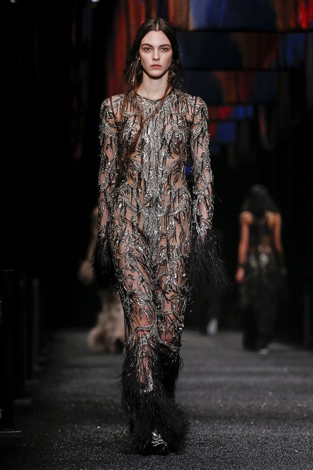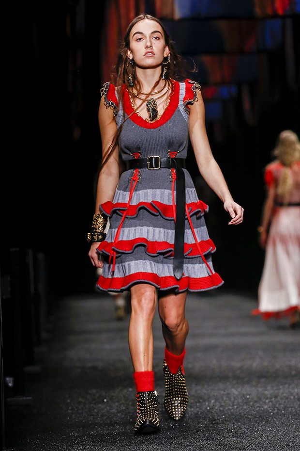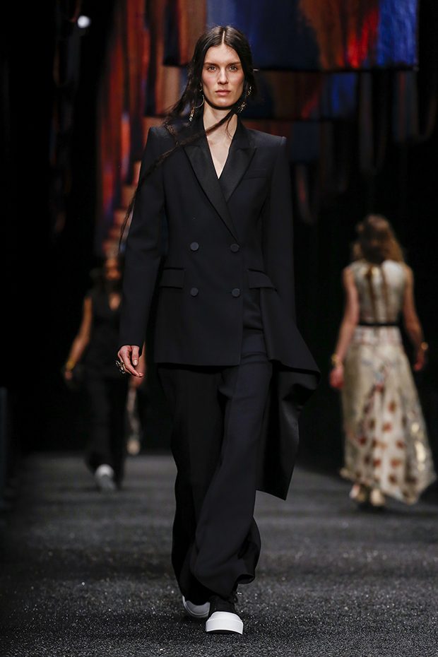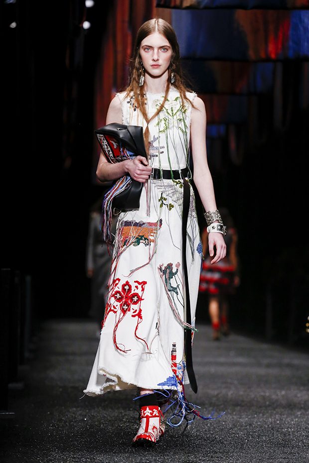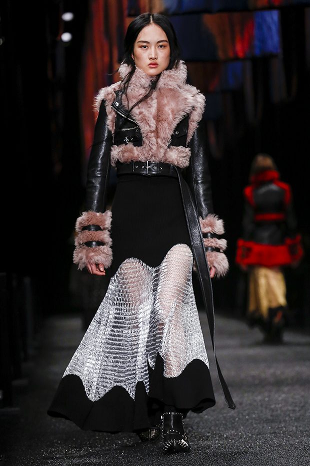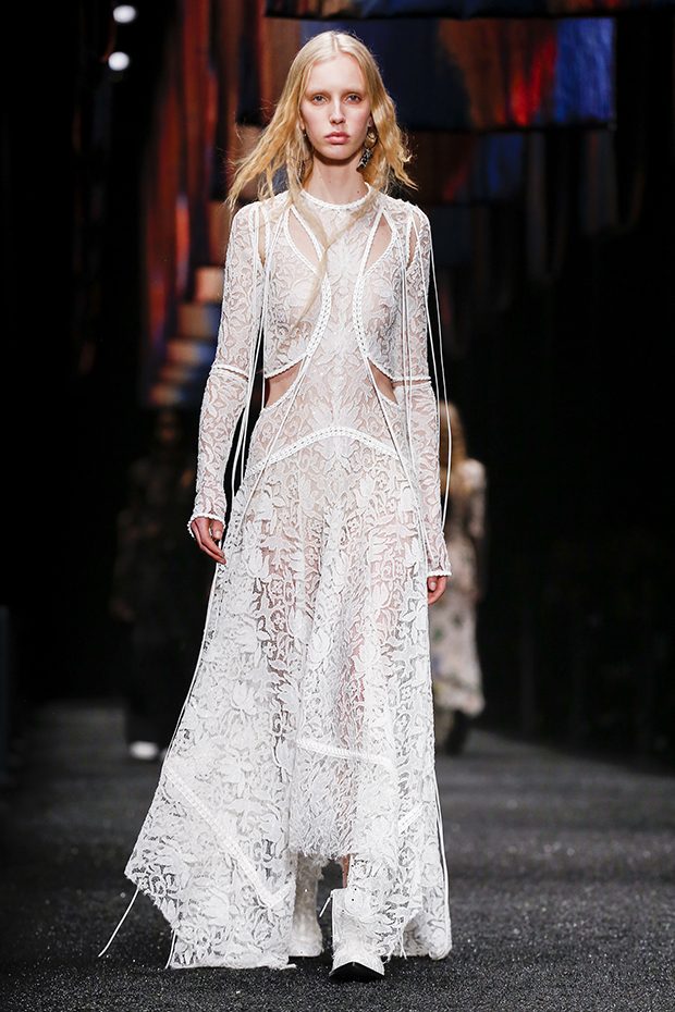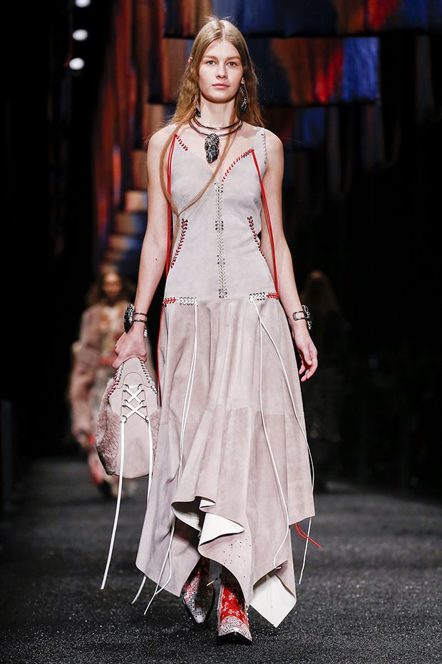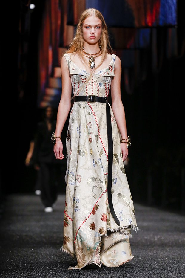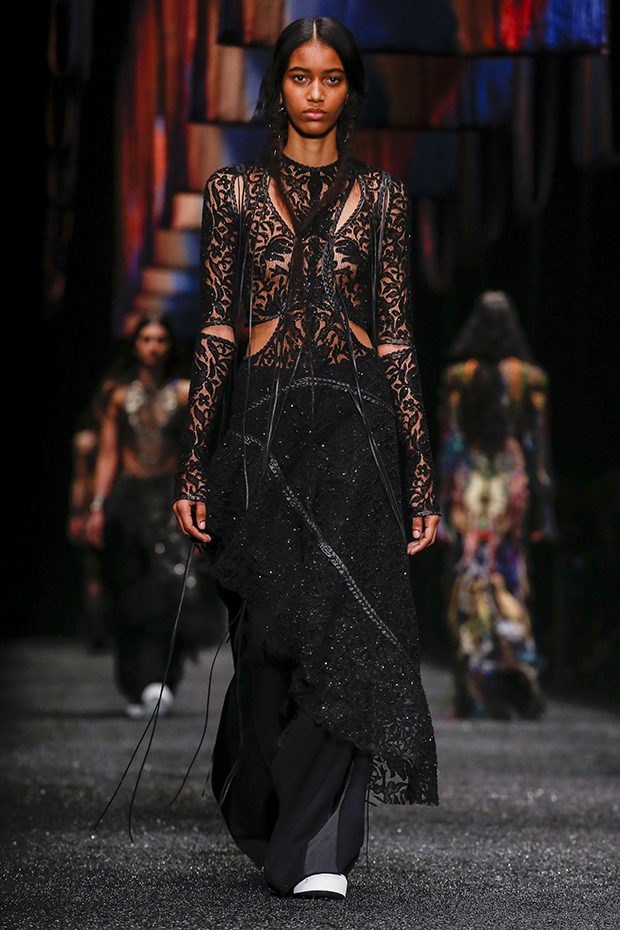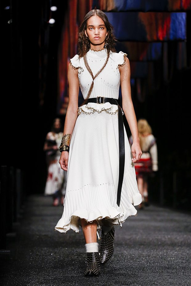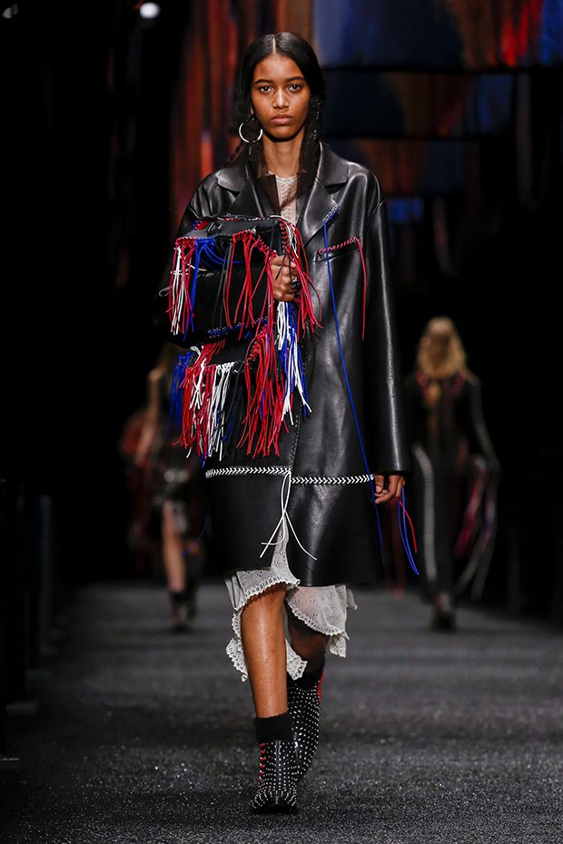 A fluid, elongated silhouette dominates. Edges are often kept raw. Medieval armour deconstructed and reinvented in their softest incarnations. Patch and pieced work, cross-stitching and naïve embroideries of flora and fauna – curative herbs, wild strawberries, English meadow flowers, baby deer and hares make their way across pashmina weight cashmere. Gold and silver eyelets with trailing coloured lacing, resembling the ‘Cloutie’ ribbons, are applied in a feminine way on delicate engineered knits and washed leathers. The ‘Wishing Tree’ inspired tweed is shot through with bright coloured twisted yarns and chiffon strips of fuchsia, crimson and lichen green. Tailoring and tuxedos in soft black and grey cashmere felt with a discreet leather edge or draped like blankets around the body are worn with wide-legged trousers. Exploded shearling coat and jacket studded with gold or silver biker hardware elements. – from Alexander McQueen