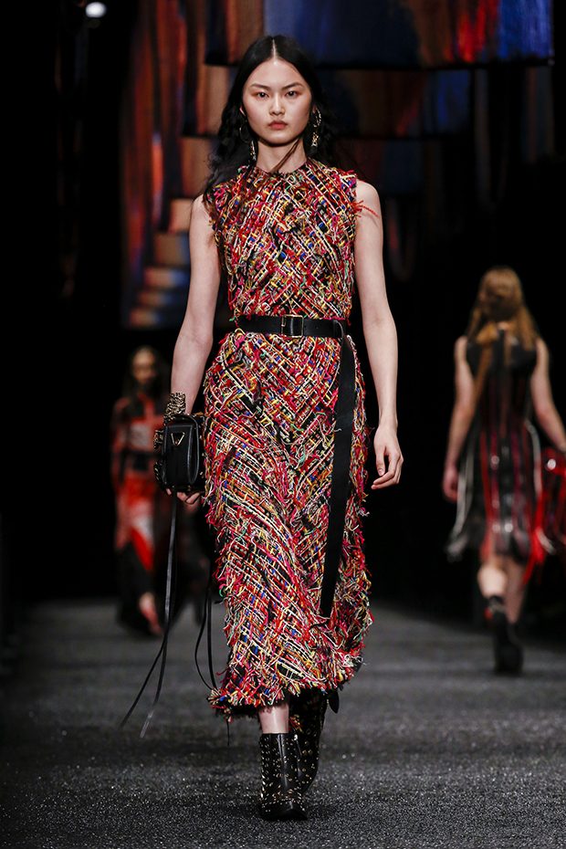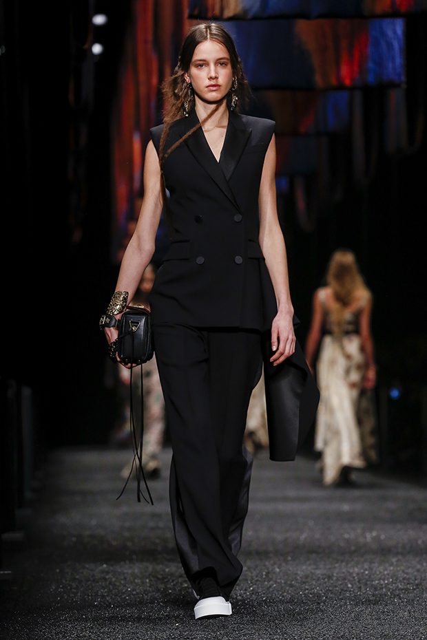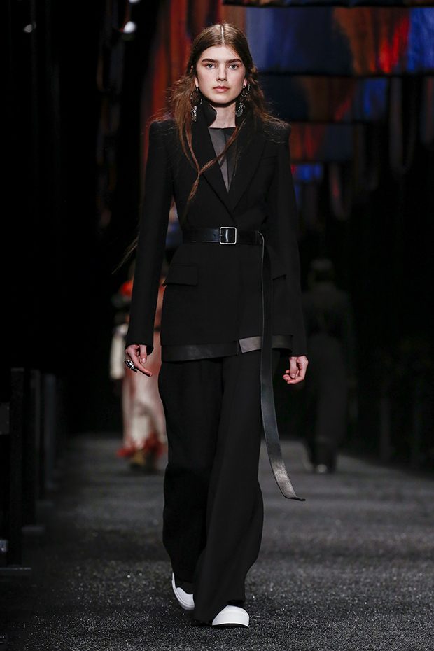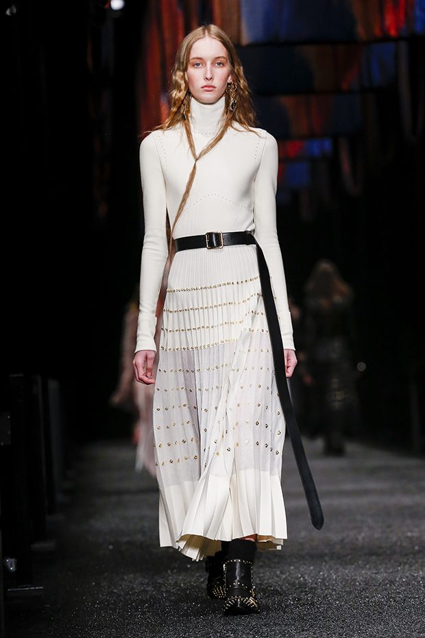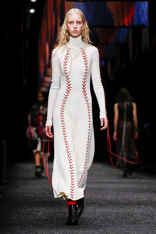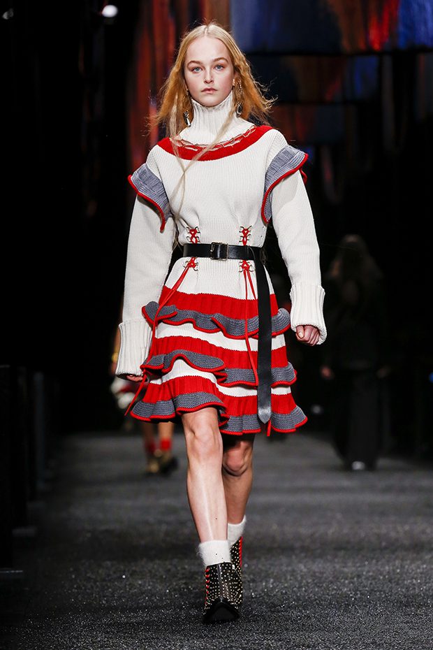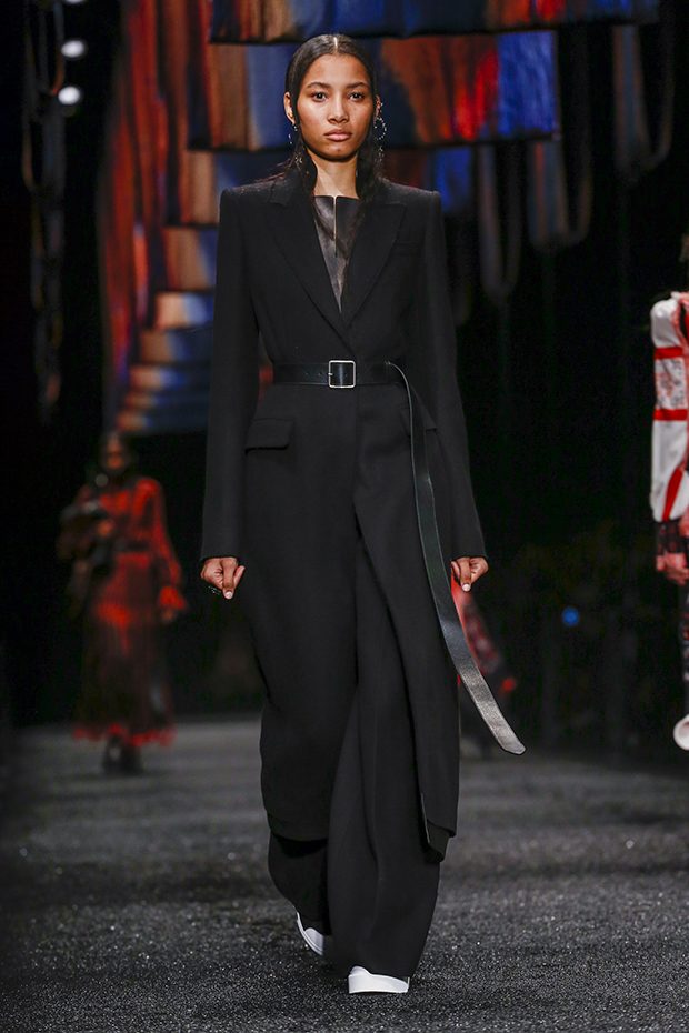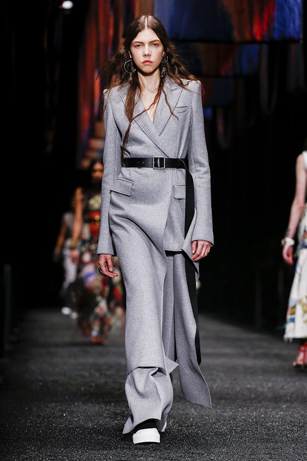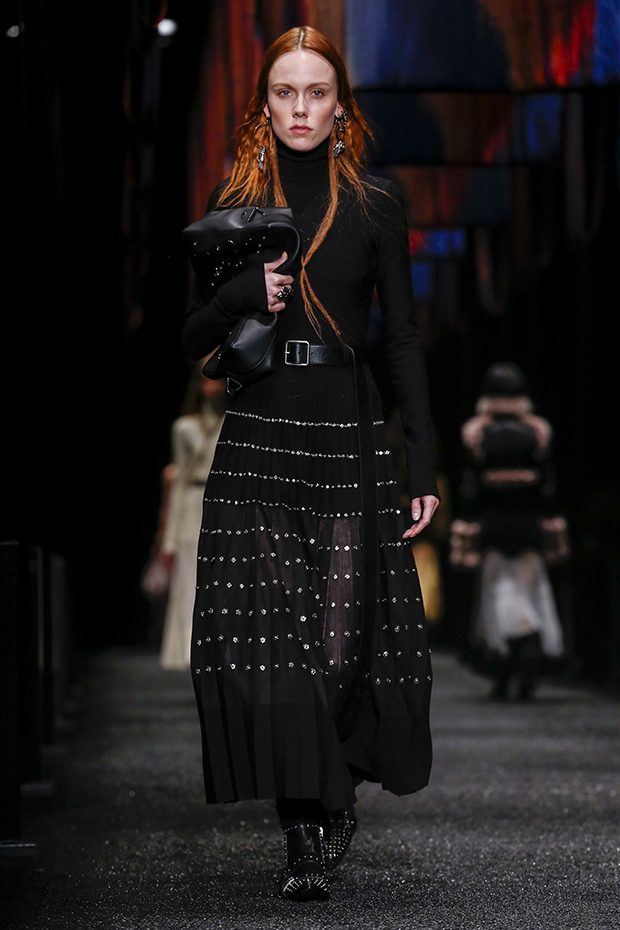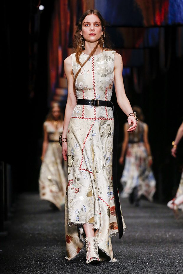 A fluid, elongated silhouette dominates. Edges are often kept raw. Medieval armour deconstructed and reinvented in their softest incarnations. Patch and pieced work, cross-stitching and naïve embroideries of flora and fauna – curative herbs, wild strawberries, English meadow flowers, baby deer and hares make their way across pashmina weight cashmere. Gold and silver eyelets with trailing coloured lacing, resembling the ‘Cloutie’ ribbons, are applied in a feminine way on delicate engineered knits and washed leathers. The ‘Wishing Tree’ inspired tweed is shot through with bright coloured twisted yarns and chiffon strips of fuchsia, crimson and lichen green. Tailoring and tuxedos in soft black and grey cashmere felt with a discreet leather edge or draped like blankets around the body are worn with wide-legged trousers. Exploded shearling coat and jacket studded with gold or silver biker hardware elements. – from Alexander McQueen