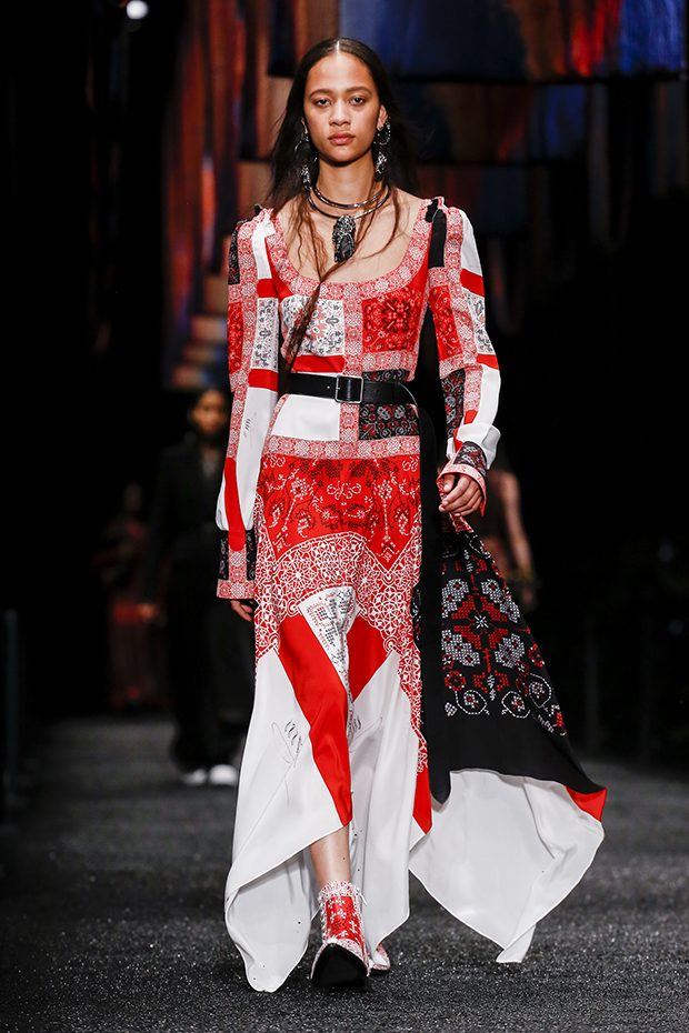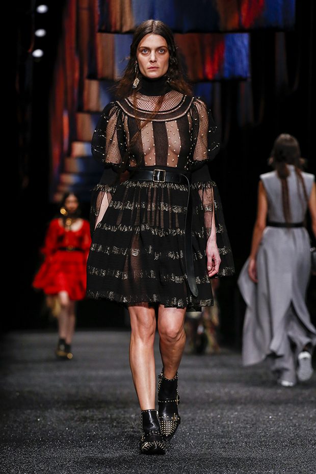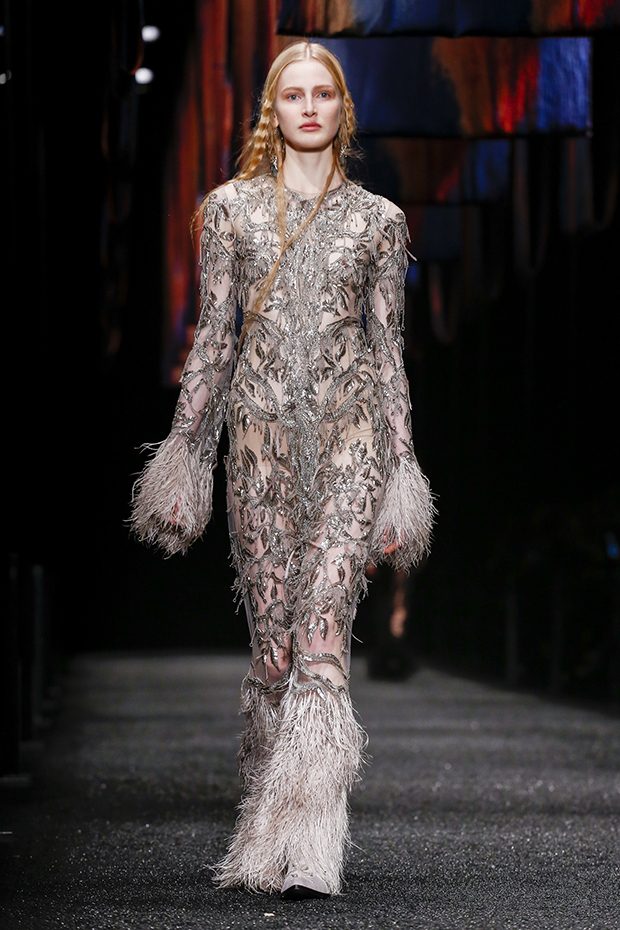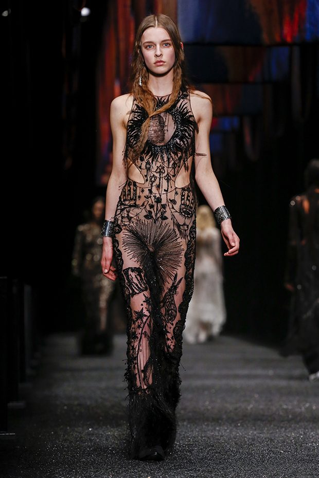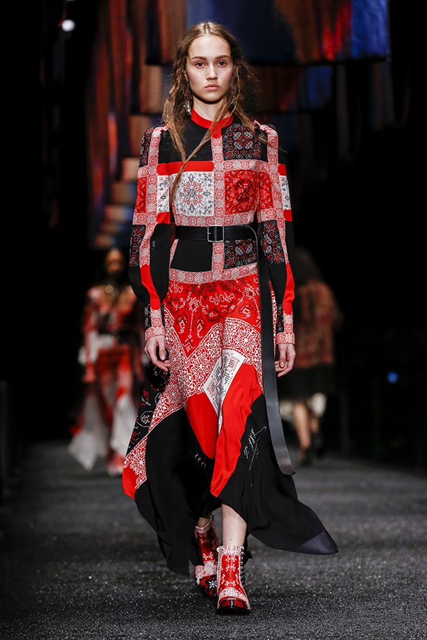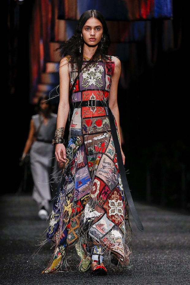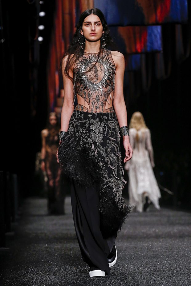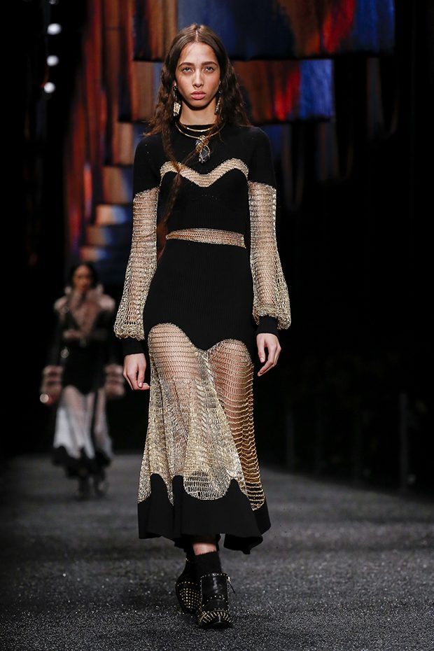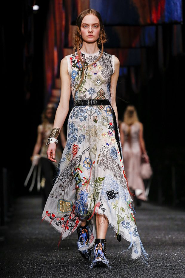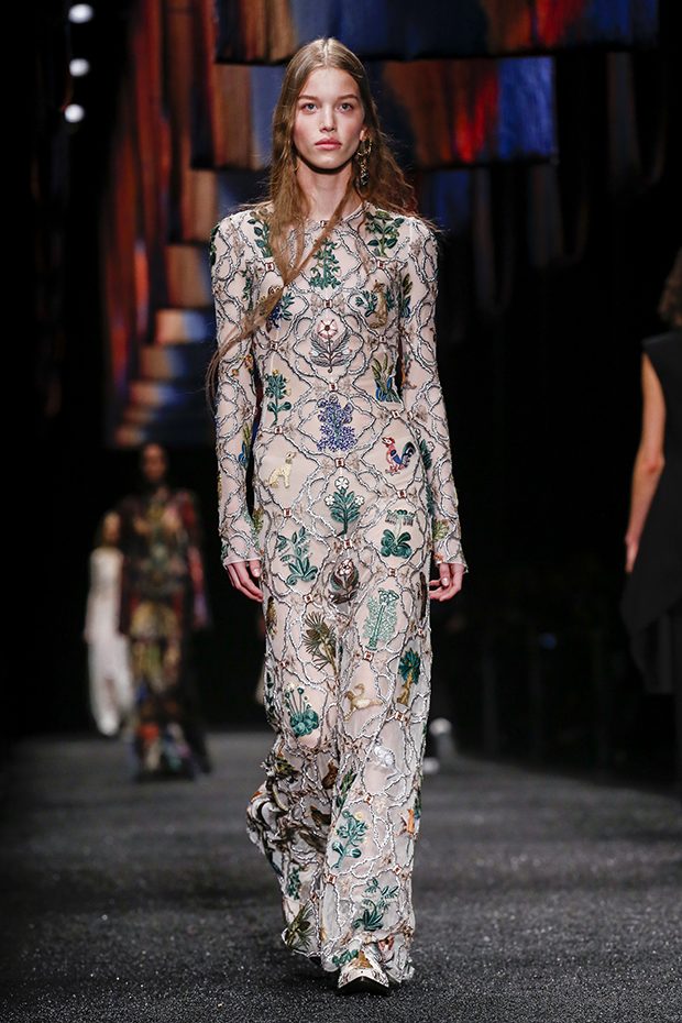 Alexander McQueen presented Autumn Winter 2017/18 collection during the seventh day of the ongoing Paris Fashion Week. Inspired by pagan landscapes, creative communities and ancient traditions of Cornwall, the collection features patch and pieced work, cross-stitching and naïve embroideries of flora and fauna.