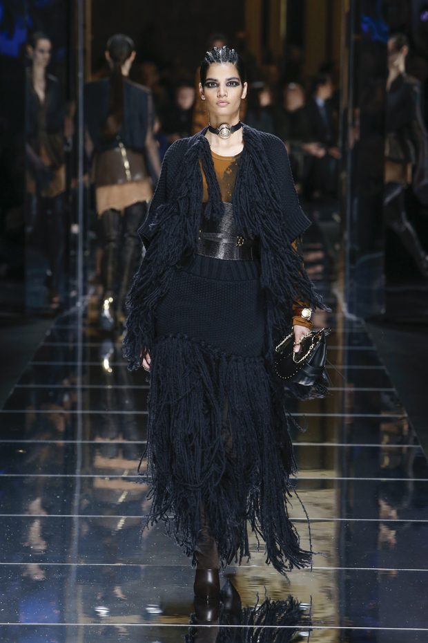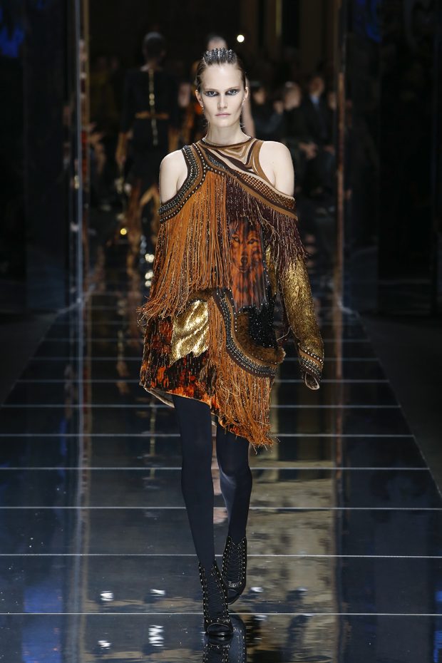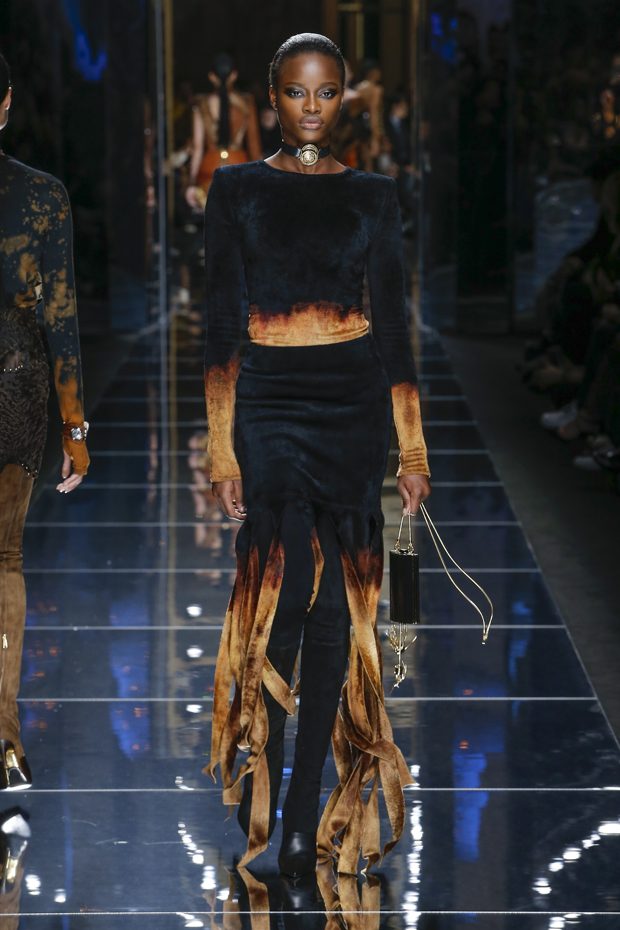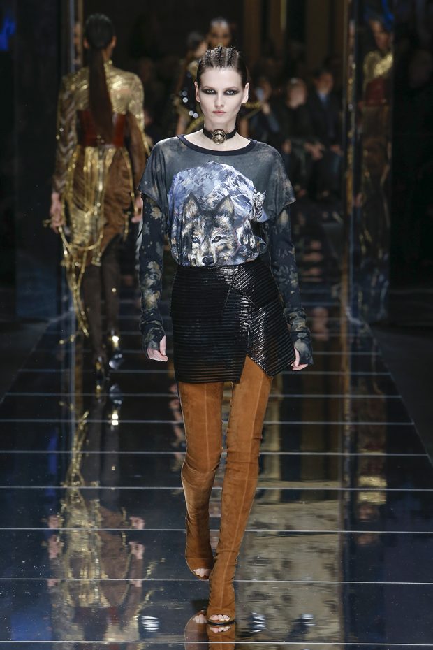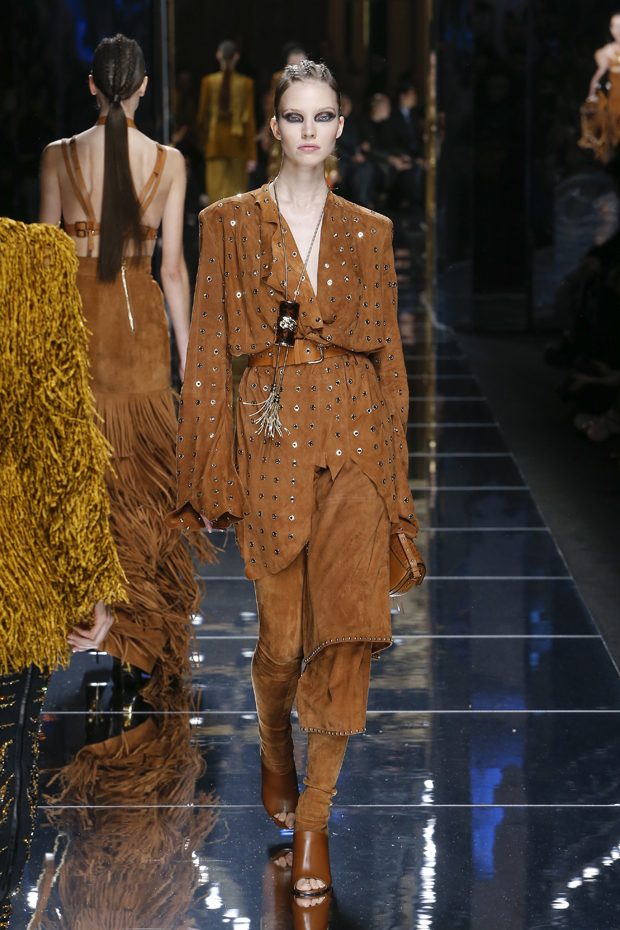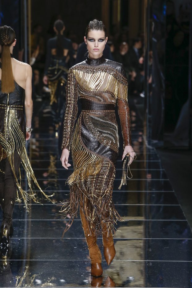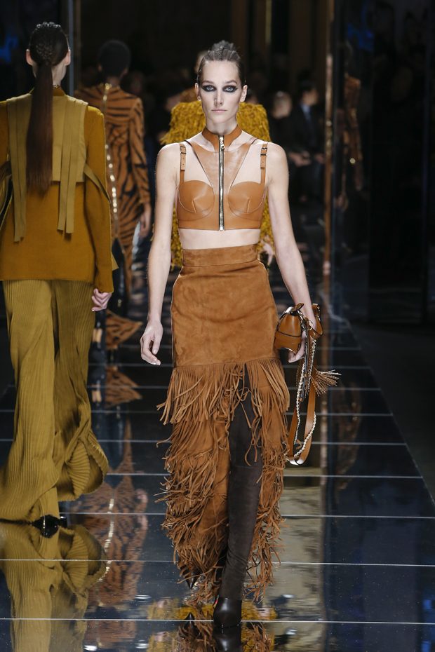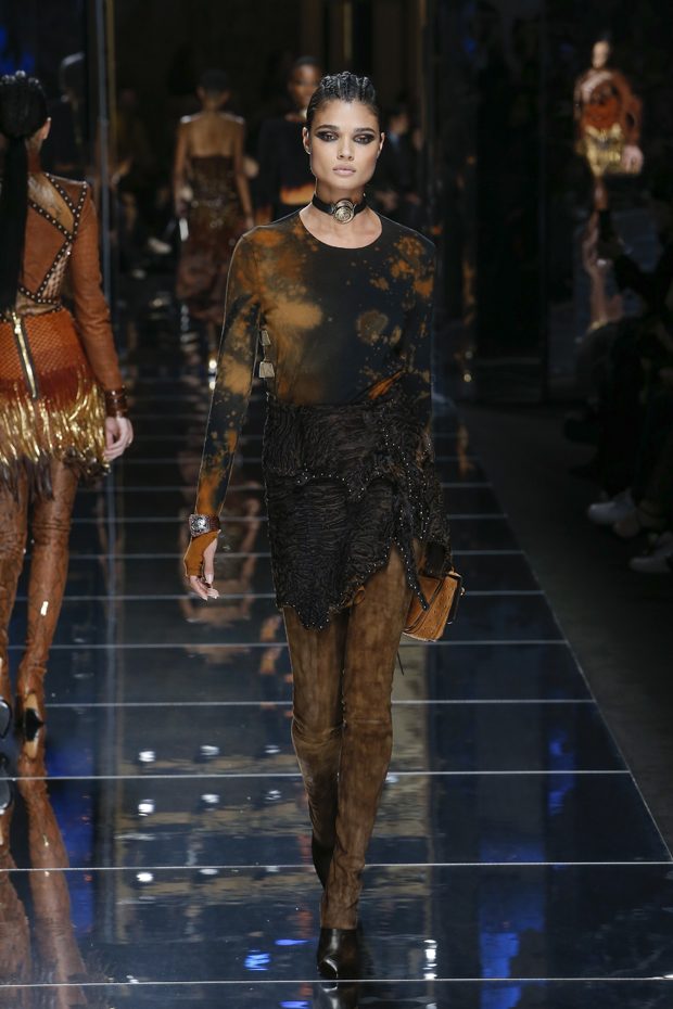 I was just a kid during Nirvana’s heyday, but their powerful music of rebellion definitely marked me then—and continues to resonate with me today. Those liberating lyrics advised us to ignore guidelines of what’s expected and remain true to ourselves. It’s that same mindset that propels today’s strong women as they march down the runway. They’ve embarked on the perfect road trip, picking up influences while traveling across the globe’s most awe-inspiring landscapes—the Serengeti, the Far West, Amazonia. The women of this diverse Balmain army revel in their freedom to celebrate themselves, their beauty and their power. Their impressive inner strength is manifest in this collection’s many animal patterns, prints and illustrations. – Olivier Rousteing