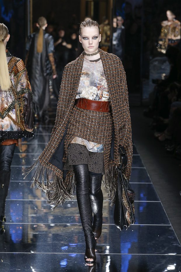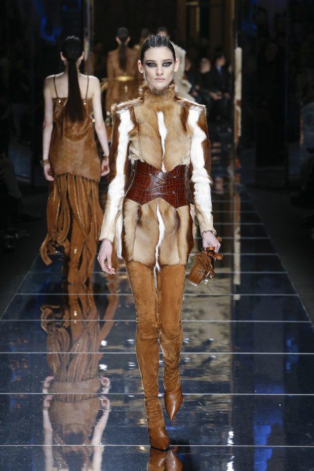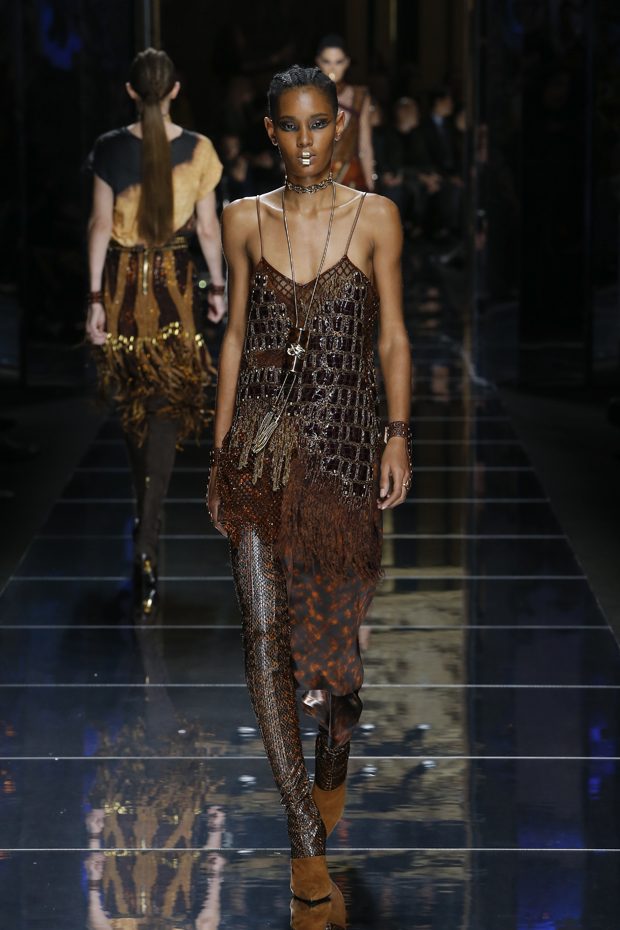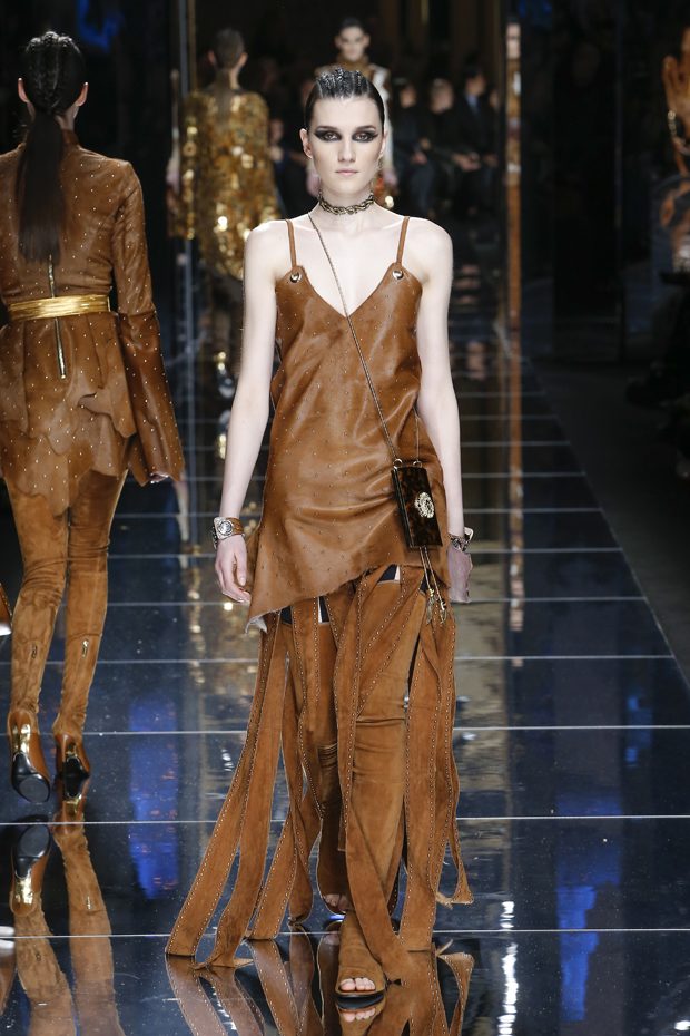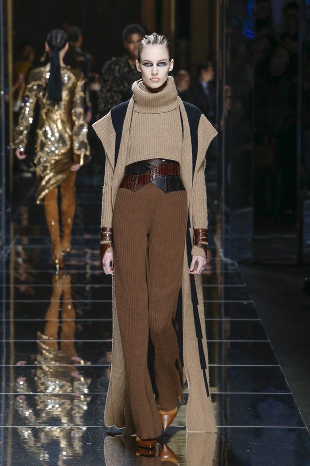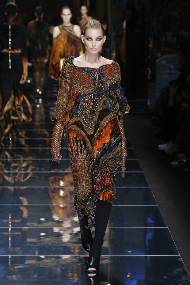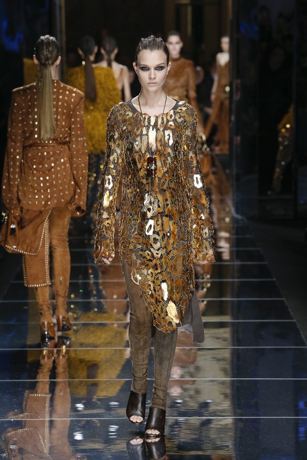 I was just a kid during Nirvana’s heyday, but their powerful music of rebellion definitely marked me then—and continues to resonate with me today. Those liberating lyrics advised us to ignore guidelines of what’s expected and remain true to ourselves. It’s that same mindset that propels today’s strong women as they march down the runway. They’ve embarked on the perfect road trip, picking up influences while traveling across the globe’s most awe-inspiring landscapes—the Serengeti, the Far West, Amazonia. The women of this diverse Balmain army revel in their freedom to celebrate themselves, their beauty and their power. Their impressive inner strength is manifest in this collection’s many animal patterns, prints and illustrations. – Olivier Rousteing